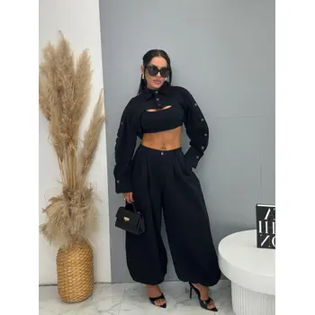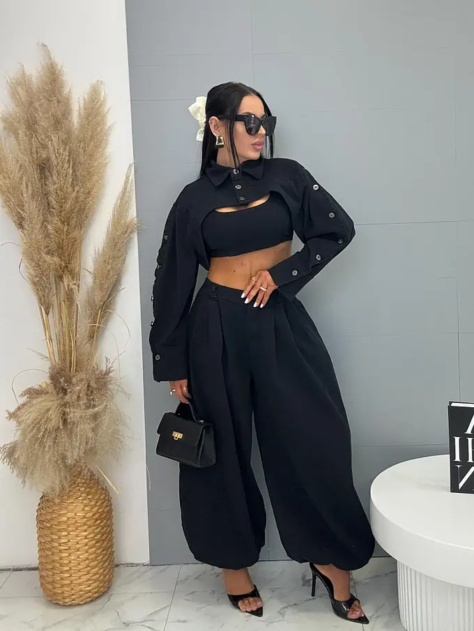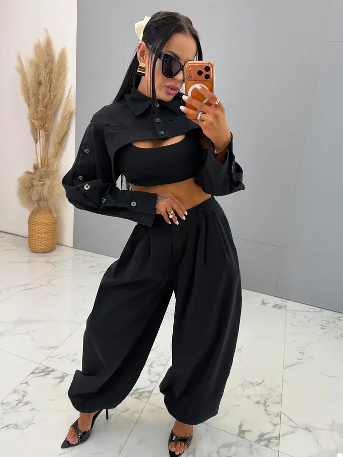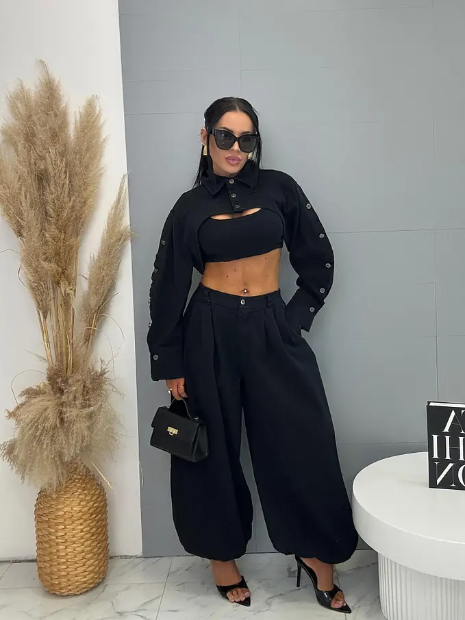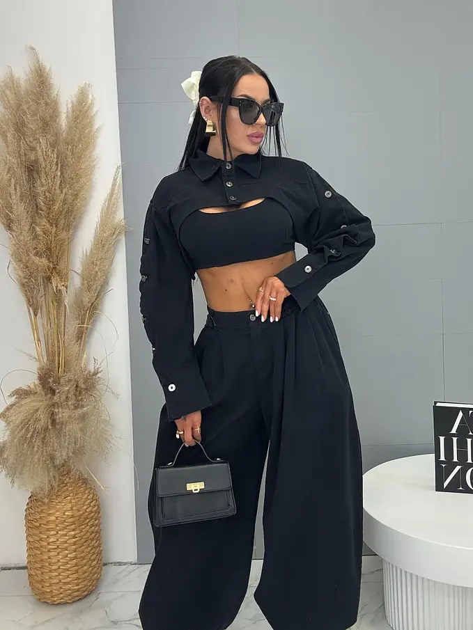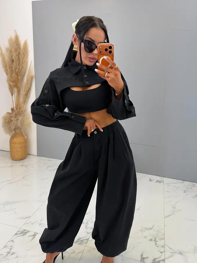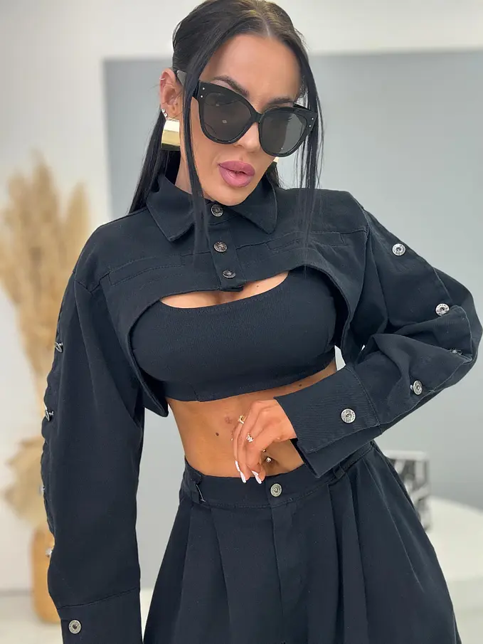 Háromrészes farmer szett közvetlenül Olaszországból, prémium minőségben. Az anyag kellemesen rugalmas. A szett crop topból, kabátból és nadrágból áll. A nadrág magas, rugalmas derékkal rendelkezik, az alja gumis szegéssel zárul, valamint praktikus oldalzsebekkel van ellátva. A crop top hátul cipzárral záródik. A rövid kabát fekete- ezüst gombokkal díszített.