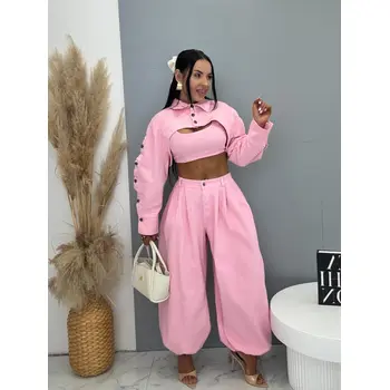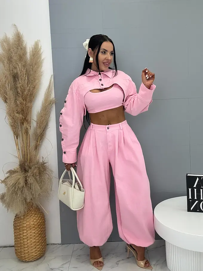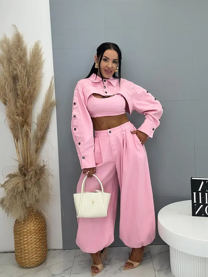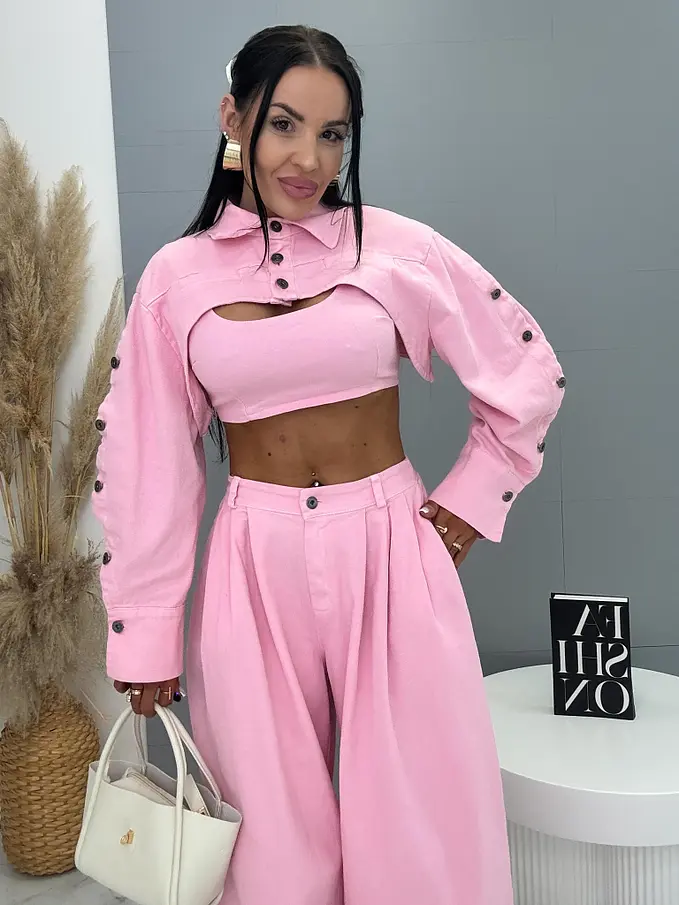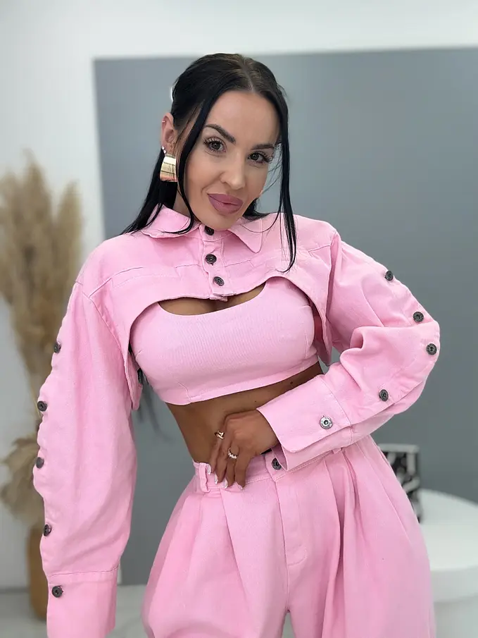 Háromrészes farmer szett közvetlenül Olaszországból, prémium minőségben. Az anyag kellemesen rugalmas. A szett crop topból, kabátból és nadrágból áll. A nadrág magas, rugalmas derékkal rendelkezik, az alja gumis szegéssel zárul, valamint praktikus oldalzsebekkel van ellátva. A crop top hátul cipzárral záródik. A rövid kabát fekete- ezüst gombokkal díszített.