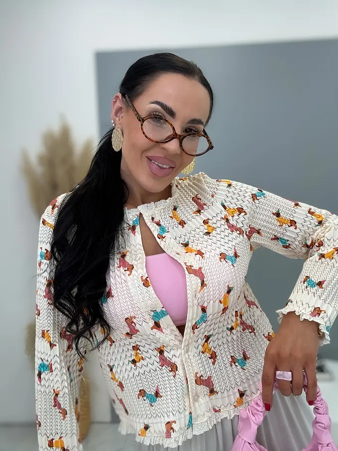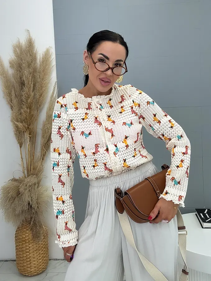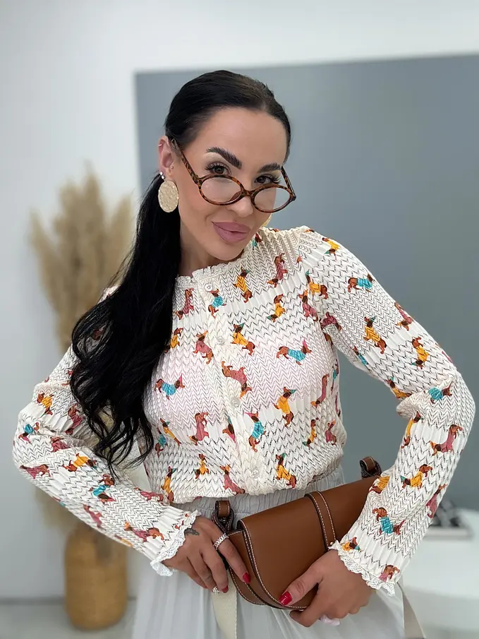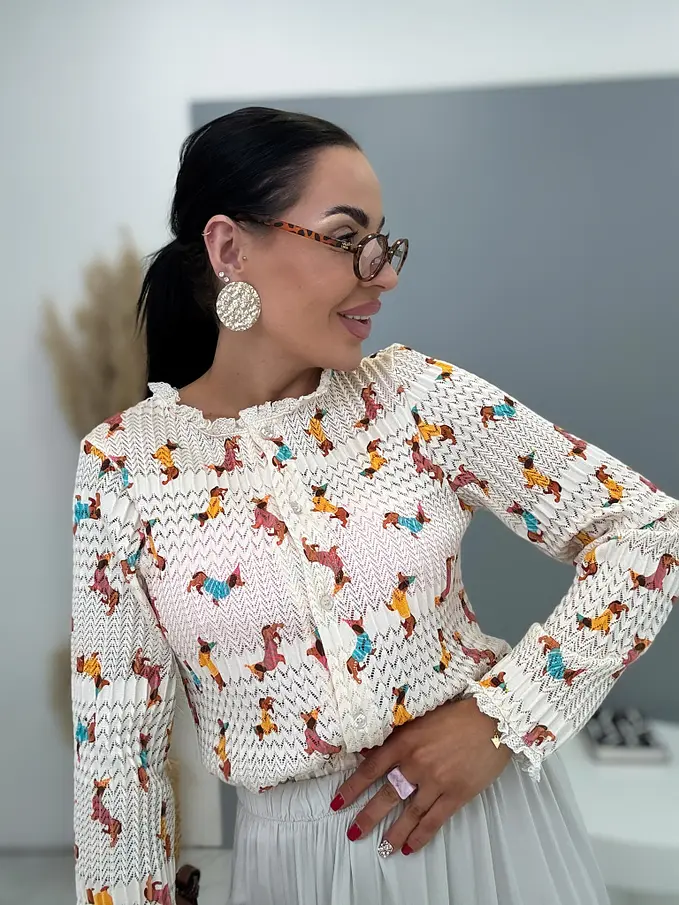 Prémium nyári gombos felső kutyás mintával, hosszú ujjú – kényelmes és stílusos darab mindennapi viseletre