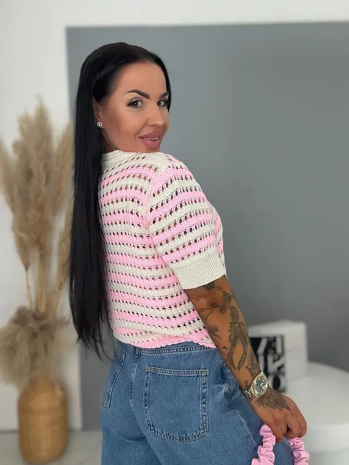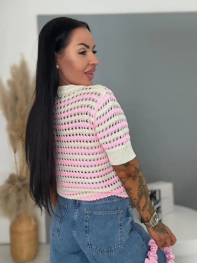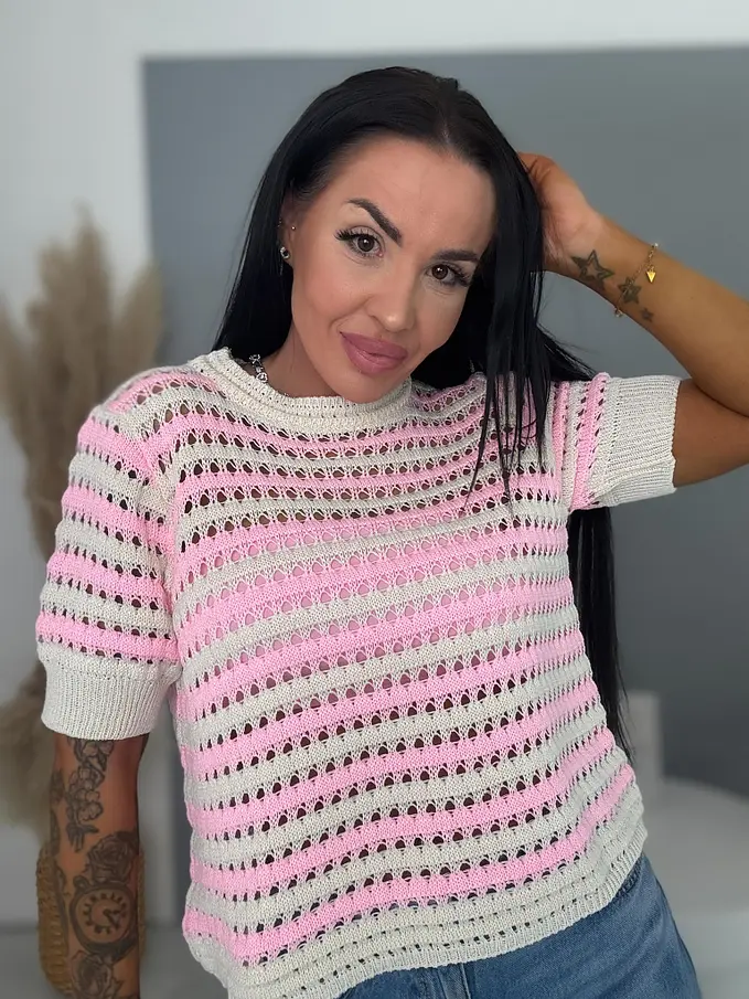 Horgolt rövid ujjú felső – könnyed, légies viselet a mindennapokra. Finoman kidolgozott, kényelmes darab, amely tökéletes választás melegebb napokra. Puha, jól szellőző anyagának köszönhetően kellemes érzetet biztosít egész nap, miközben stílusos megjelenést ad. Könnyen kombinálható farmerrel, szoknyával vagy rövidnadrággal is, így sokoldalú alapdarabja lehet a ruhatárnak.