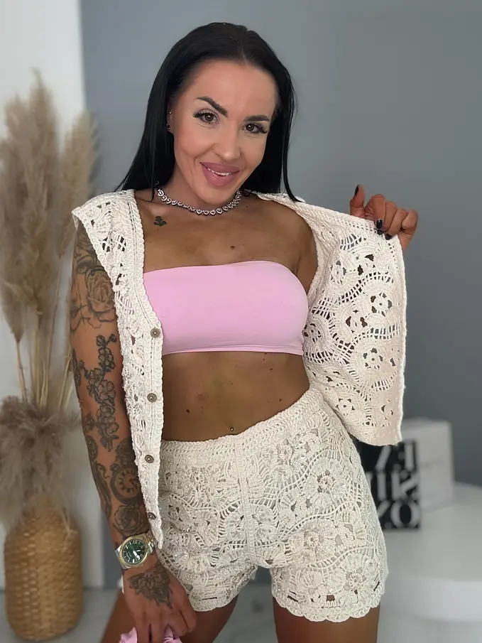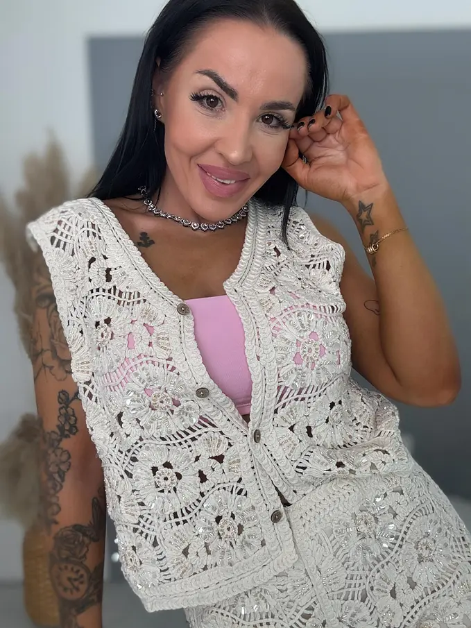 Horgolt szett flitterekkel és gyöngyökkel , melyet imádni fog. A komplett mellényből és rövid nadrágból áll. A nadrág nem átlátszó, belső béléssel készült. A gombok fából készültek.