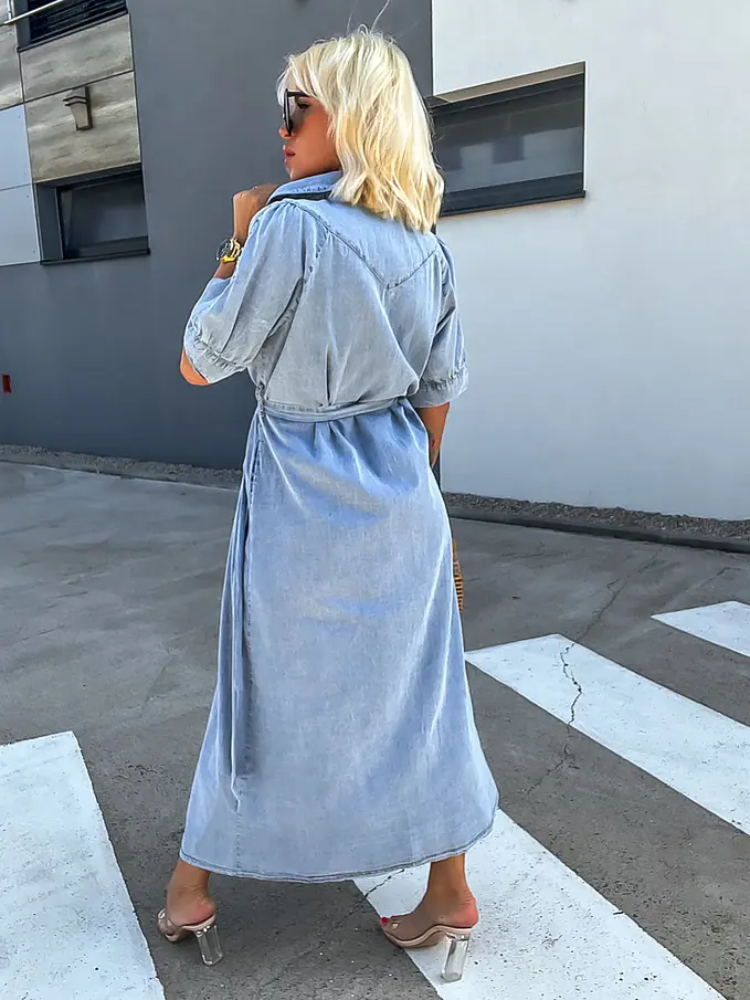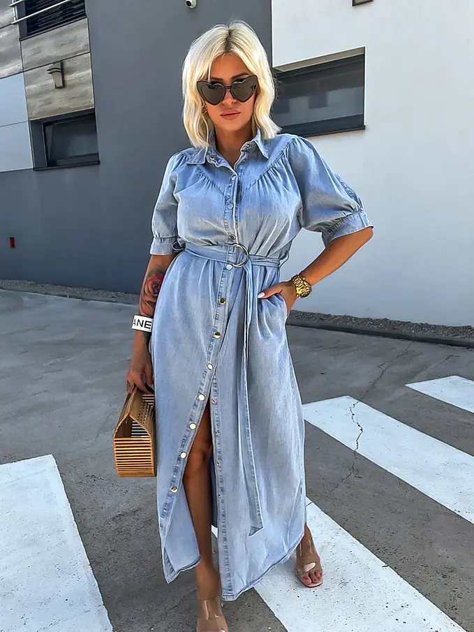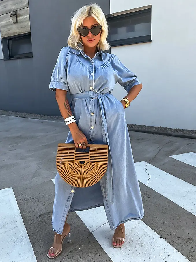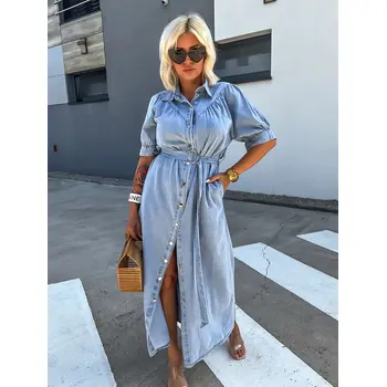 Női farmerruha kényelmes, vékony anyagból. Nem elasztikus. A gombok ezüst színűek.