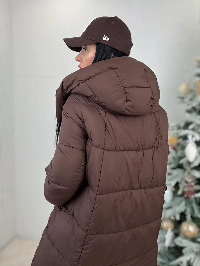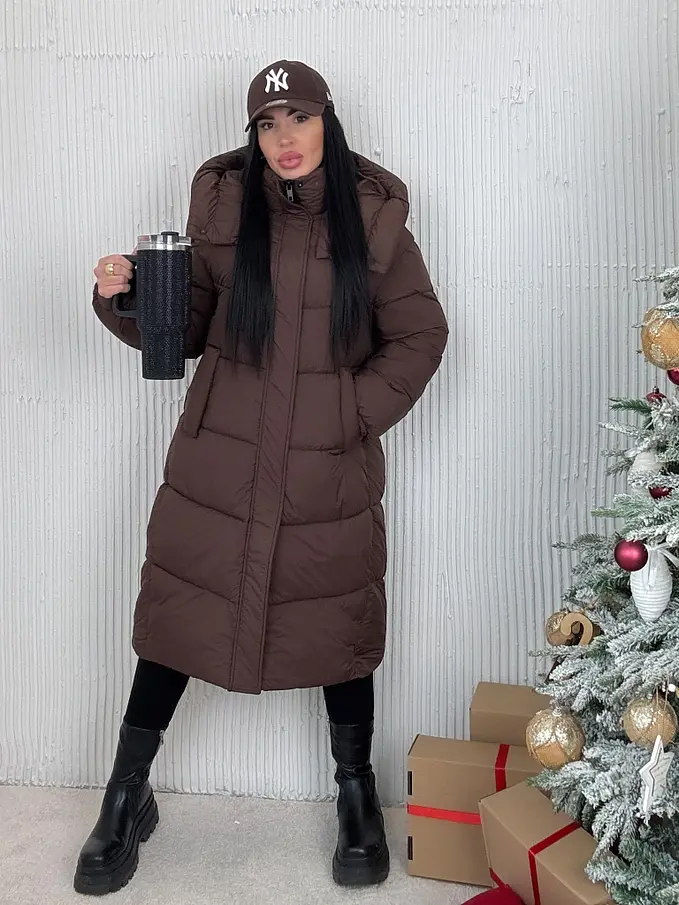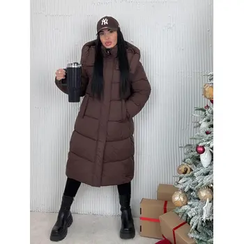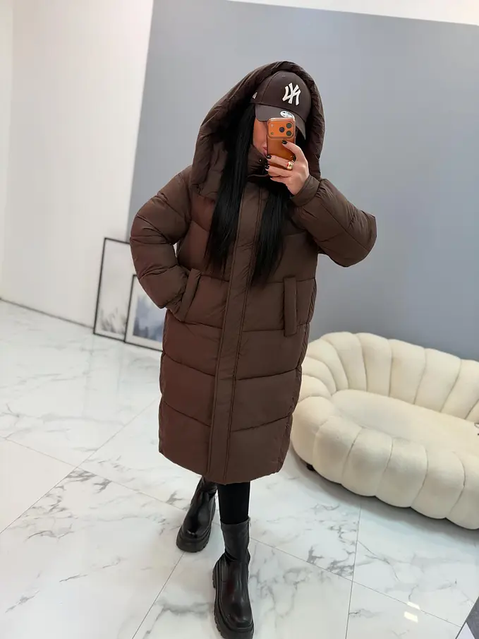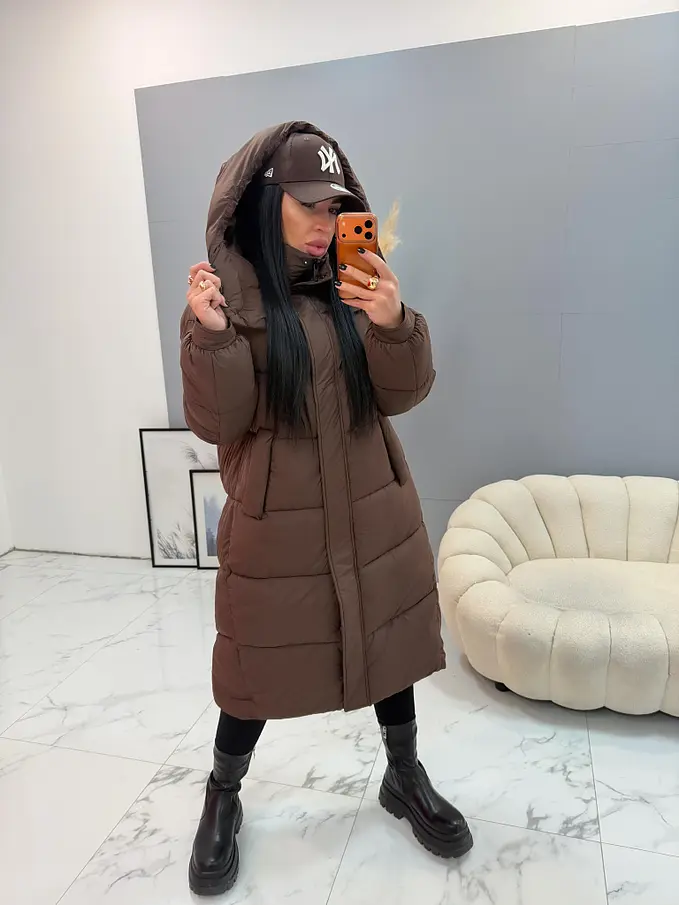 Kabát nem levehető kapucnival. Oldalsó zsebekkel. Fekete színű cipzárral és díszítéssel.