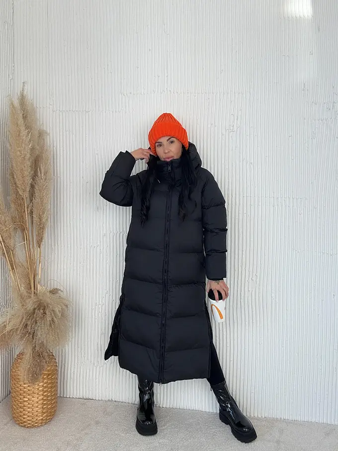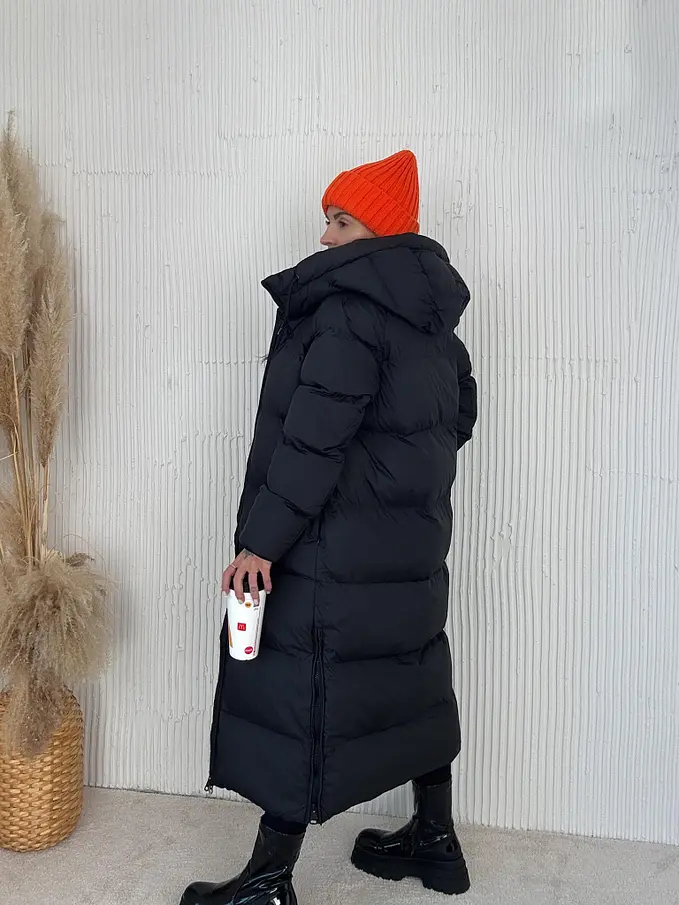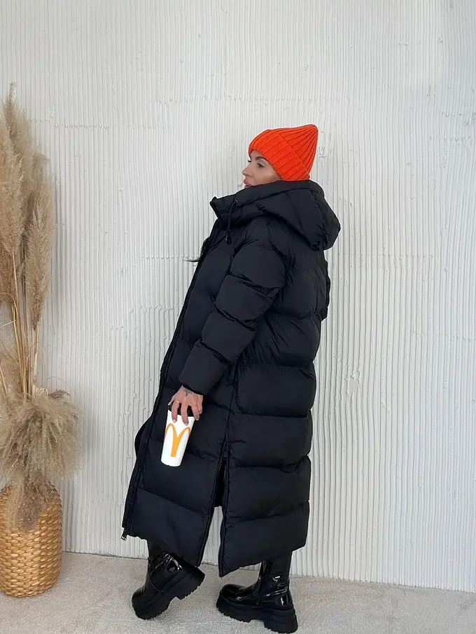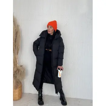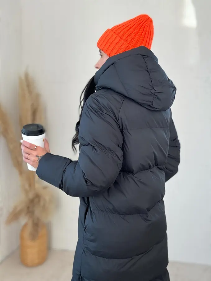Kabát nem levehető kapucnival. Oldalsó zsebekkel. Fekete színű cipzárral és díszítéssel.