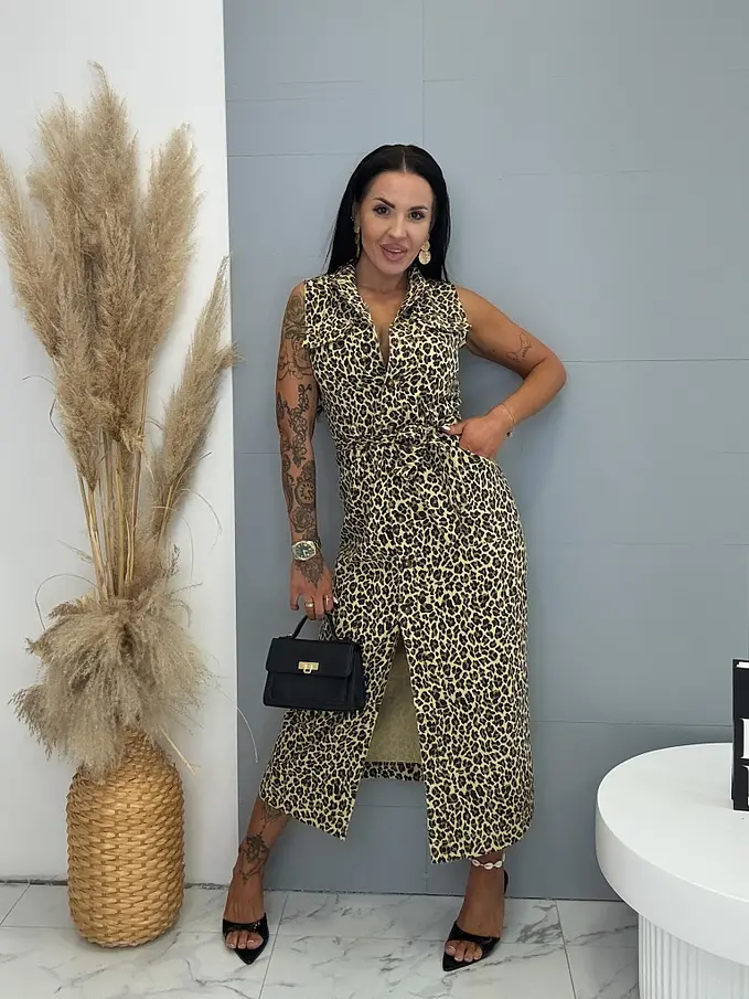 Stílusos rövid ujjú, leopárd mintás hosszú ruha övvel a deréknál, gombos záródással a kényelmes fel- és levételért. Mellrészen és oldalt zsebekkel a praktikus viseletért. Tökéletes minden ruhatárba.
