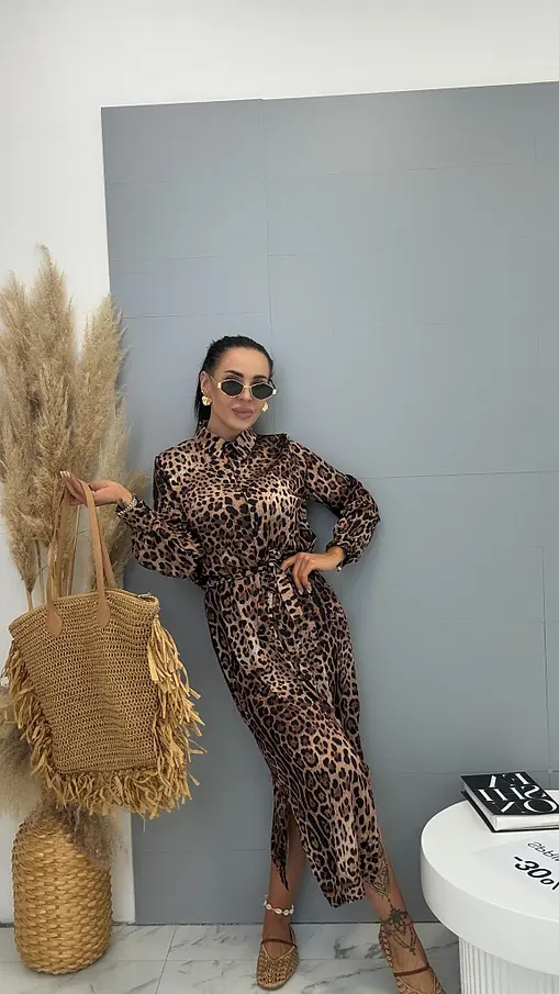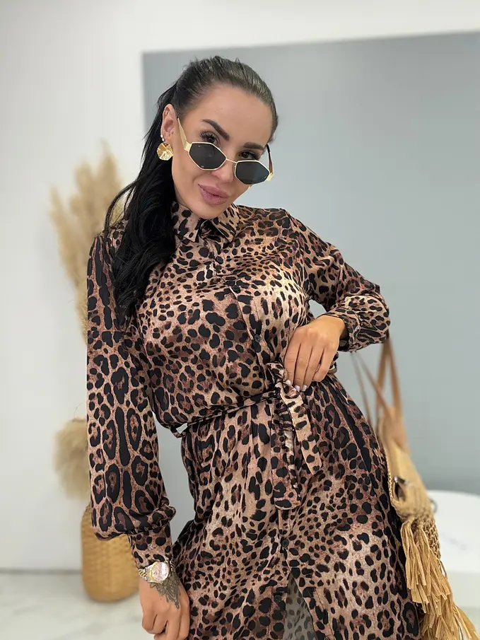 Hosszú leopárdmintás gombos ruha övvel LEONA