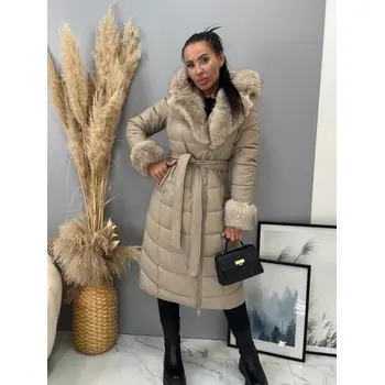 Hosszú műbőr kabát szőrmével és övvel NIVORA