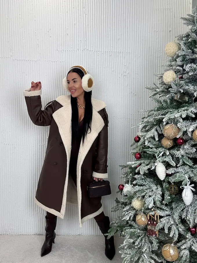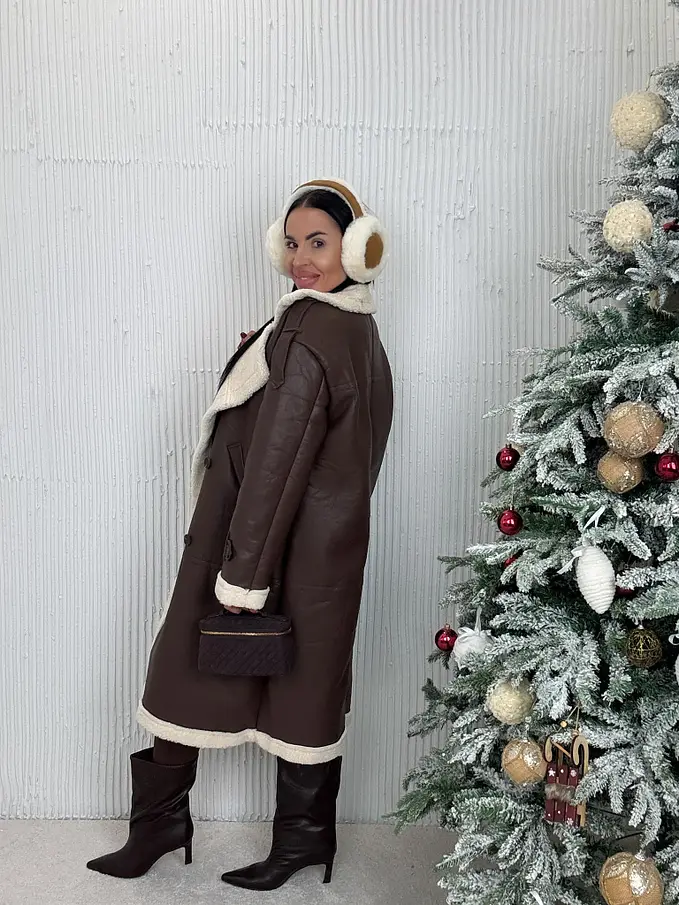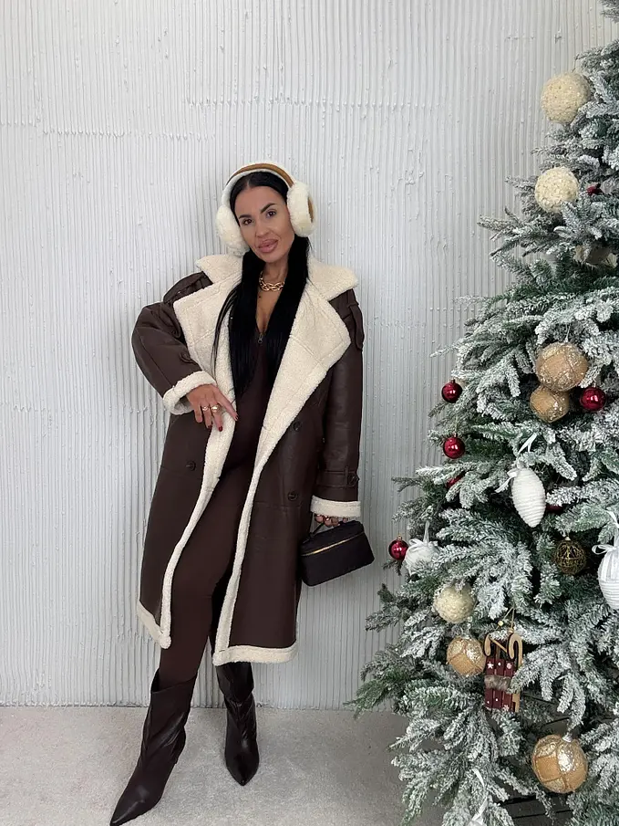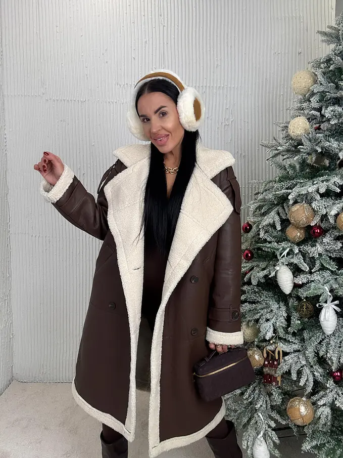 Kabát nem levehető szőrmés díszítéssel a galléron és az ujján. Szőrmés béléssel. A részletek barna színűek. Oldalsó zsebekkel.