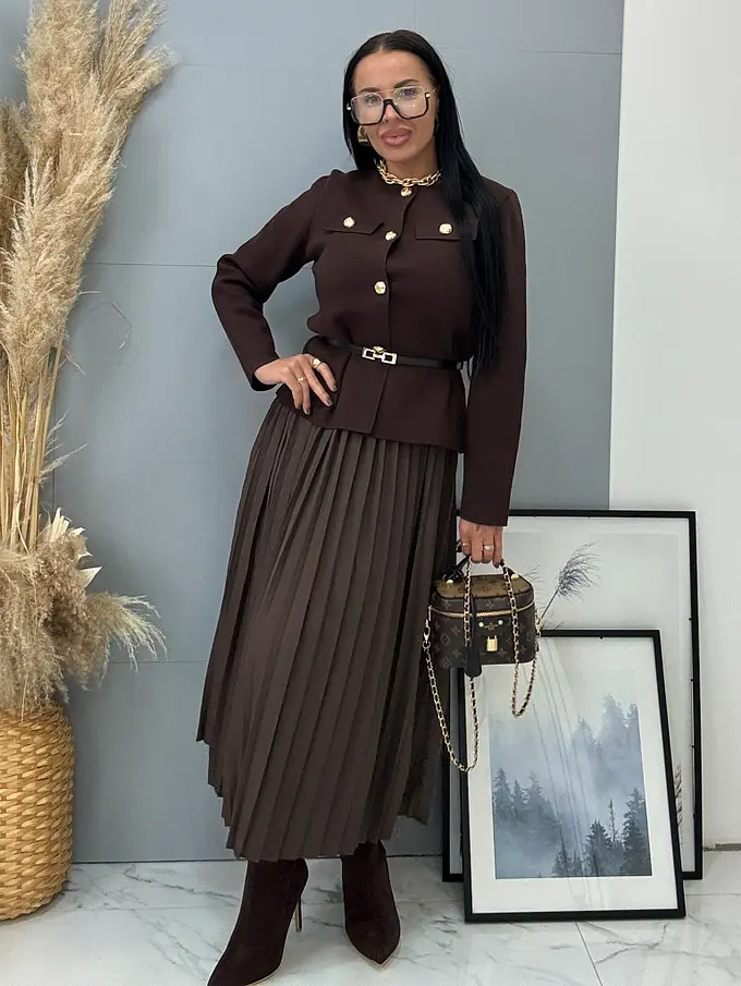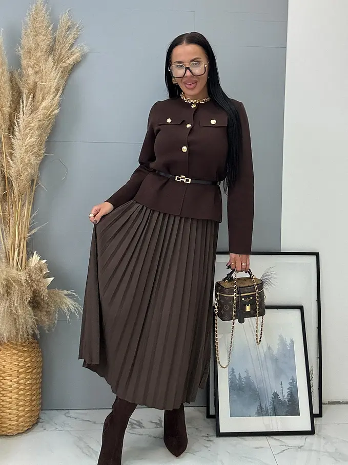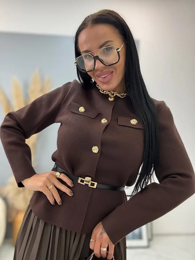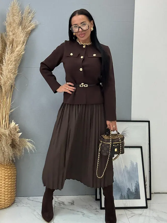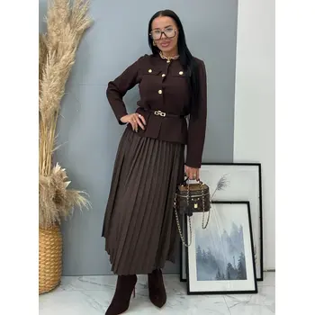 Női elegáns együttes a legújabb kollekcióból. Kardigánból és pántos ruhából áll. Anyaga enyhén elasztikus. A kardigán aranyozott gombokkal záródik. A ruhához öv is tartozik.