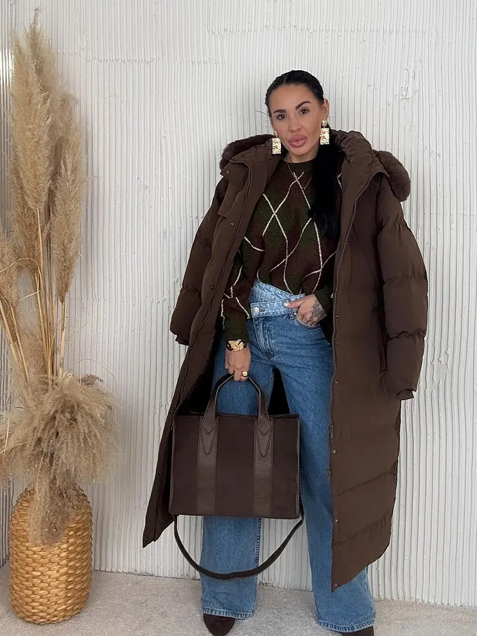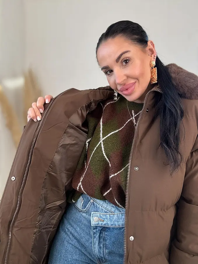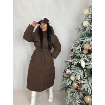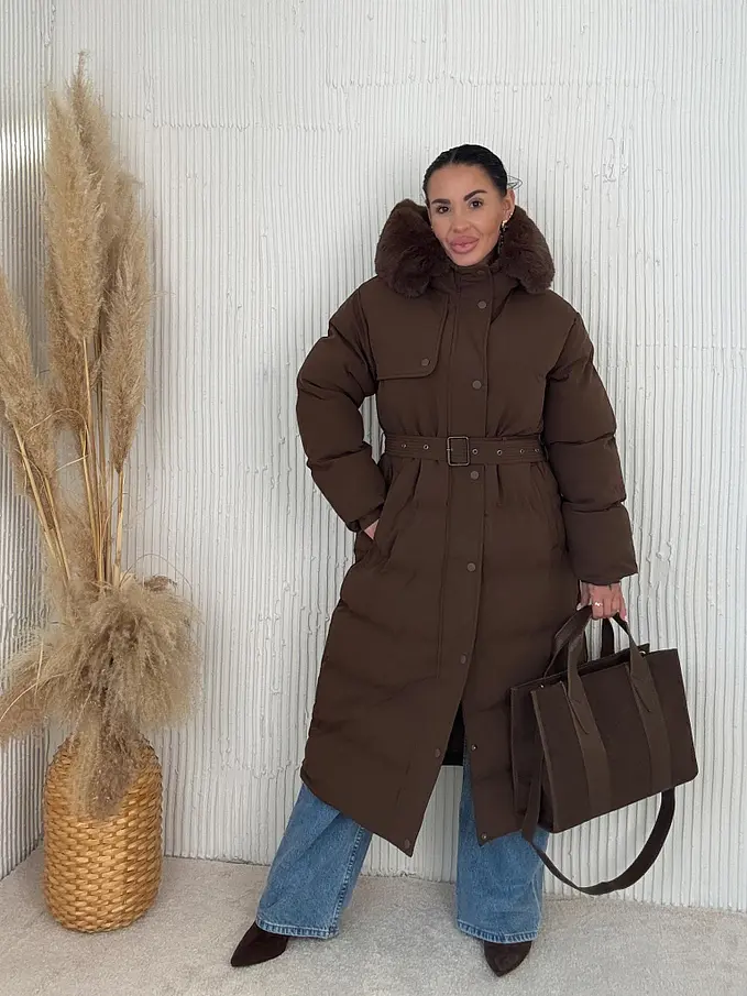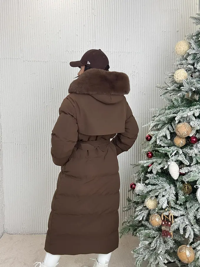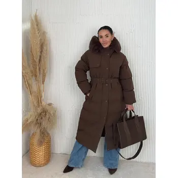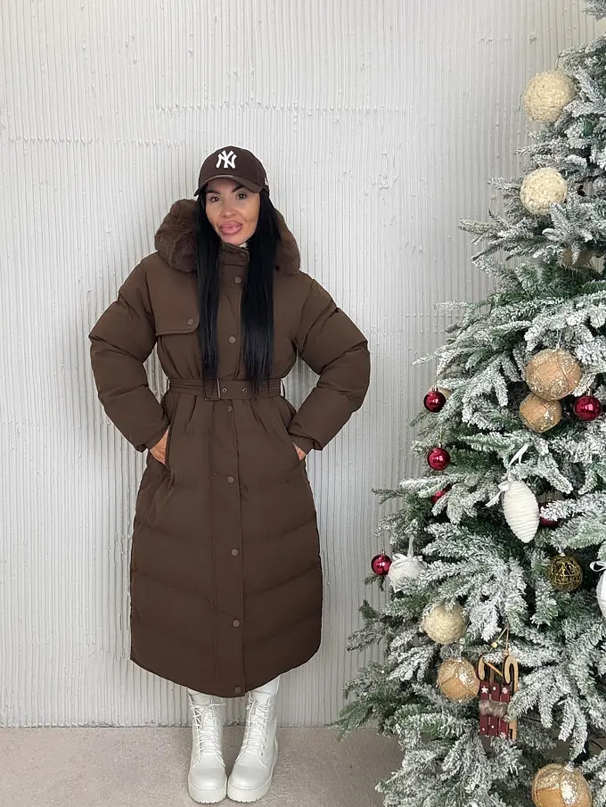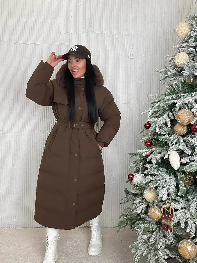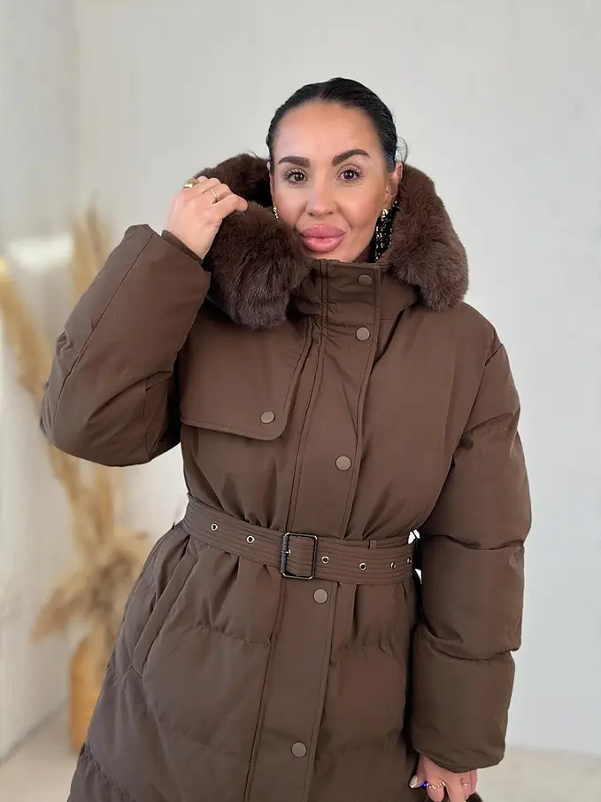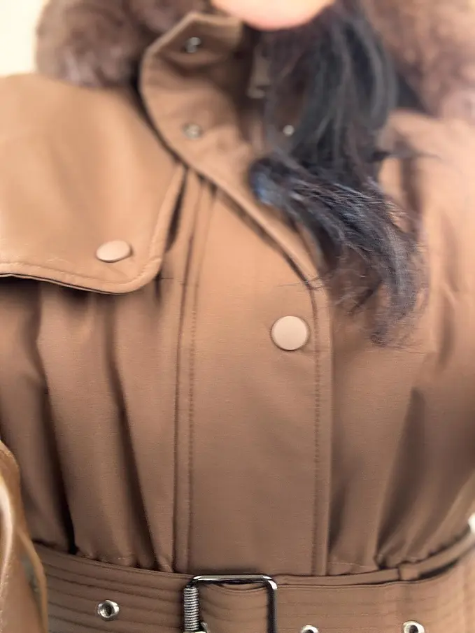 Kabát levehető szőrmés díszítéssel a kapucnin. Oldalsó zsebekkel.Barna színű cipzárral és díszítéssel. Nem levehető kapucnival és övvel.