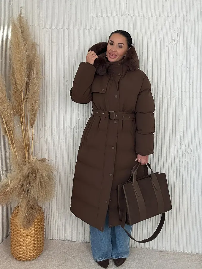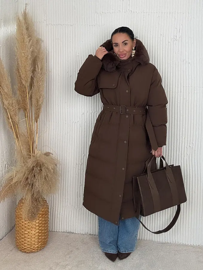 Hosszú szőrmés kapucnis kabát övvel NESIA