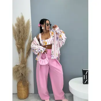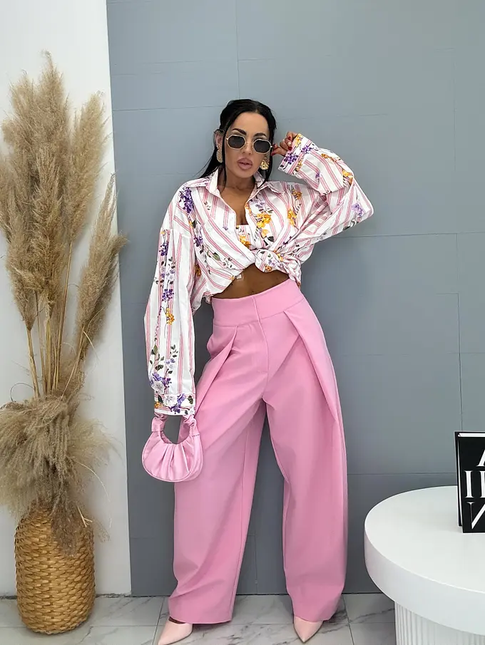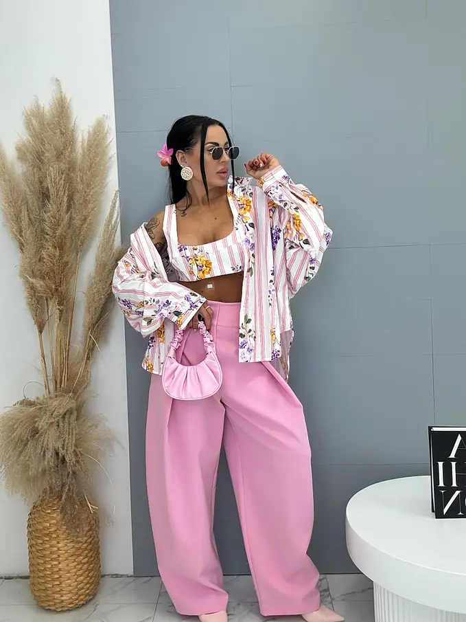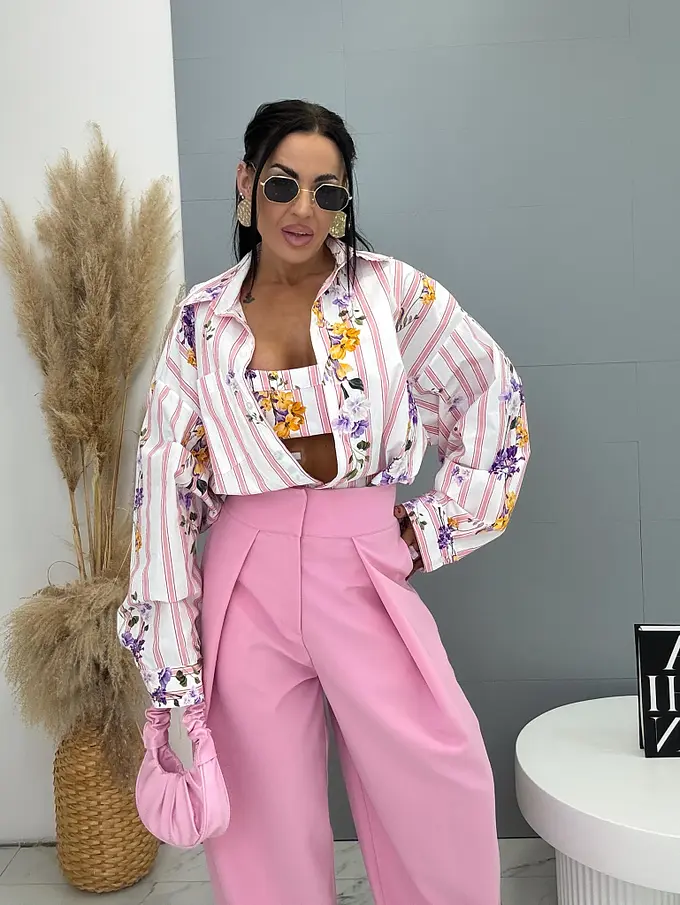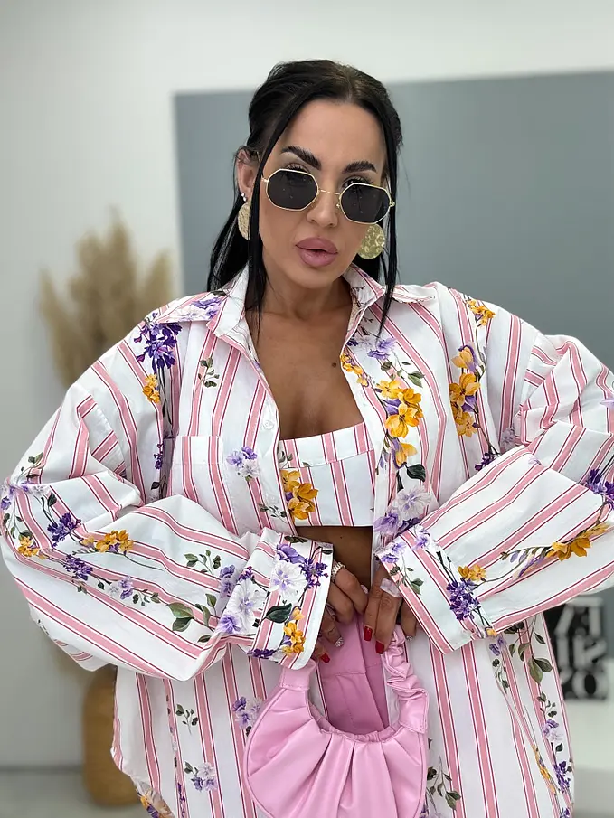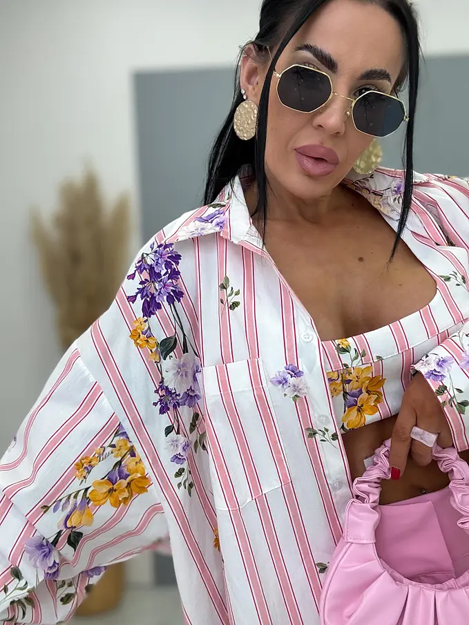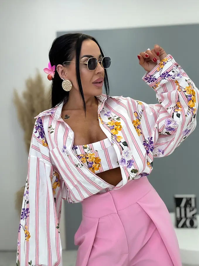 Pink színű, virágmintás hosszú ujjú ing toppal – prémium minőség, Olaszországból