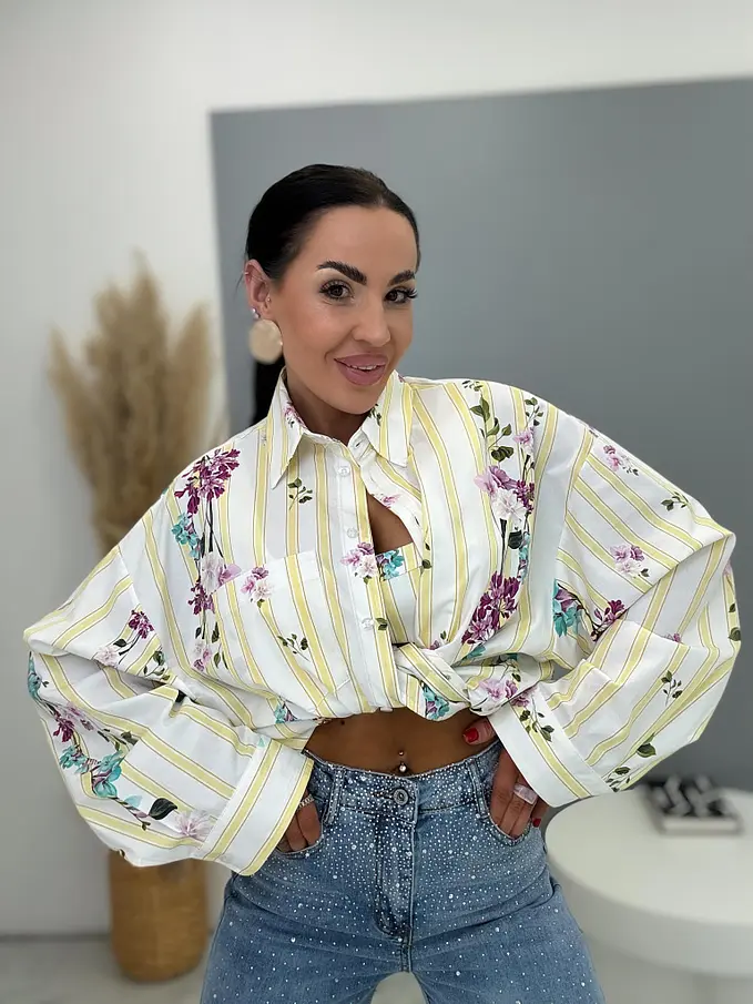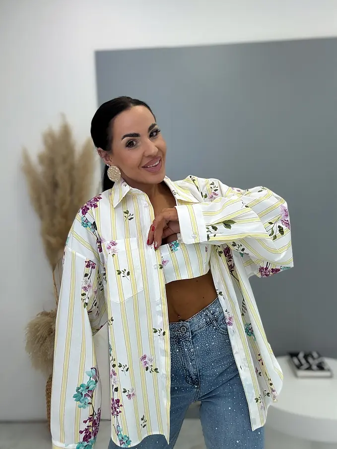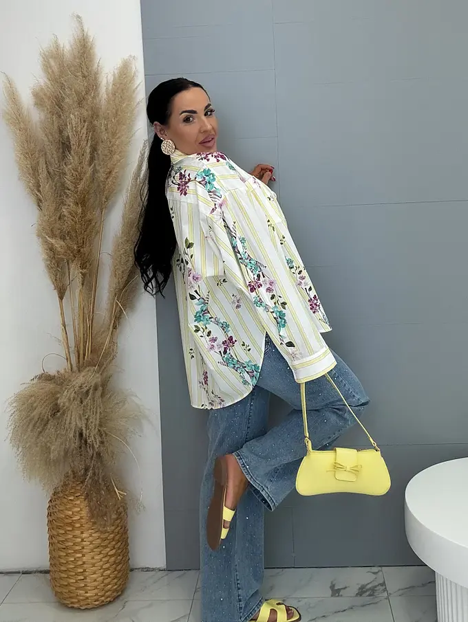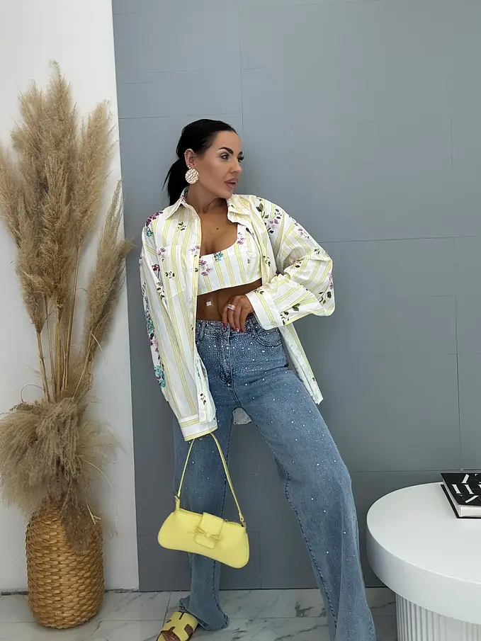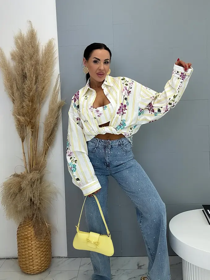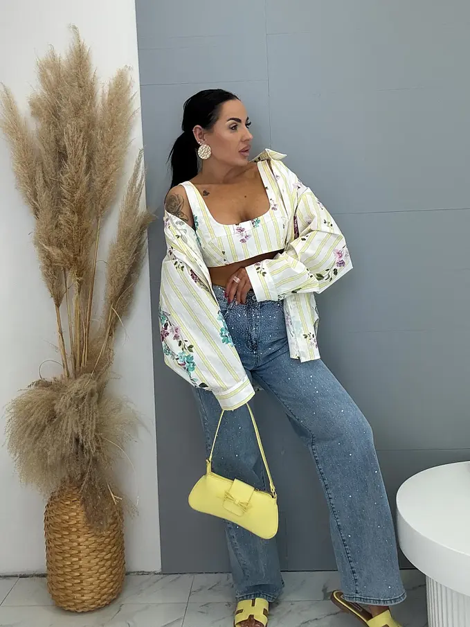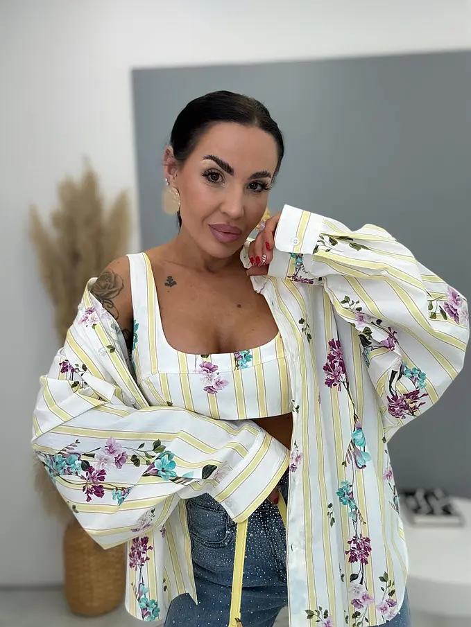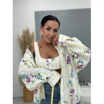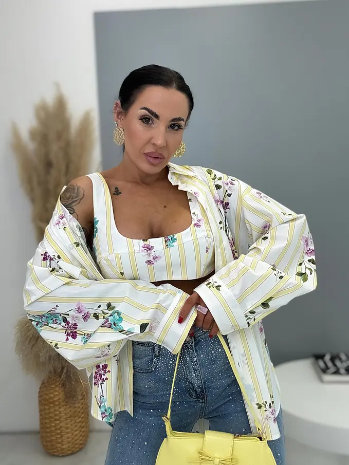Sárga színű, virágmintás hosszú ujjú ing toppal – prémium minőség, Olaszországból
