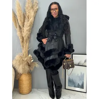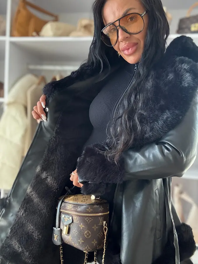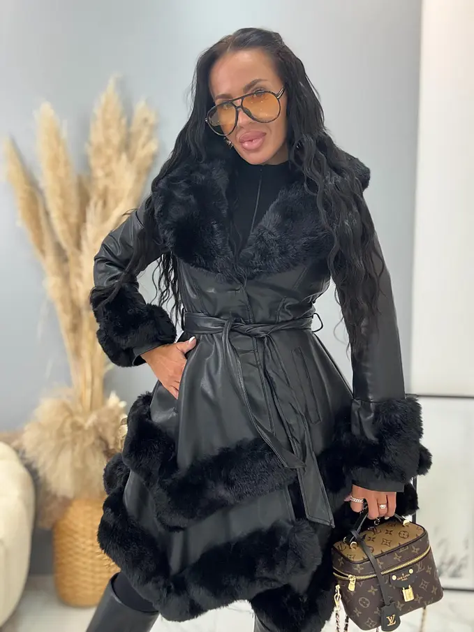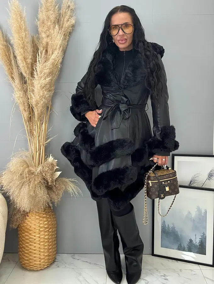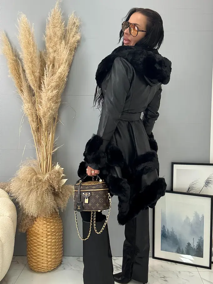 Bőrkabát nem levehető szőrmés díszítéssel a galléron és az ujján. Szőrmés béléssel. Oldalsó zsebekkel. Kapoccsal és övvel záródik. A kapucni nem levehető.