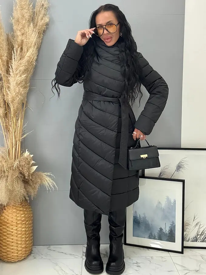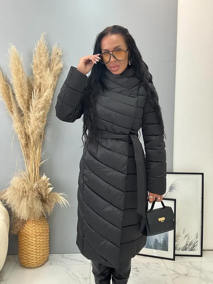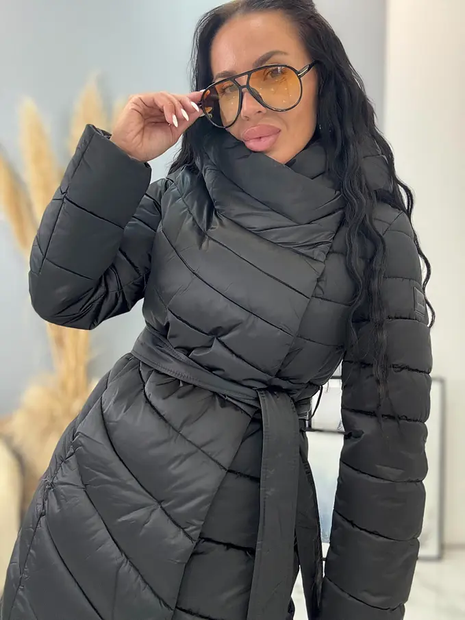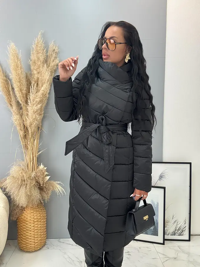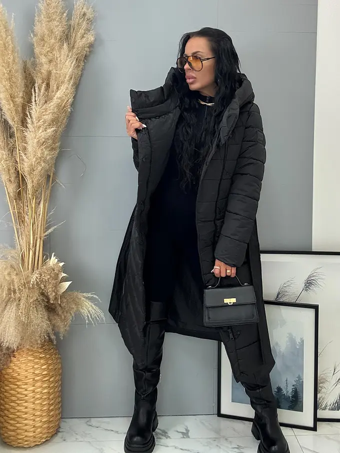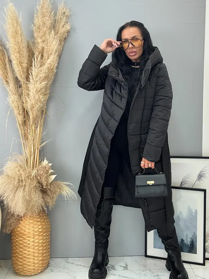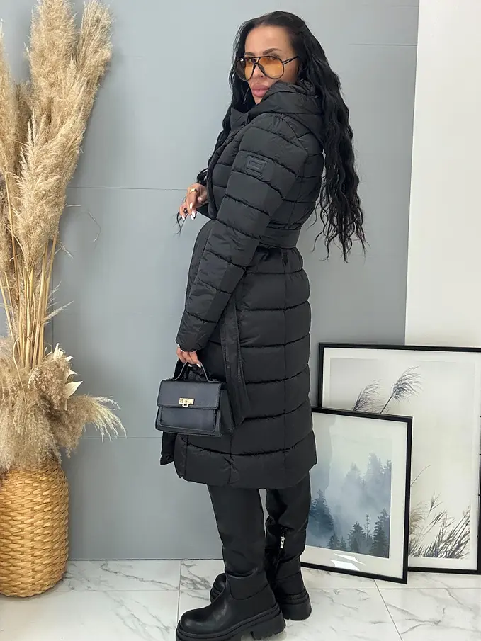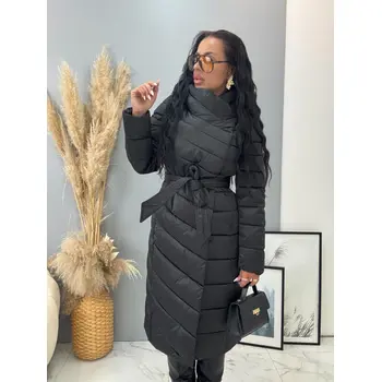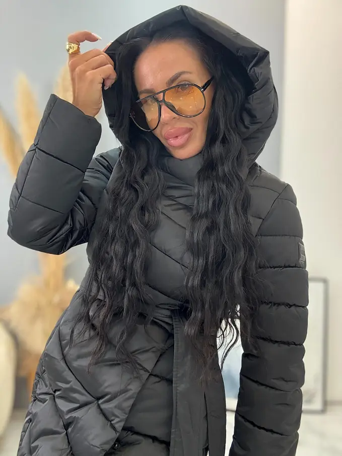 Steppelt kabát nem levehető kapucnival.Oldalsó zsebekkel. Fekete díszítéssel.