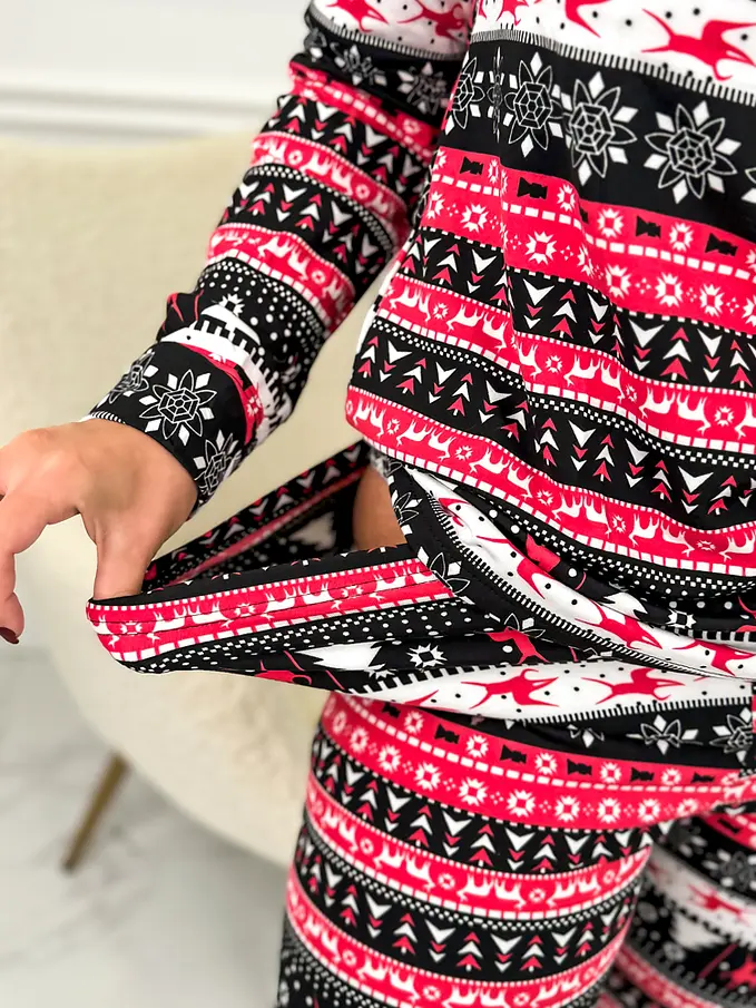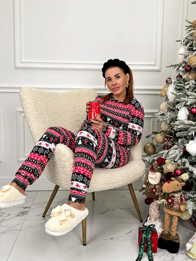 Pihe-piha, meleg pizsama elasztikus anyagból. A nadrág gumis derekú. A modellek M méretet viseltek a fotózáson.