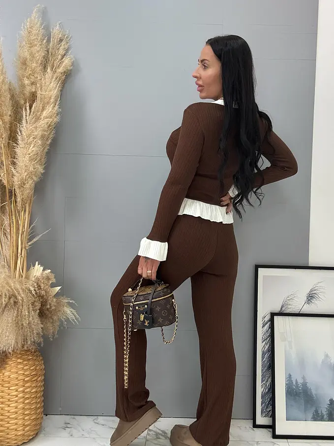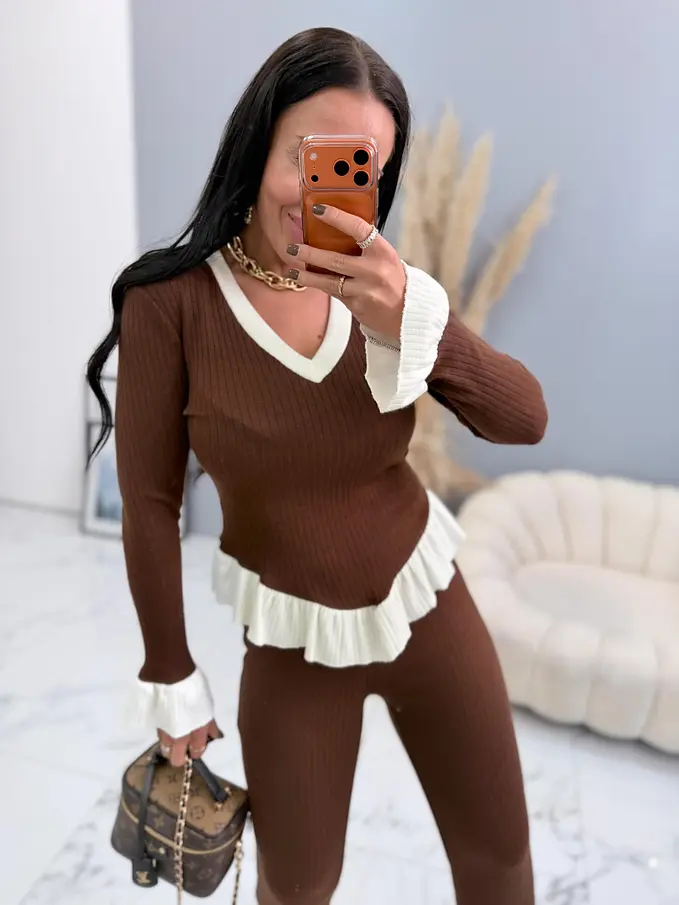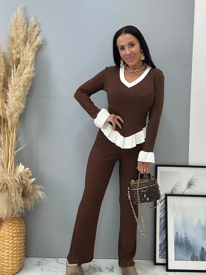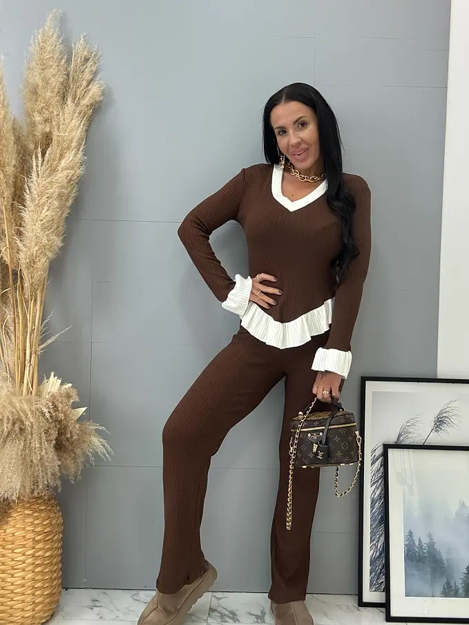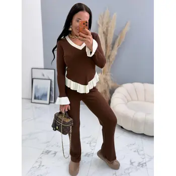 Női elegáns együttes a legújabb kollekcióból. Pulóverből és gumis derekú nadrágból áll. Anyaga kellemes, elasztikus. Fodorral díszítve.