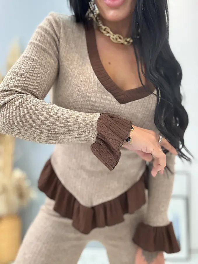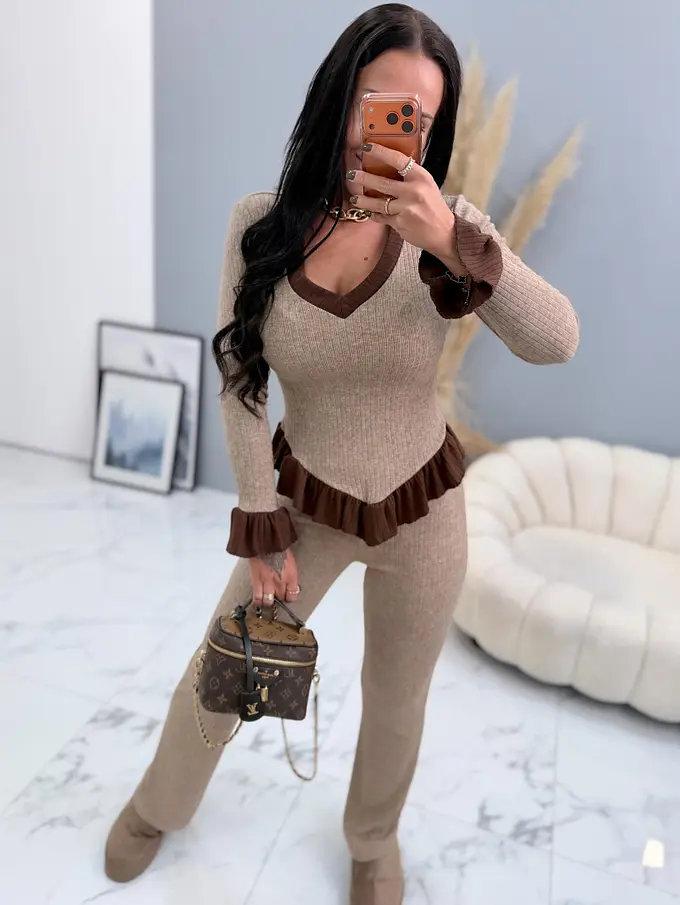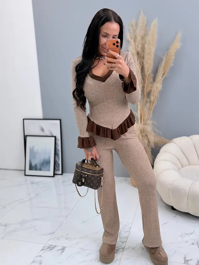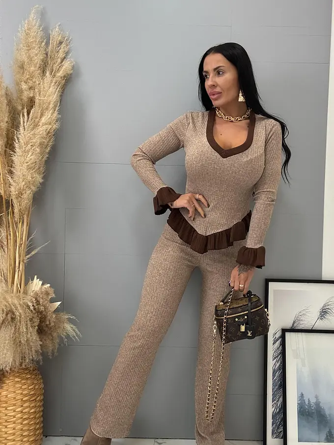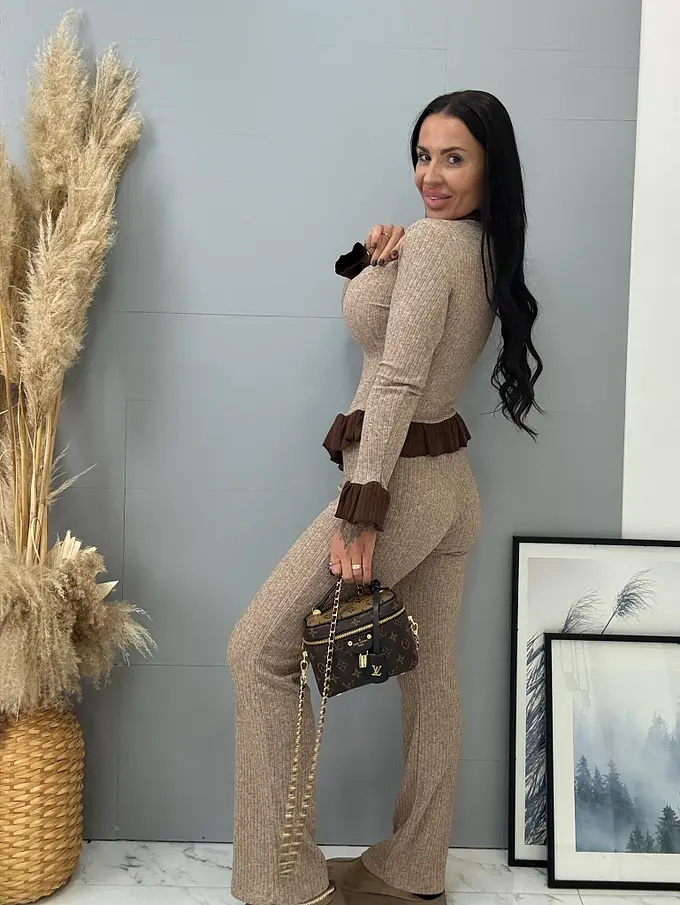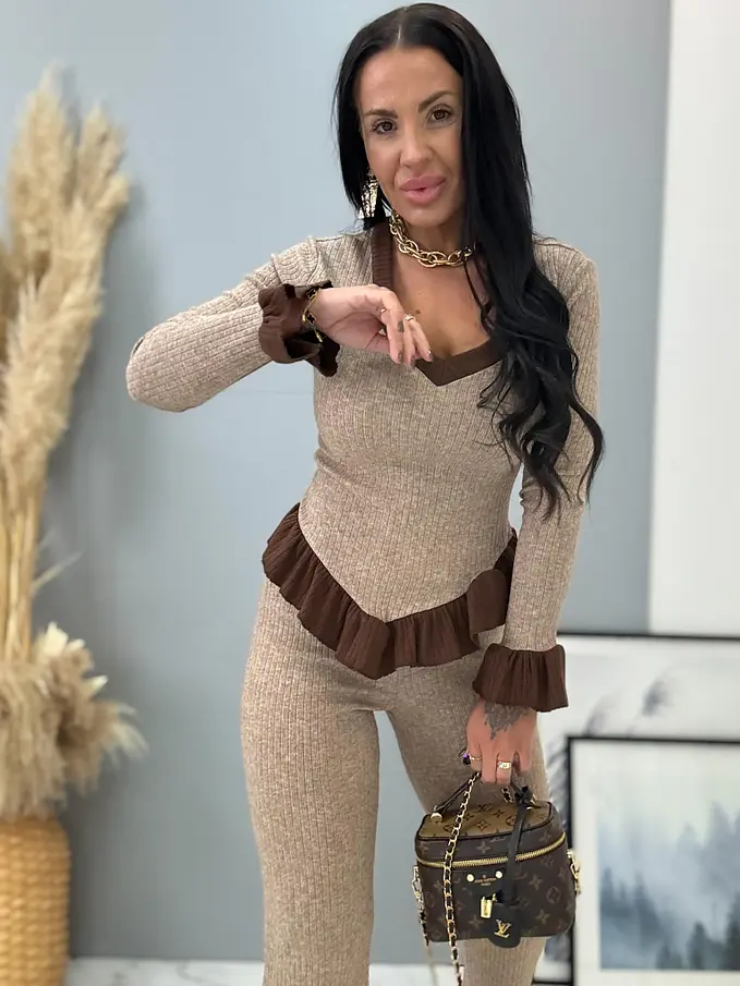 Női elegáns együttes a legújabb kollekcióból. Pulóverből és gumis derekú nadrágból áll. Anyaga kellemes, elasztikus. Fodorral díszítve.