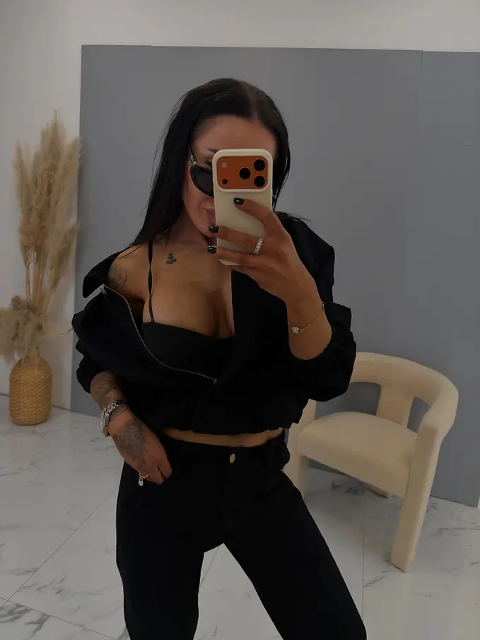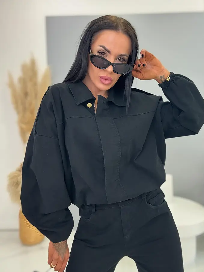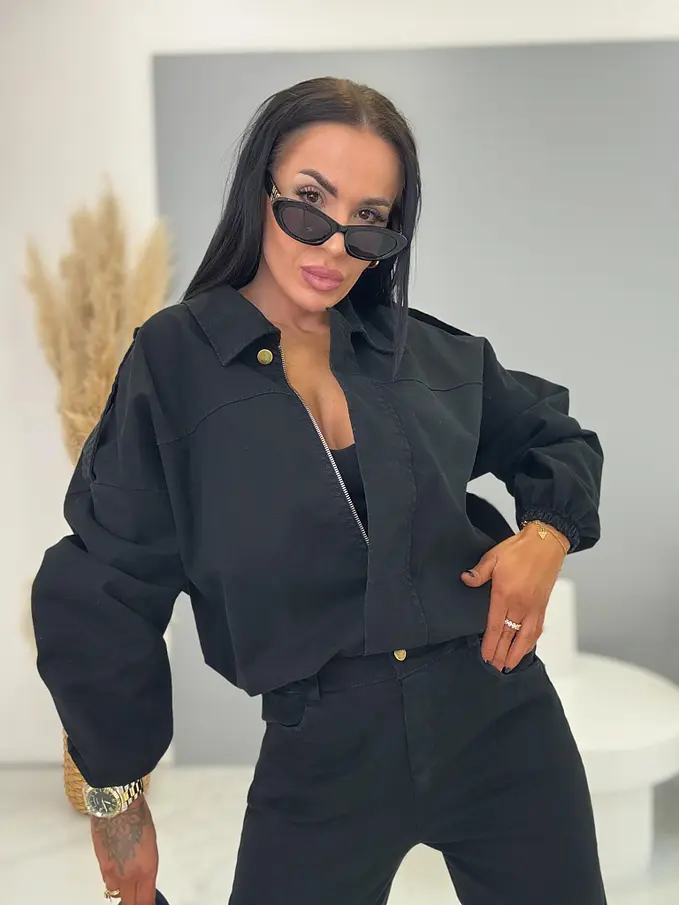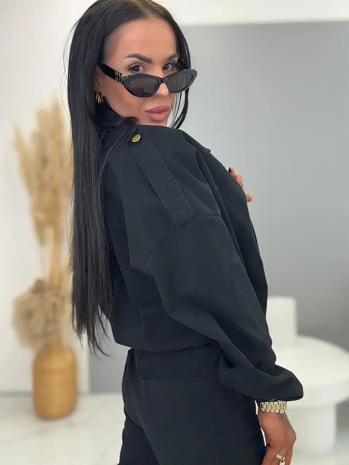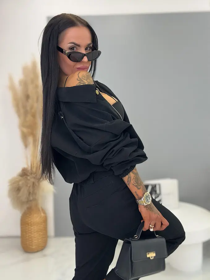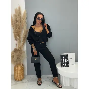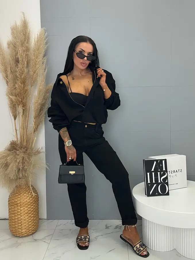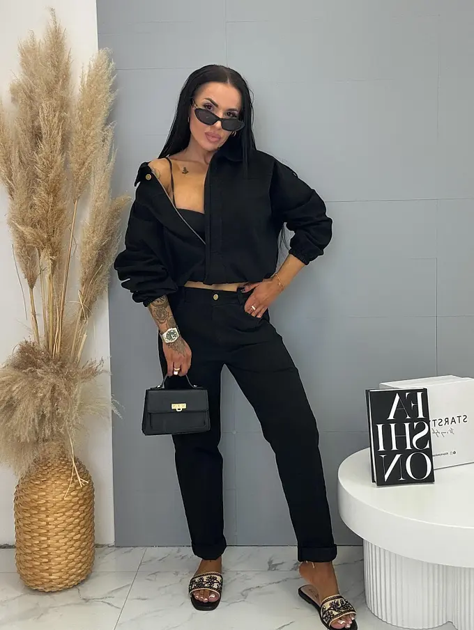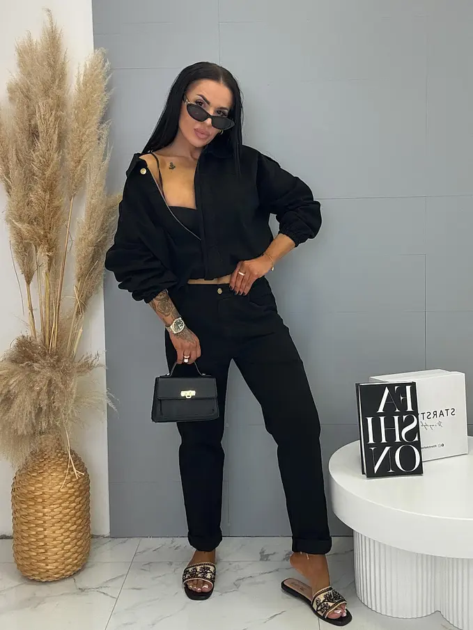 Női együttes a legújabb kollekcióból. Gombos kabátkából és magas derekú nadrágból áll. A nadrág gumis derekú. Anyaga kellemes, enyhén elasztikus. A kabát gumis derékkal. A gombok arany színűek, a cipzár ezüst színű.