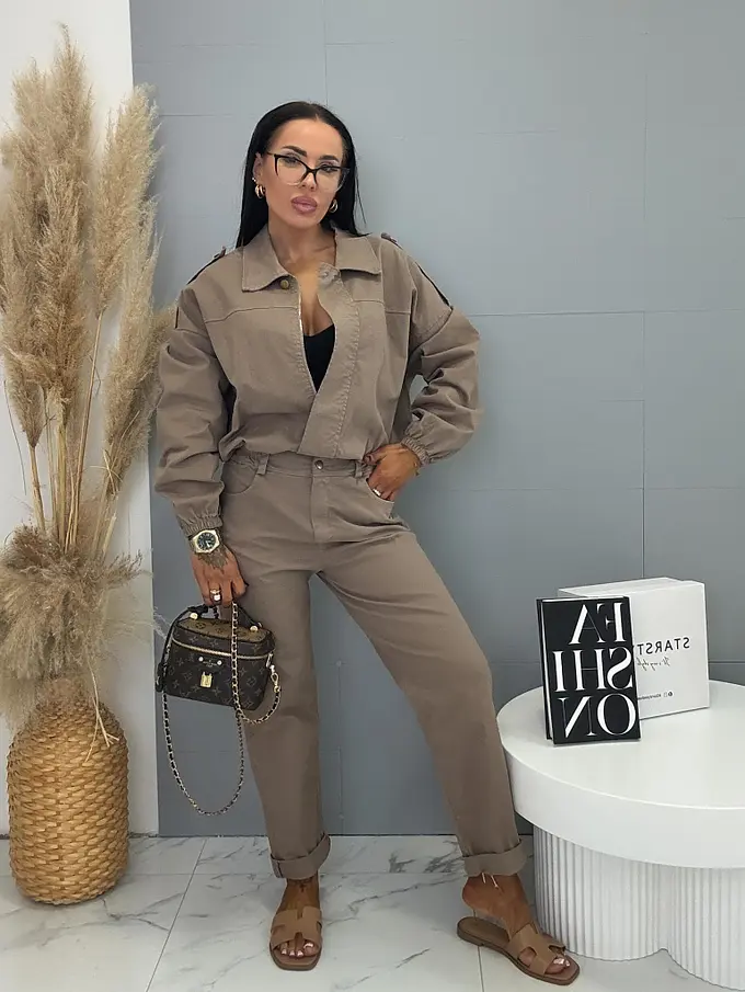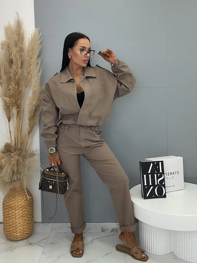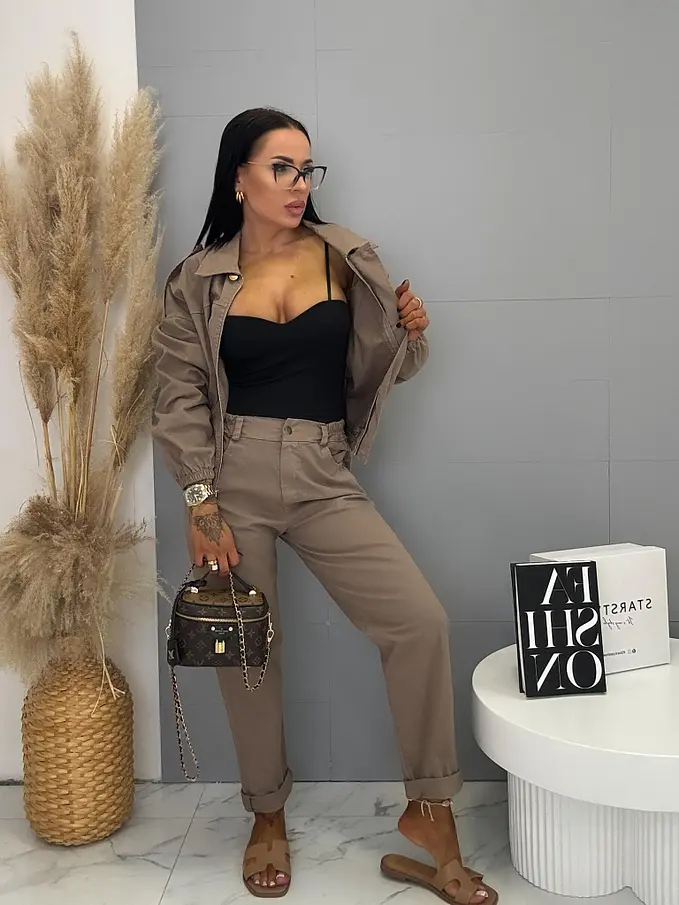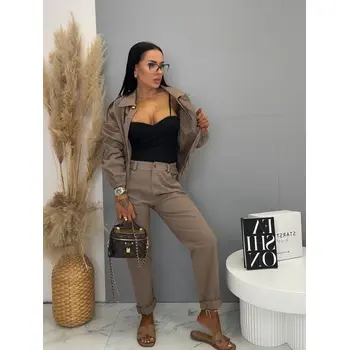 Női együttes a legújabb kollekcióból. Gombos kabátkából és magas derekú nadrágból áll. A nadrág gumis derekú. Anyaga kellemes, enyhén elasztikus. A kabát gumis derékkal. A gombok arany színűek, a cipzár ezüst színű.
