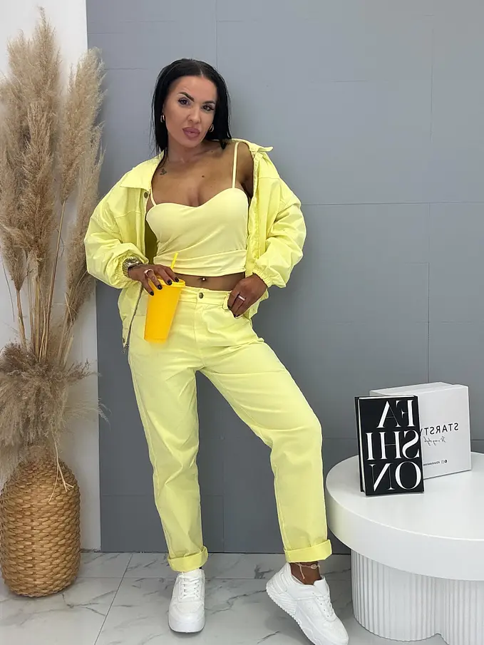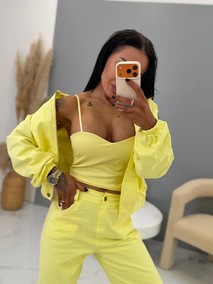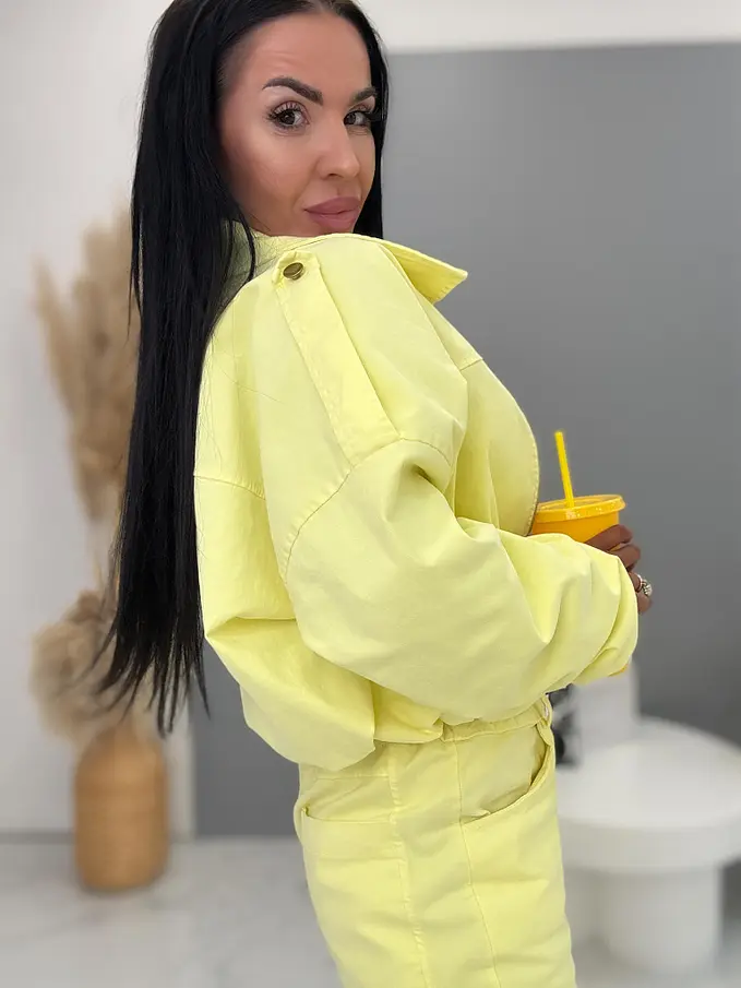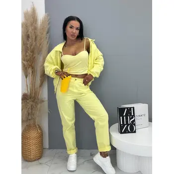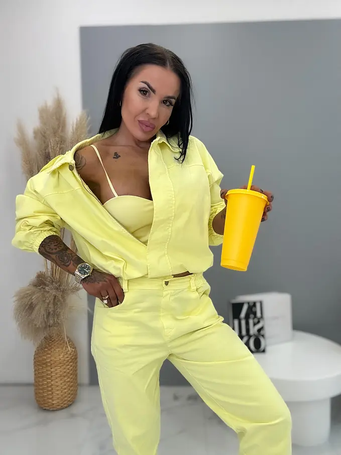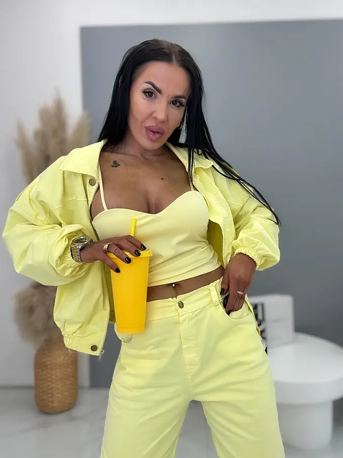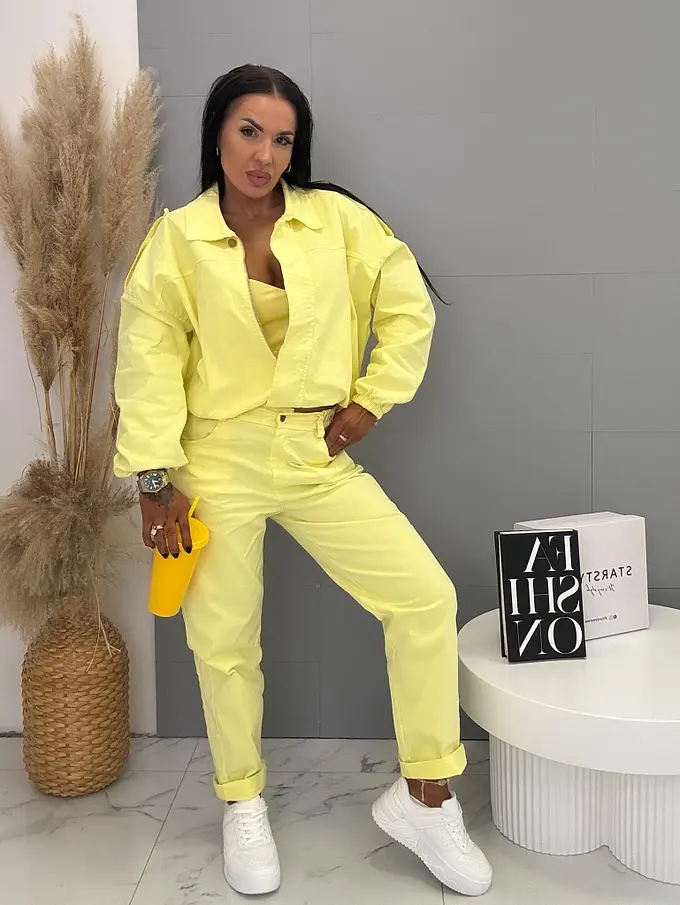 Női együttes a legújabb kollekcióból. Gombos kabátkából és magas derekú nadrágból áll. A nadrág gumis derekú. Anyaga kellemes, enyhén elasztikus. A kabát gumis derékkal. A gombok arany színűek, a cipzár ezüst színű.