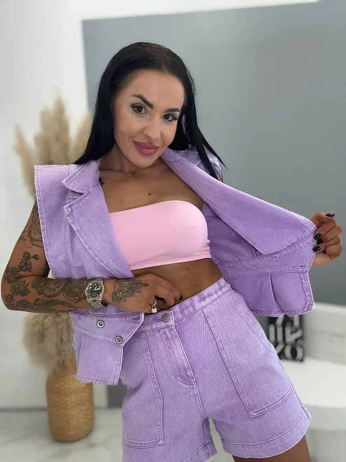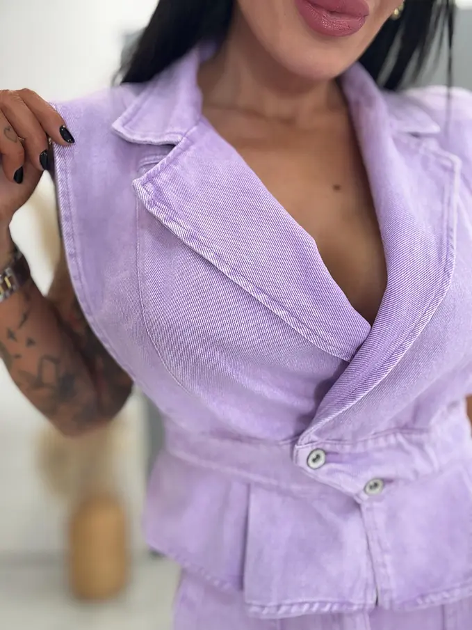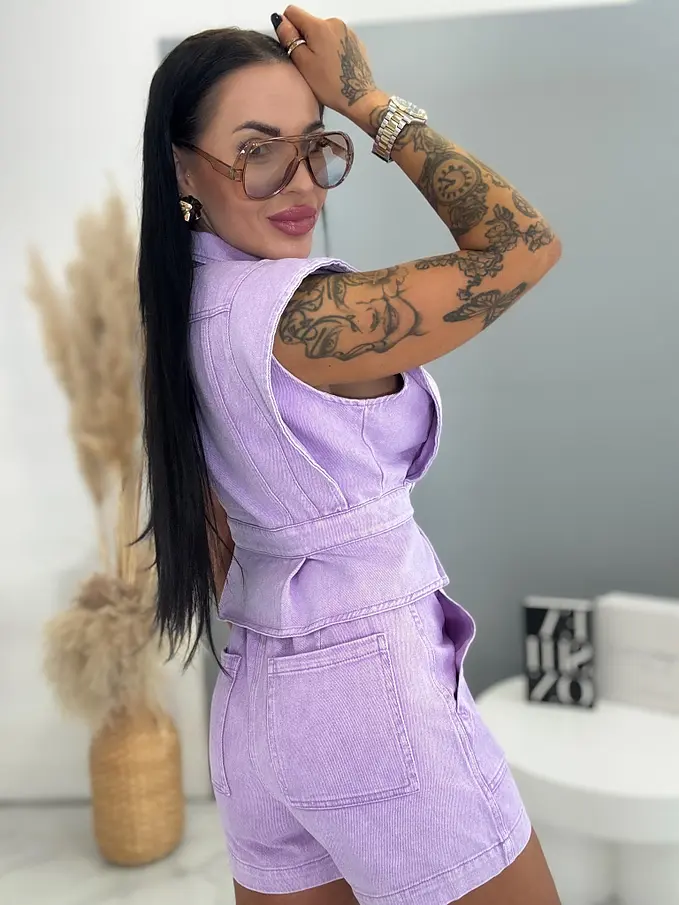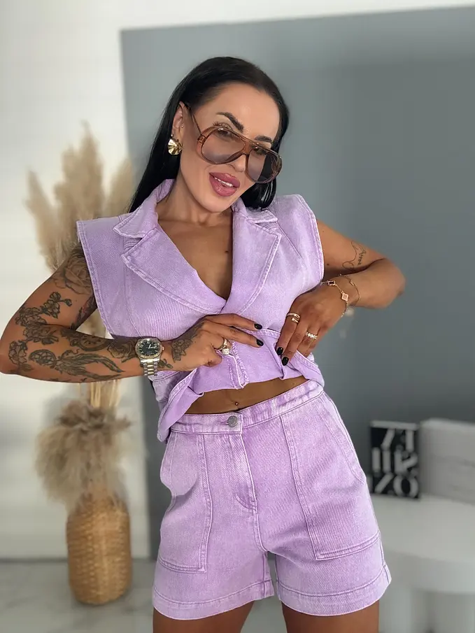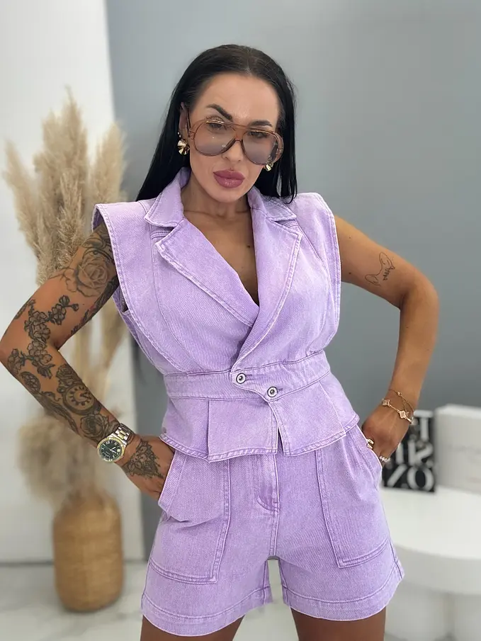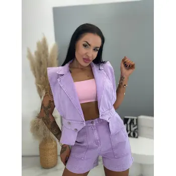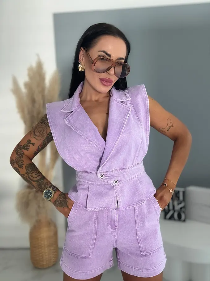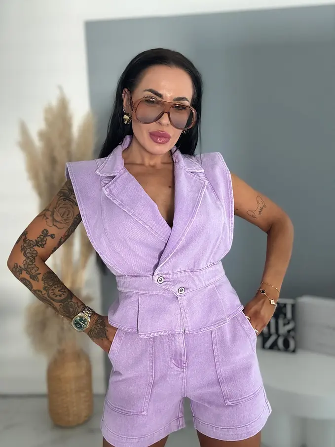 Prémium minőség. Női két részes farmer szett – mellény és rövidnadrággal. Az anyag nem rugalmas. A mellény két ezüst gombbal záródik. A rövidnadrág praktikus, funkcionális zsebekkel rendelkezik.
