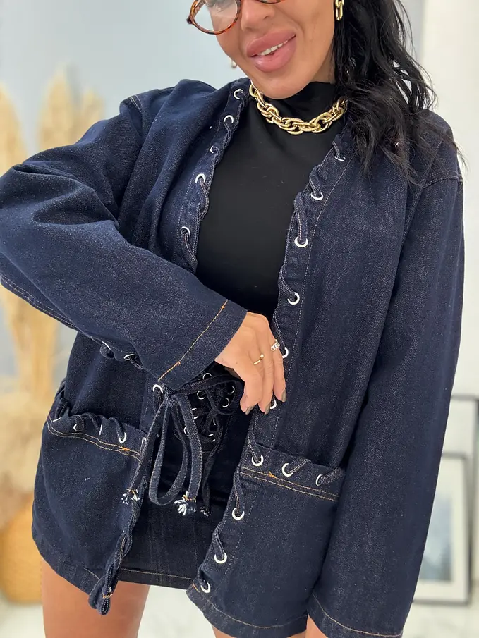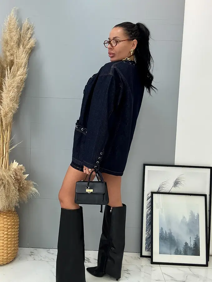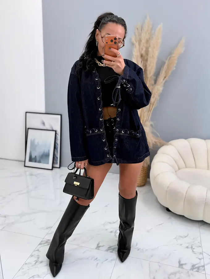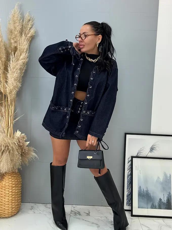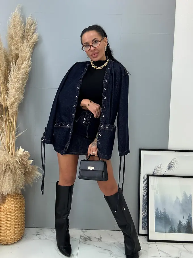 A szett egyenes szabású kabátból és oldalt cipzáras szoknyából áll. Prémium minőség. A szoknya anyaga elasztikus.
