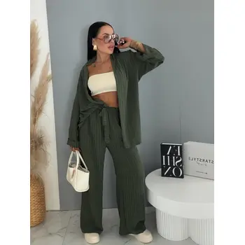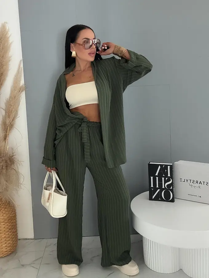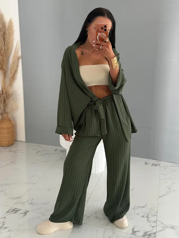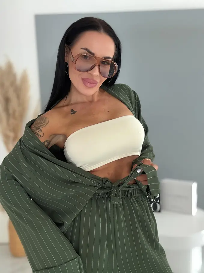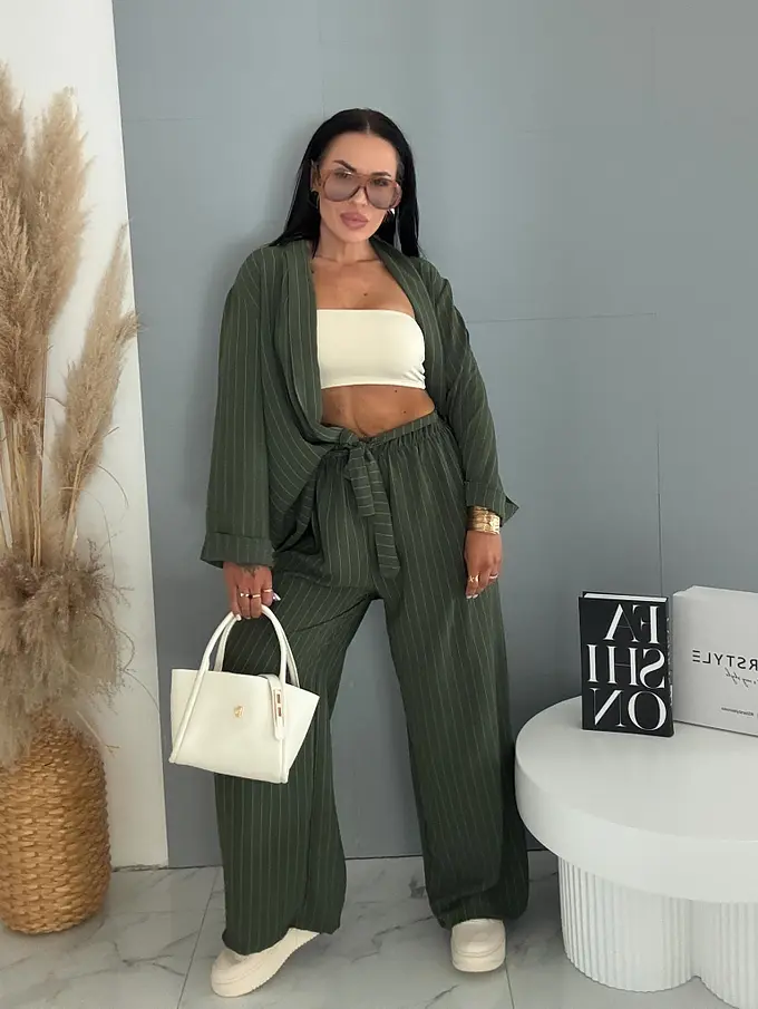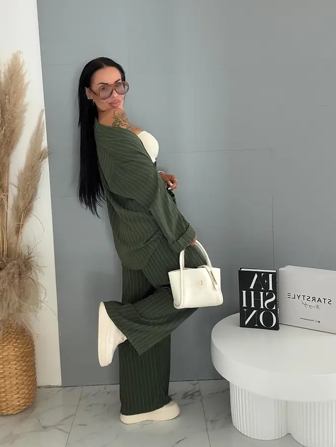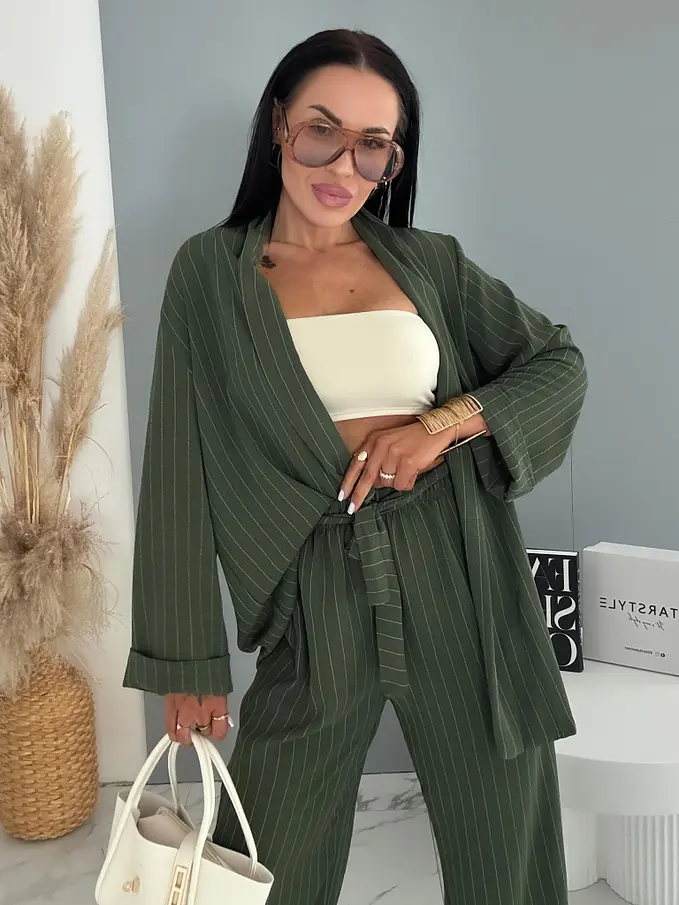 Női kétrészes szett a legújabb kollekcióból. A szett zakóból és nadrágból áll. Anyaga kellemes, rugalmas. A nadrág gumis derékkal és övvel. A zakó lezser szabású.