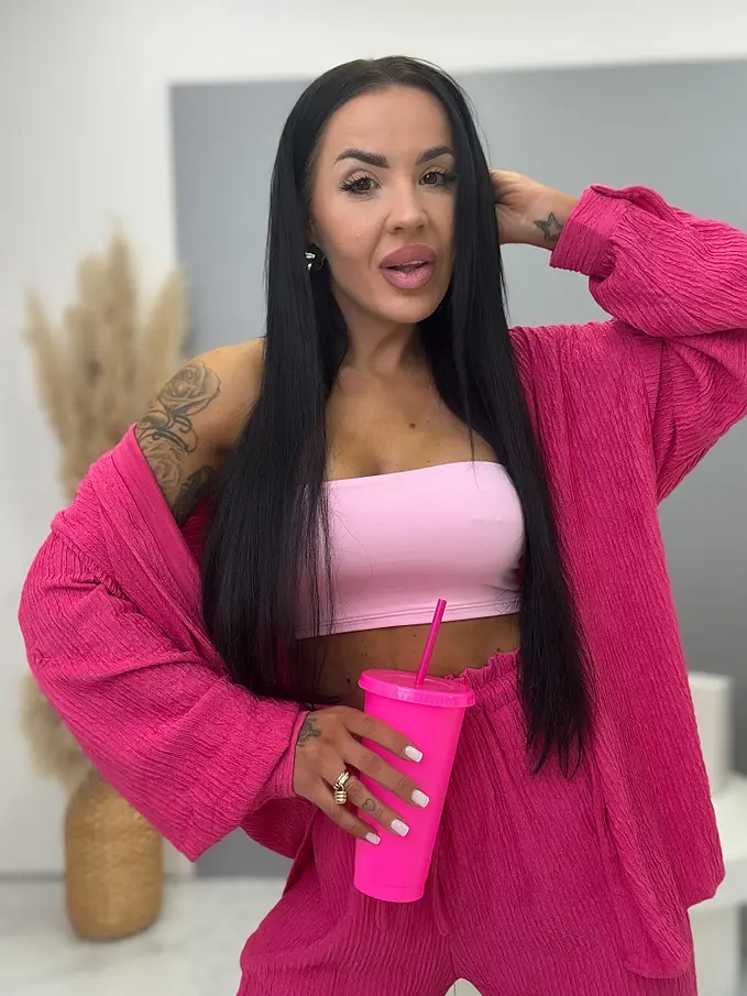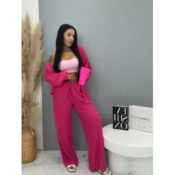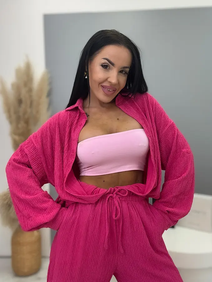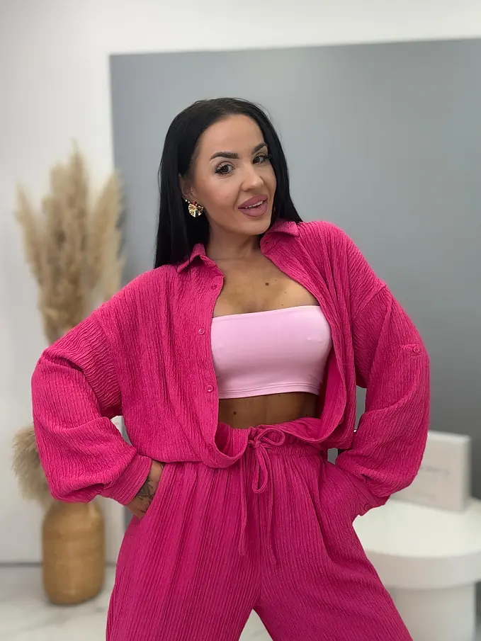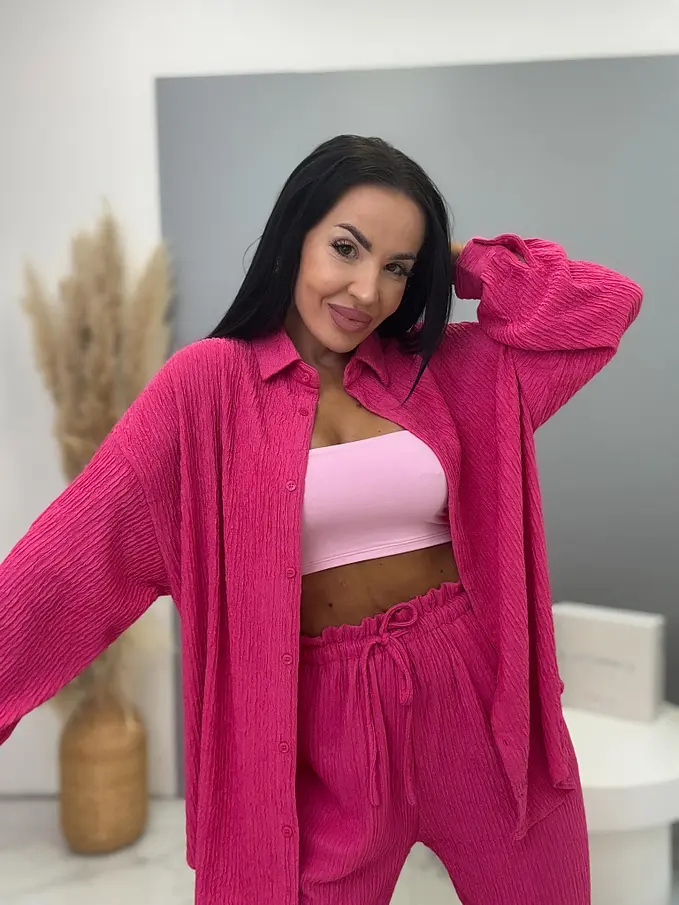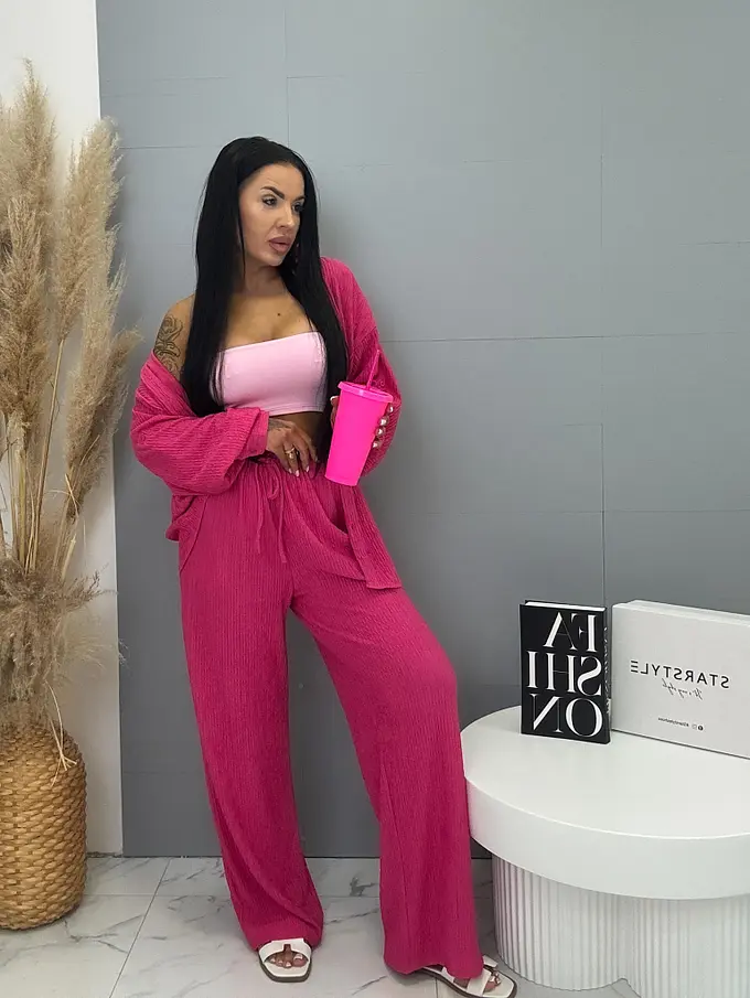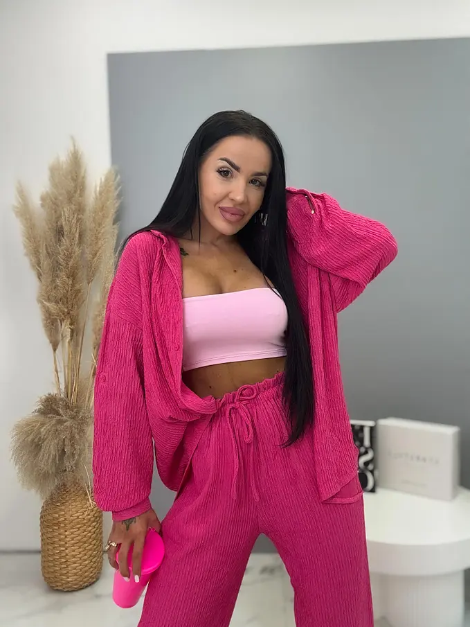 Prémium minőségű, rugalmas anyagú kétrészes szett, amely egyszerre kényelmes és elegáns választás a mindennapokra. A nadrág gumis derékrésszel készült, és megkötővel is ellátott, így tökéletesen igazodik az alakhoz és maximális komfortot biztosít. A hosszú ujjú felsőrész gombos záródással rendelkezik, letisztult és stílusos megjelenést adva a szettnek.
