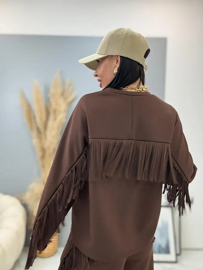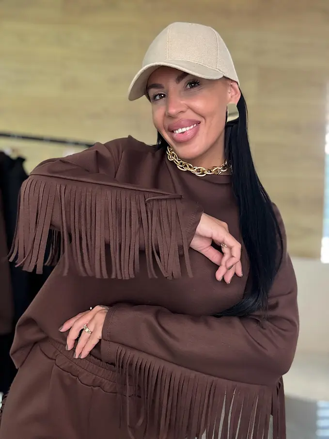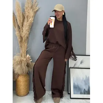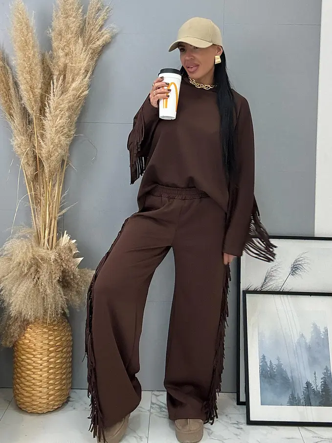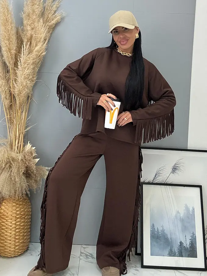 Női kétrészes szet a legújabb kollekcióból. Felsőből és nadrágból áll. Anyaga kellemes, rugalmas. A nadrág gumis derékkal.