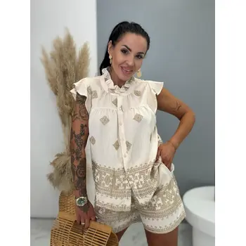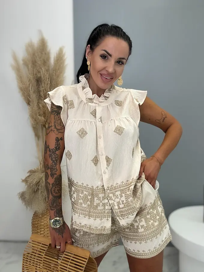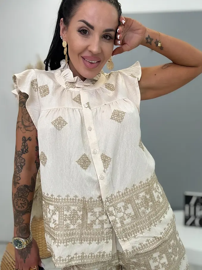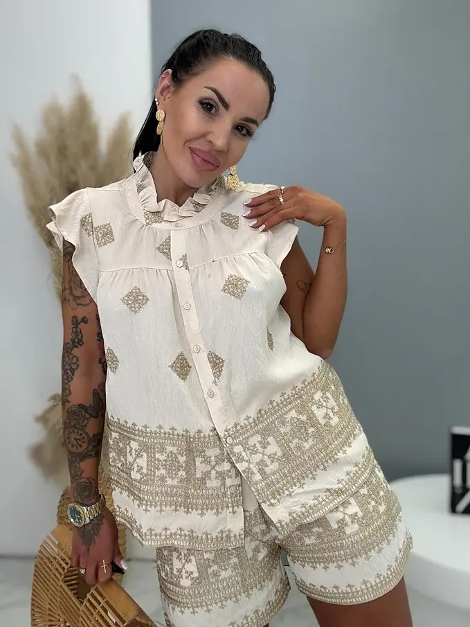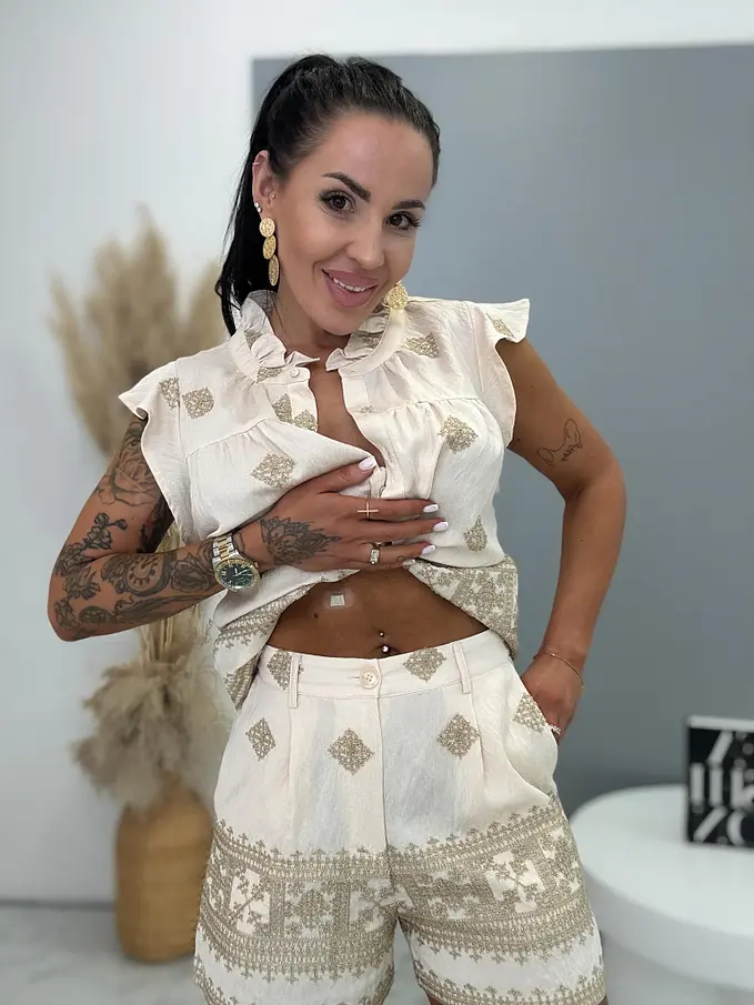 Prémium minőség. Női két részes farmer szett – rövid ujjú inggel és rövidnadrággal. Az anyag nem rugalmas. Az ing gombokkal záródik és csillogó mintával. A rövidnadrág csillogó mintával és praktikus, funkcionális zsebekkel valamint elasztikus derékkal rendelkezik.