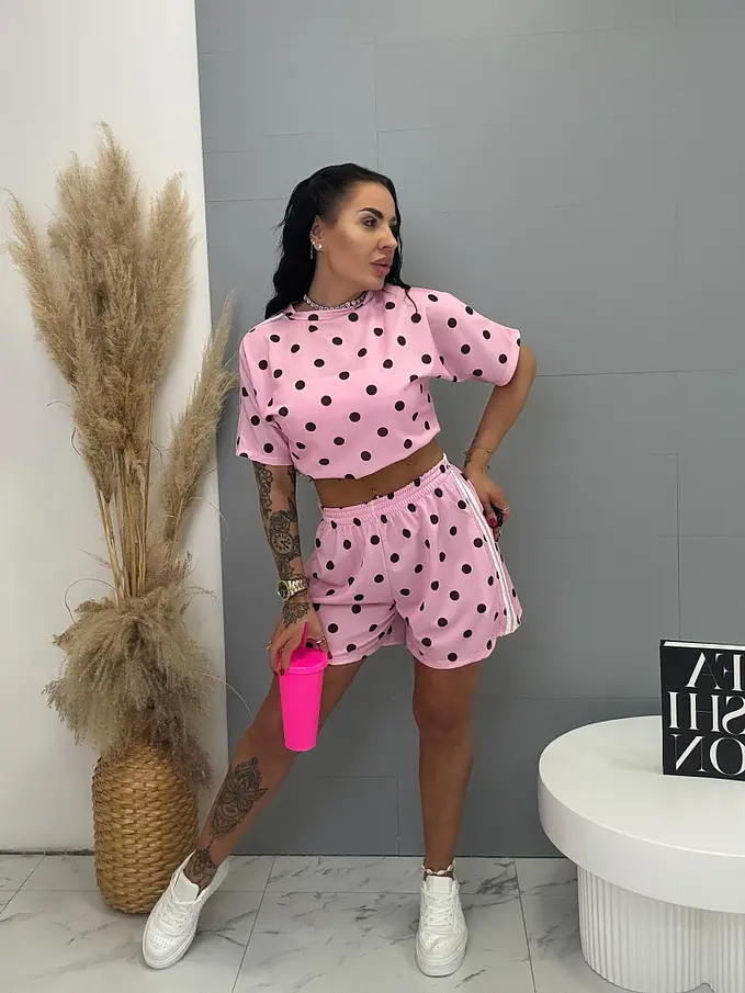 Női szett az új kollekcióból. Pólóból és rövidnadrágból áll. A nadrág gumis derékkal és oldalsó zsebekkel. Az anyag kellemes viseletű, elasztikus.