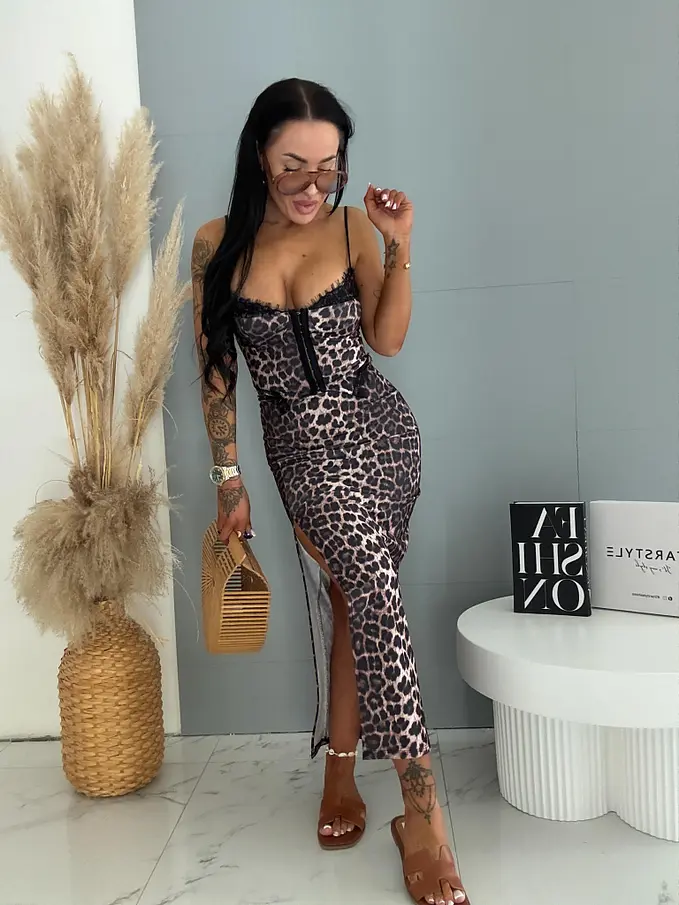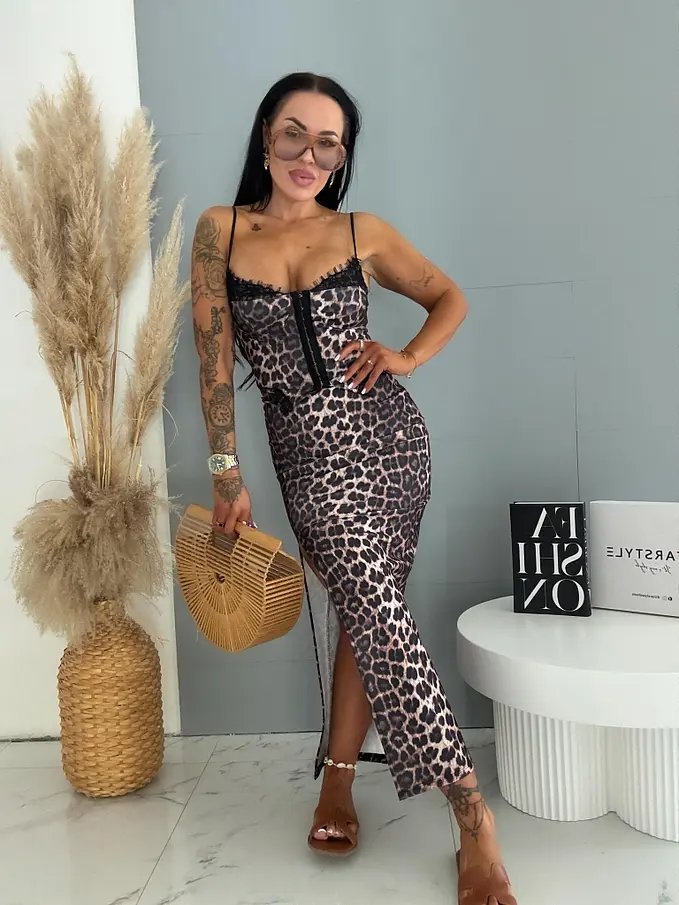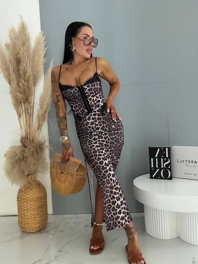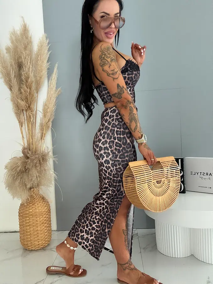 Leopárdmintás kétrészes szett modern nőknek: crop top és szoknya. Kellemes, rugalmas anyagból készült. A crop top patentos záródású, állítható pántokkal és párnázással. A szoknya gumis derékkal, hátul cipzárral és elegáns oldalsliccel.