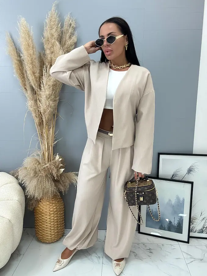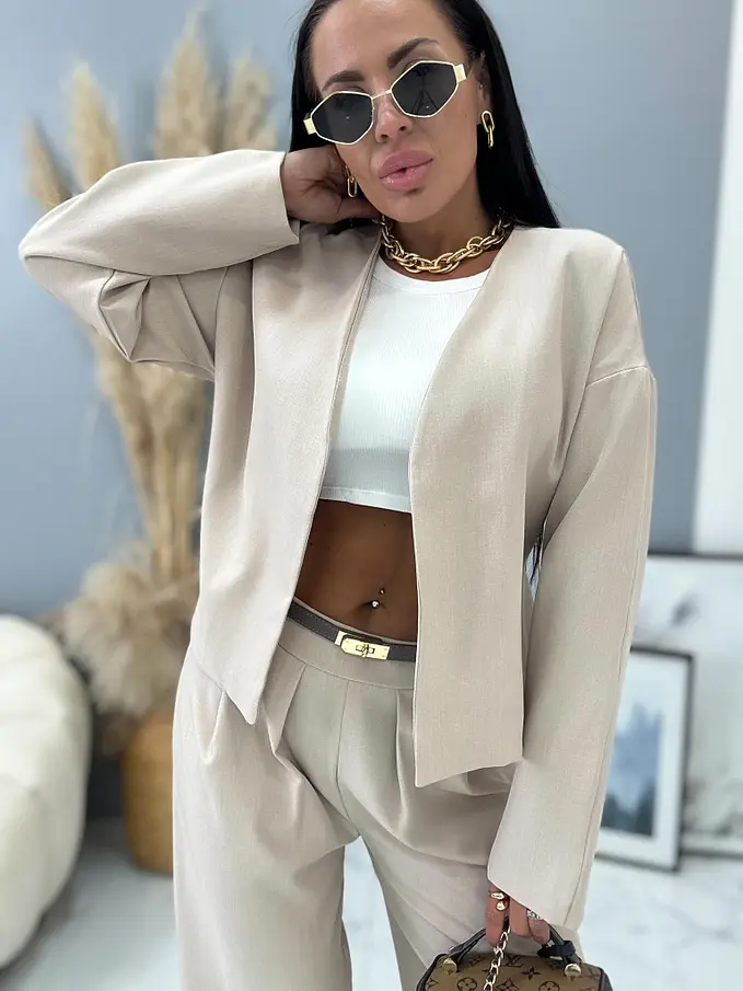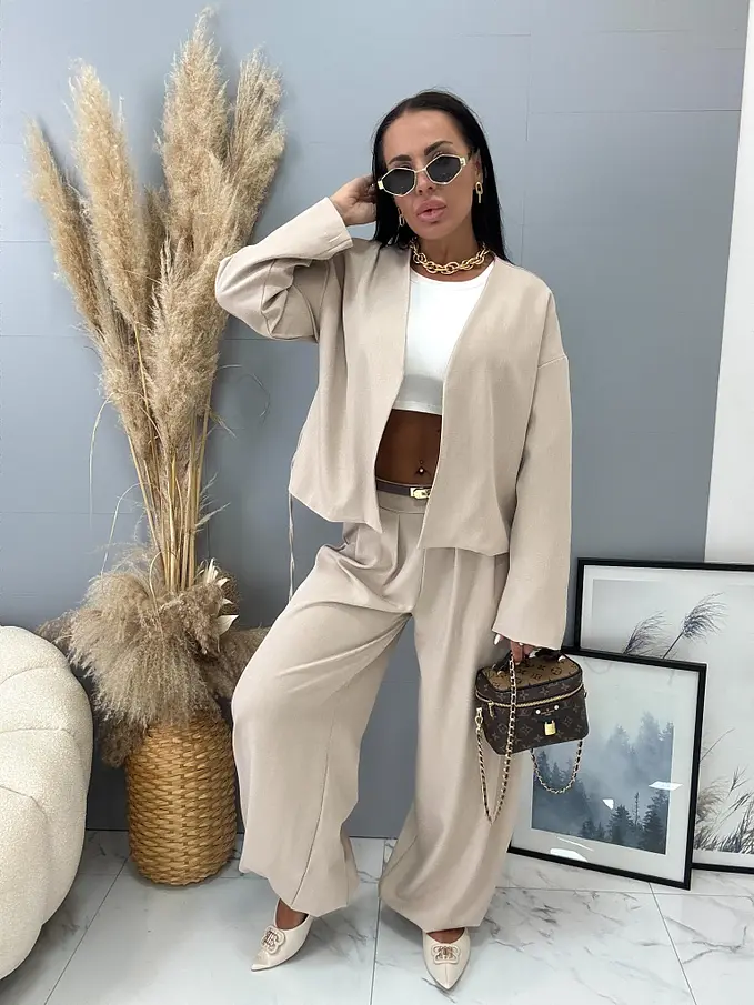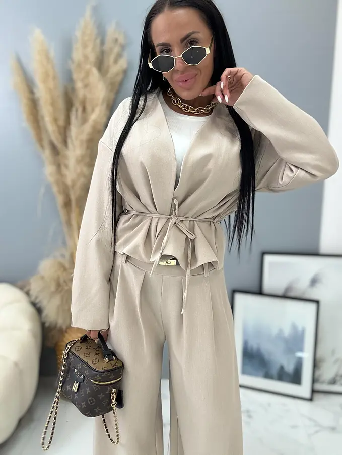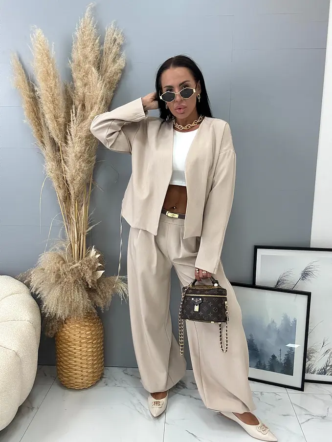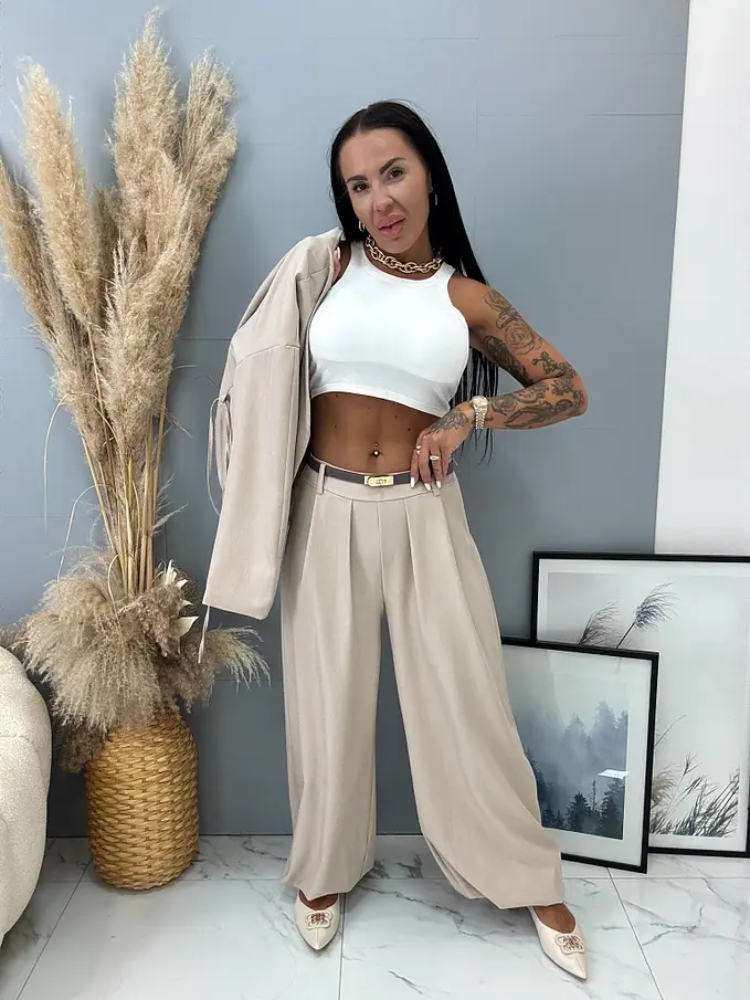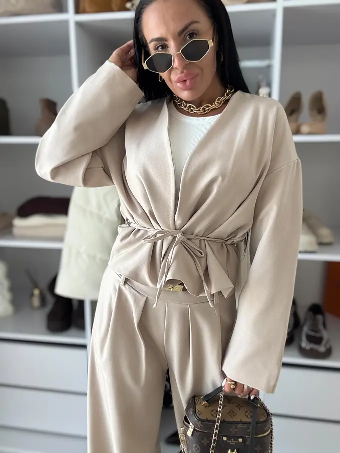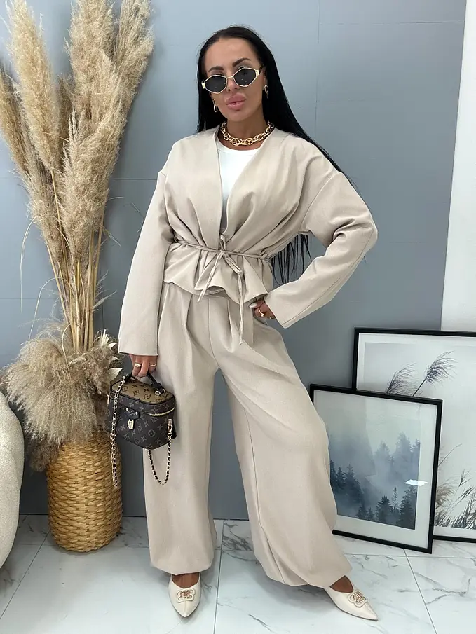 Női kétrészes szet a legújabb kollekcióból. Felsőből és nadrágból áll. Anyaga kellemes, rugalmas. A nadrág gumis derékkal.