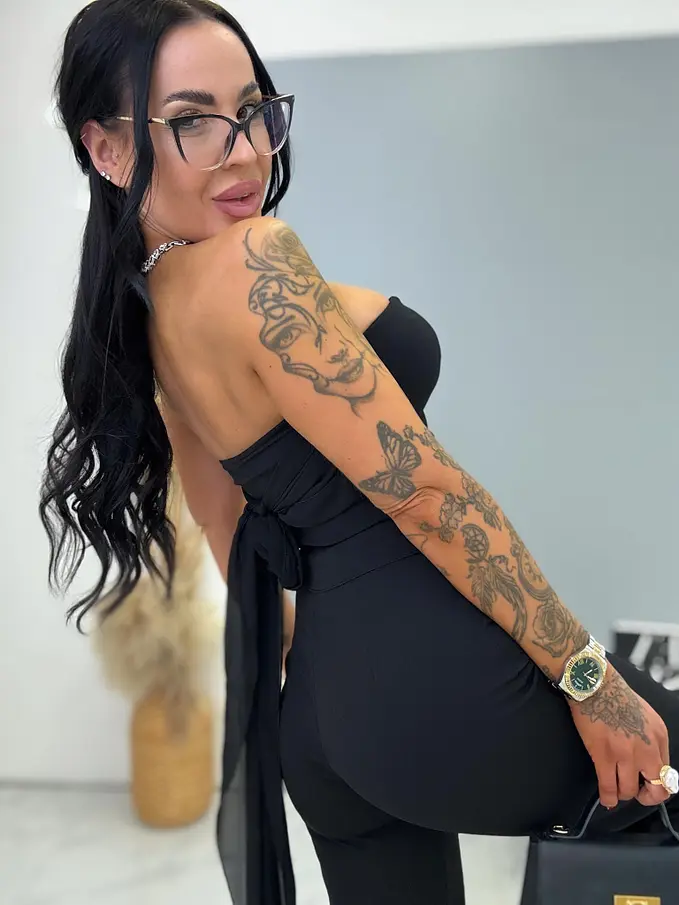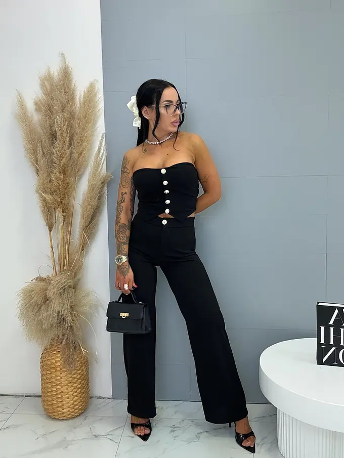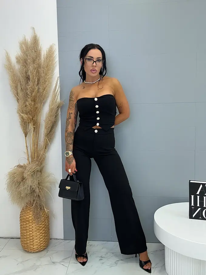 Kétrészes szett az új kollekcióból, közvetlenül Olaszországból. A szett crop topból és nadrágból áll. Az anyag kellemes és rugalmas. A párnázott crop top megkötős, és aranyozott gombok díszítik.