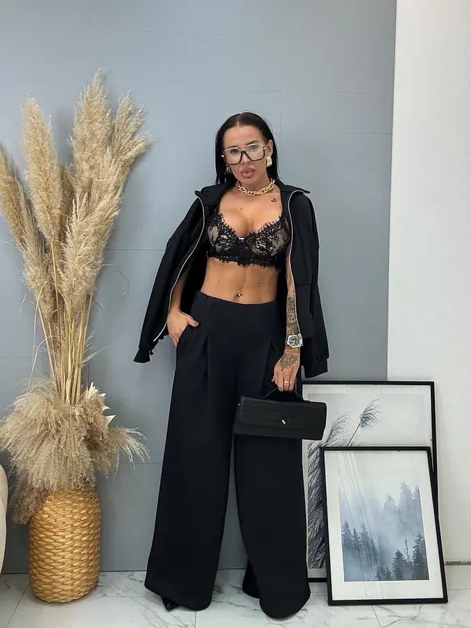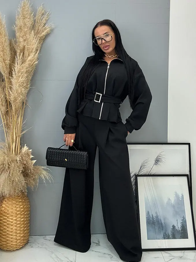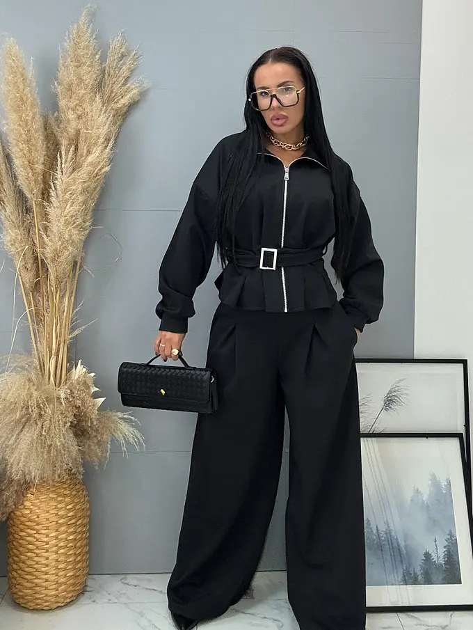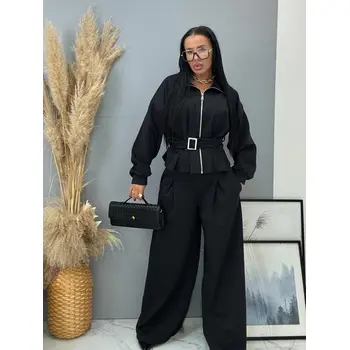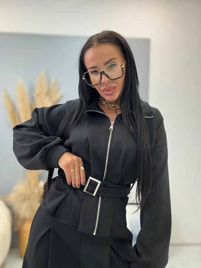 Női kétrészes szett a legújabb kollekcióból. A szett egy cipzárral záródó, öves felsőből és nadrágból áll. Anyaga kellemes, rugalmas. A nadrág gumis derékkal. A csat és cipzár ezüst színű.