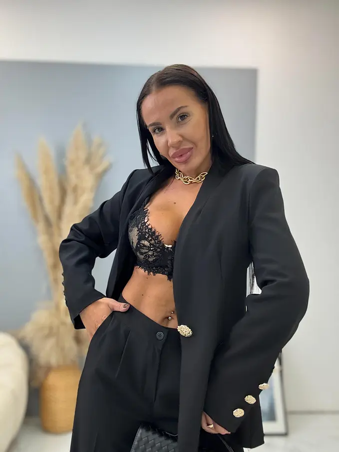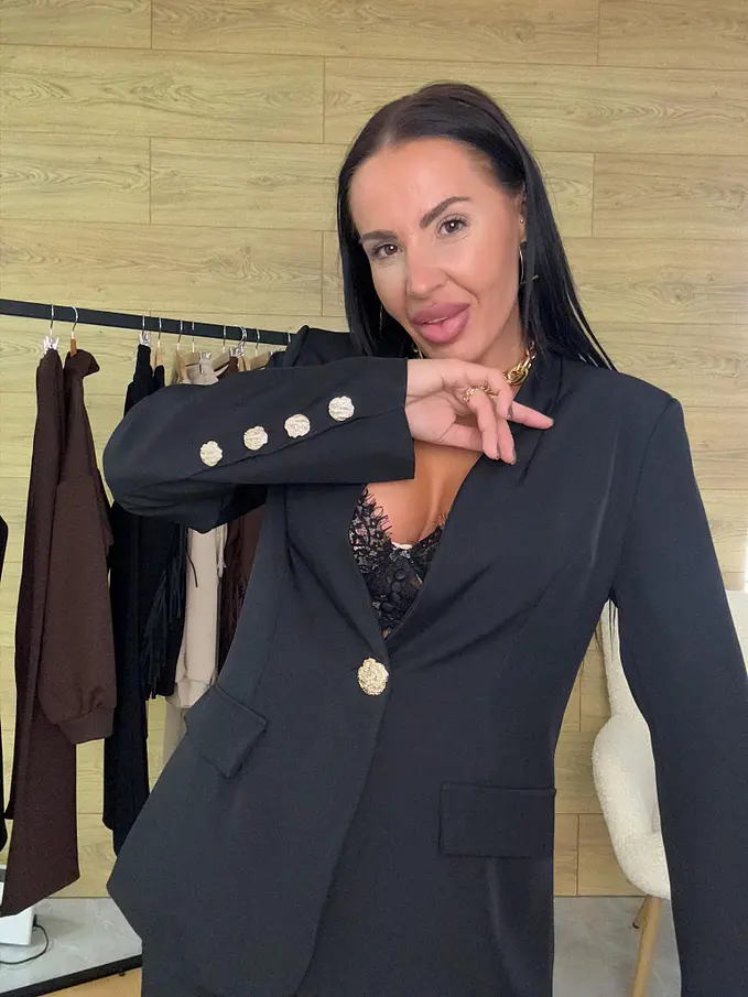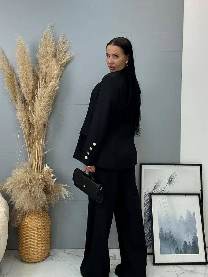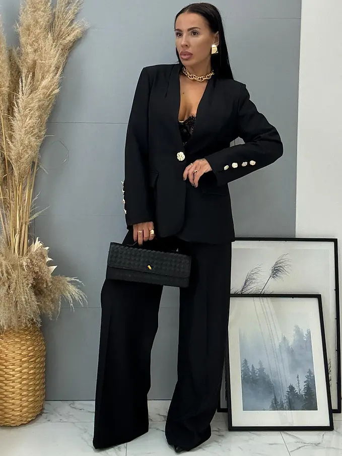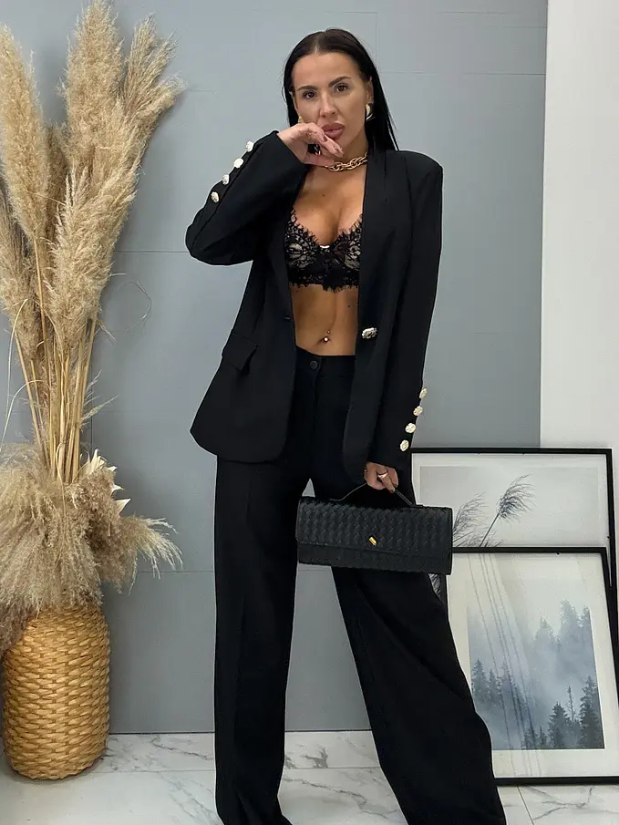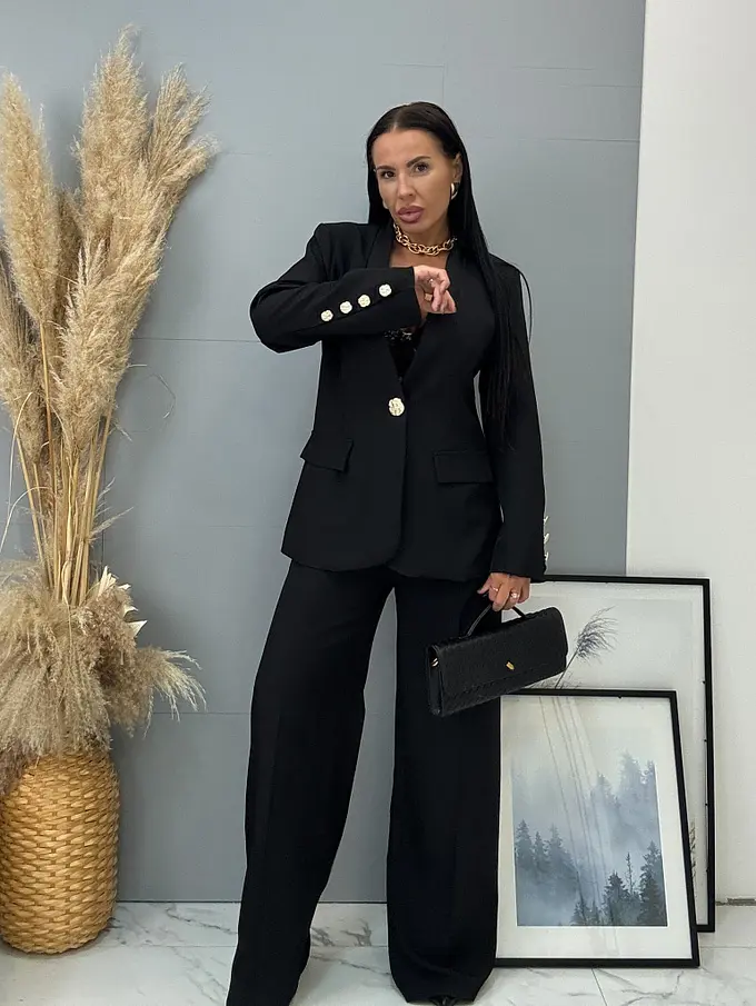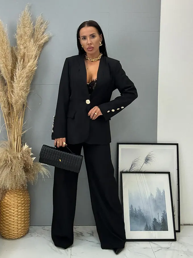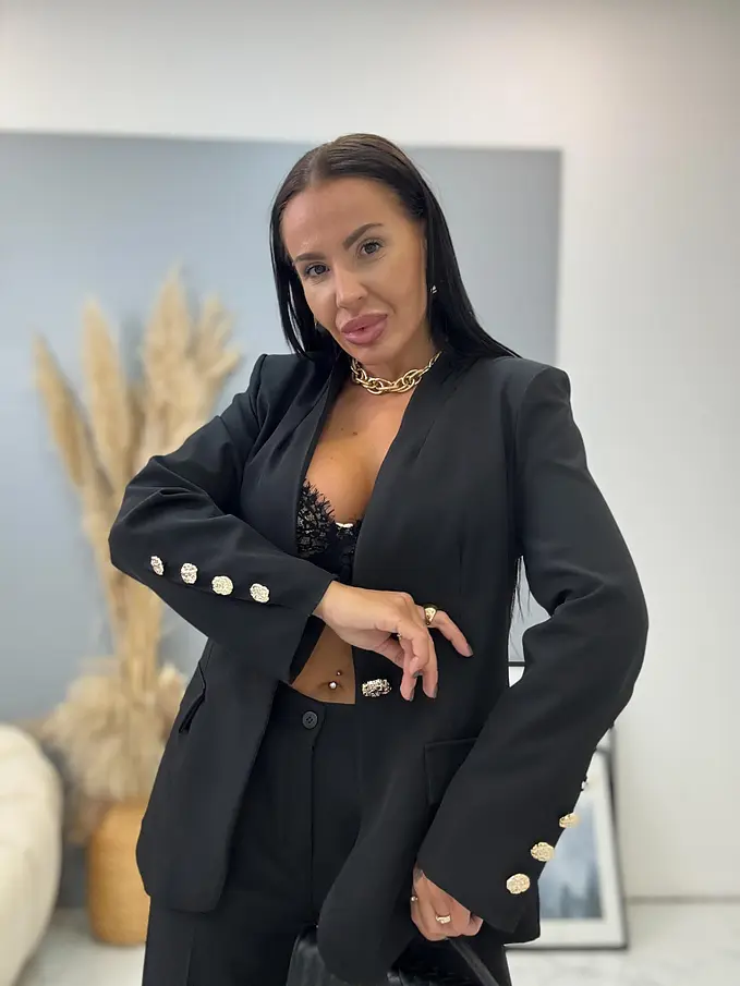 Női kétrészes szett a legújabb kollekcióból. A szett zakóból és nadrágból áll. Anyaga kellemes, nem rugalmas. A nadrág gumis derékkal és oldalsó zsebekkel. A zakó klasszikus szabású és egy aranyozott gombbal záródik.