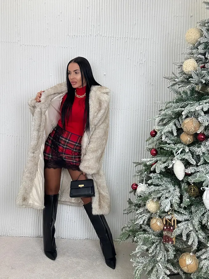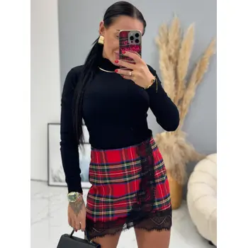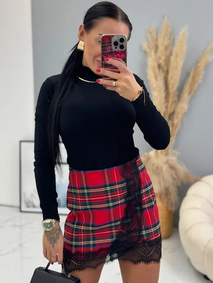 Stílusos kockás szoknya elegáns csipkés díszítéssel. Cipzárral a hátulján.