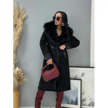 Kombinált kabát nem levehető szőrmés díszítéssel a galléron. Szőrmés béléssel. A részletek arany színűek. Oldalsó zsebekkel.