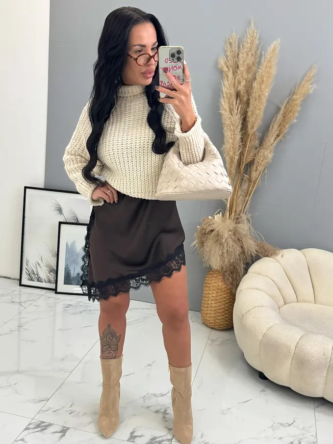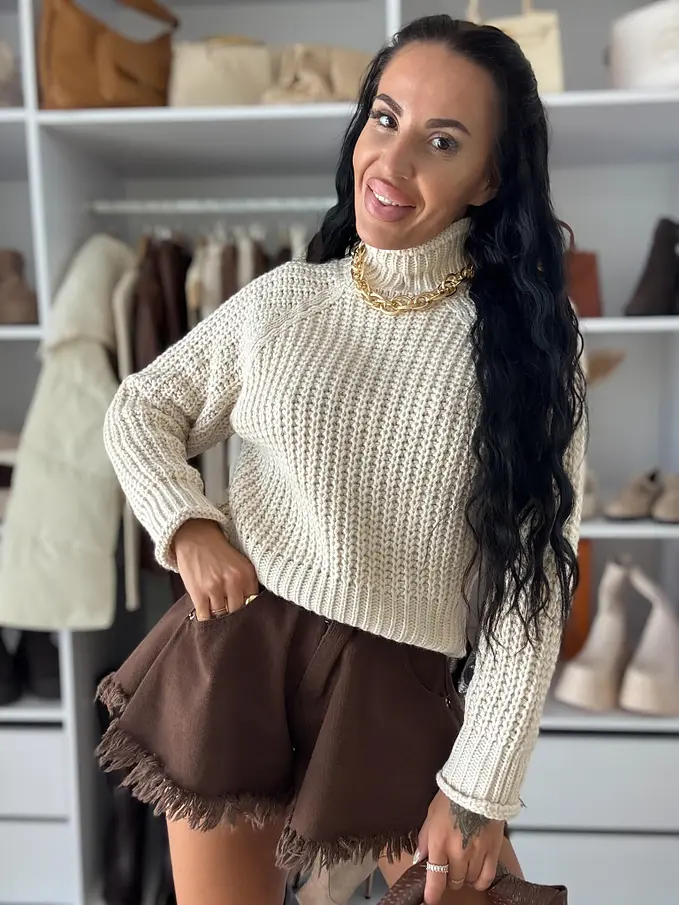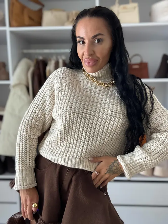 A fekete hajú modell 164 cm magas és 64 kg. M/L méretű ruhákat visel. Méretek: 99 cm - 74 cm - 93 cm.
