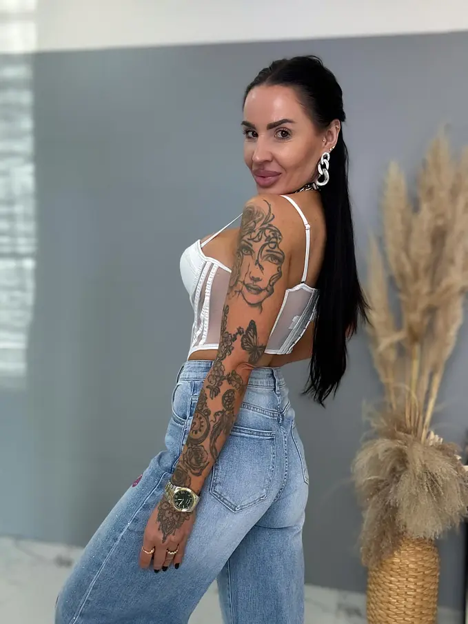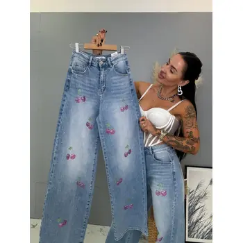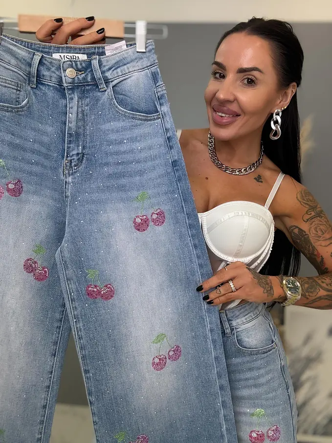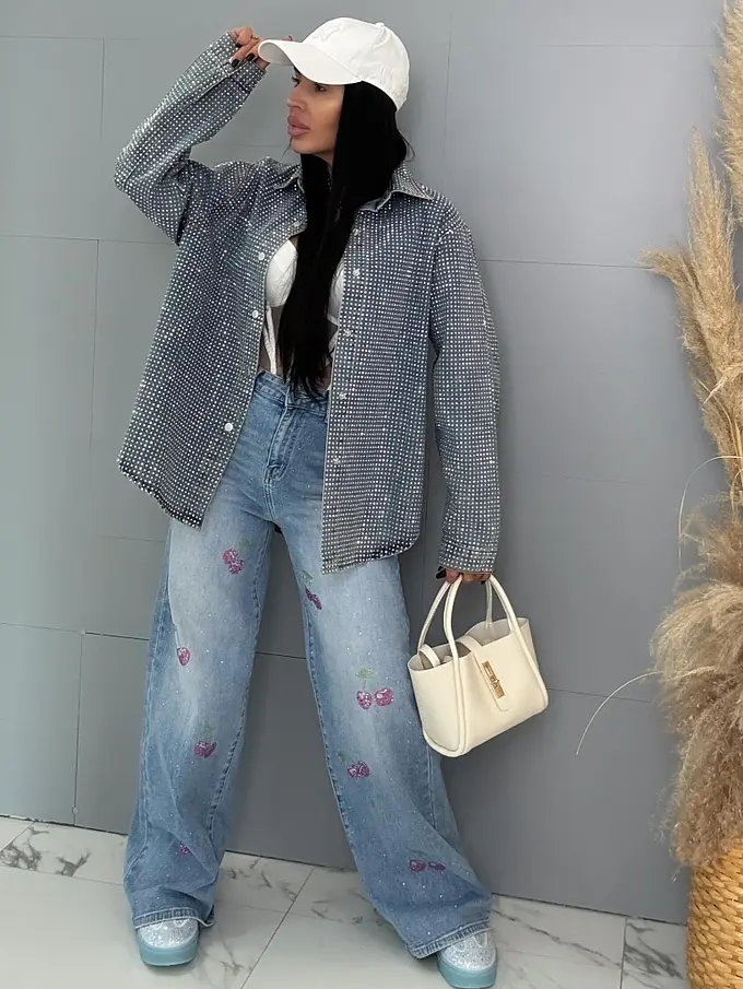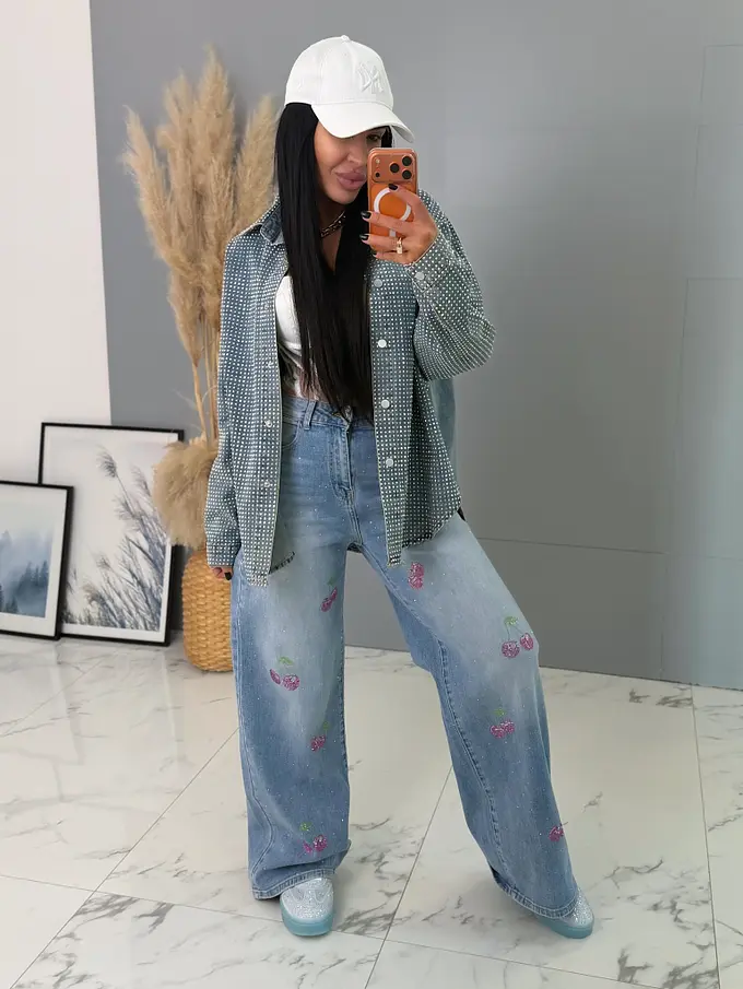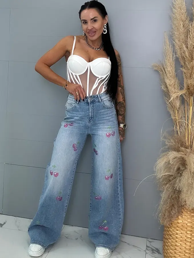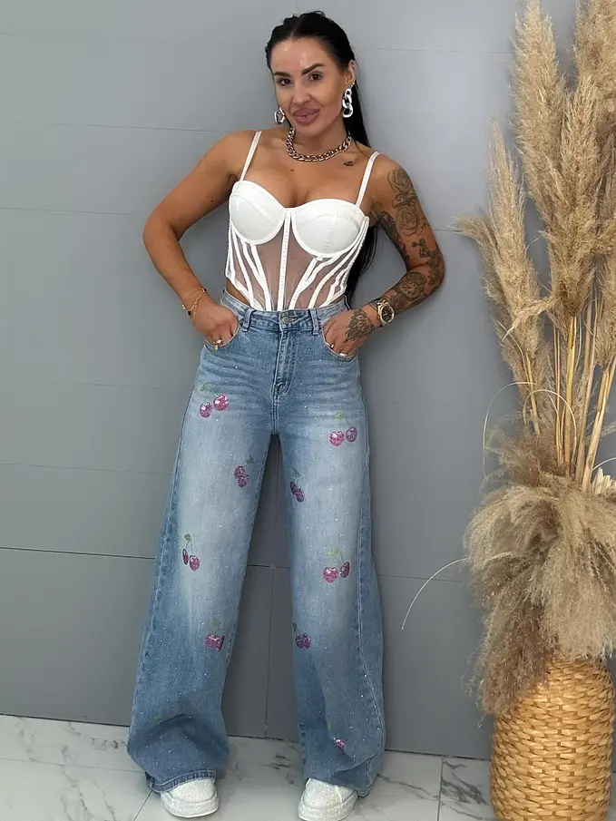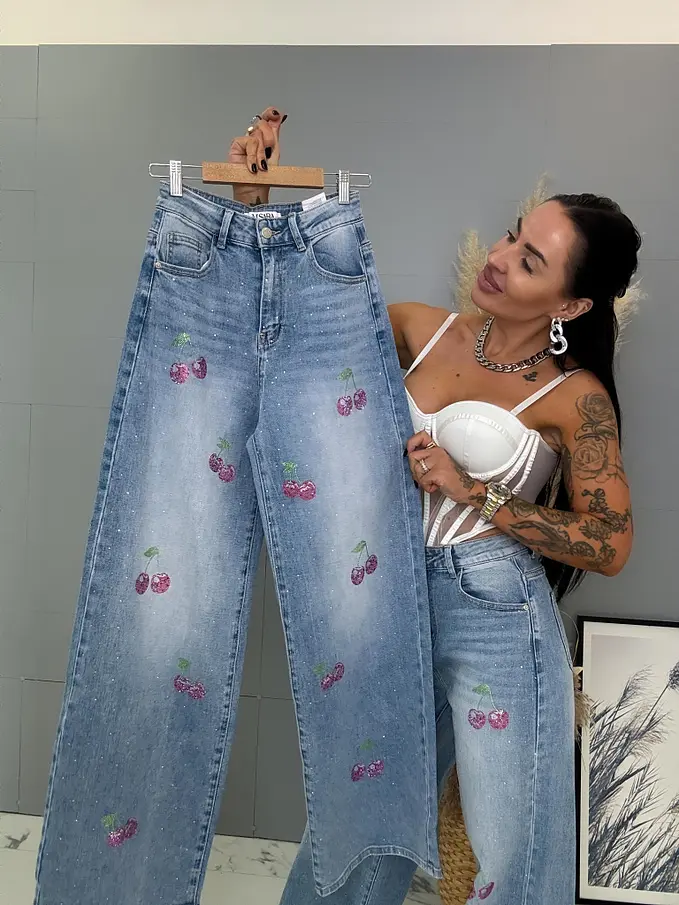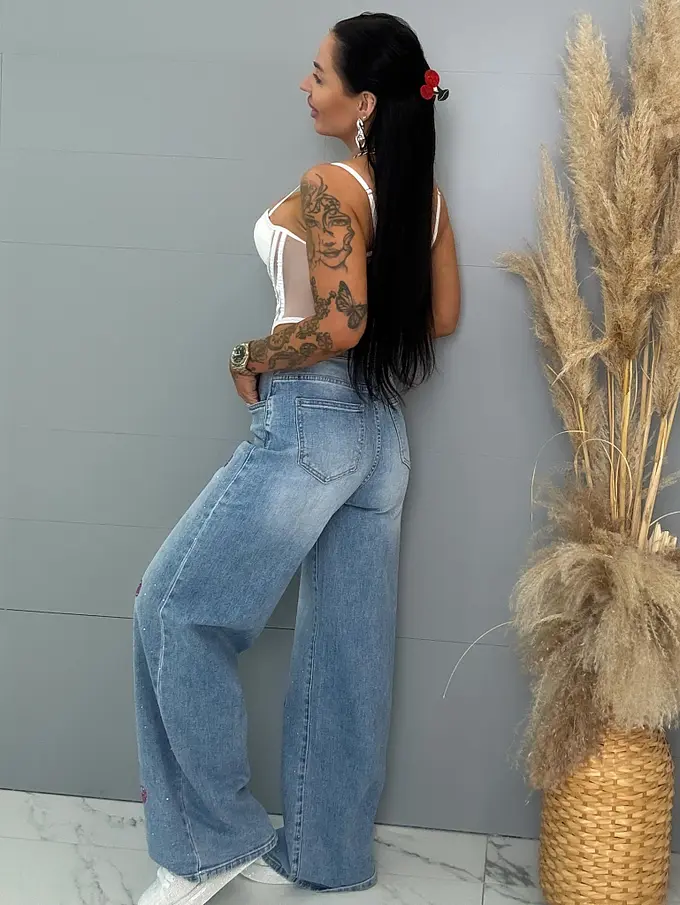 Kövecskékkel díszített magas derekú palazzo farmer