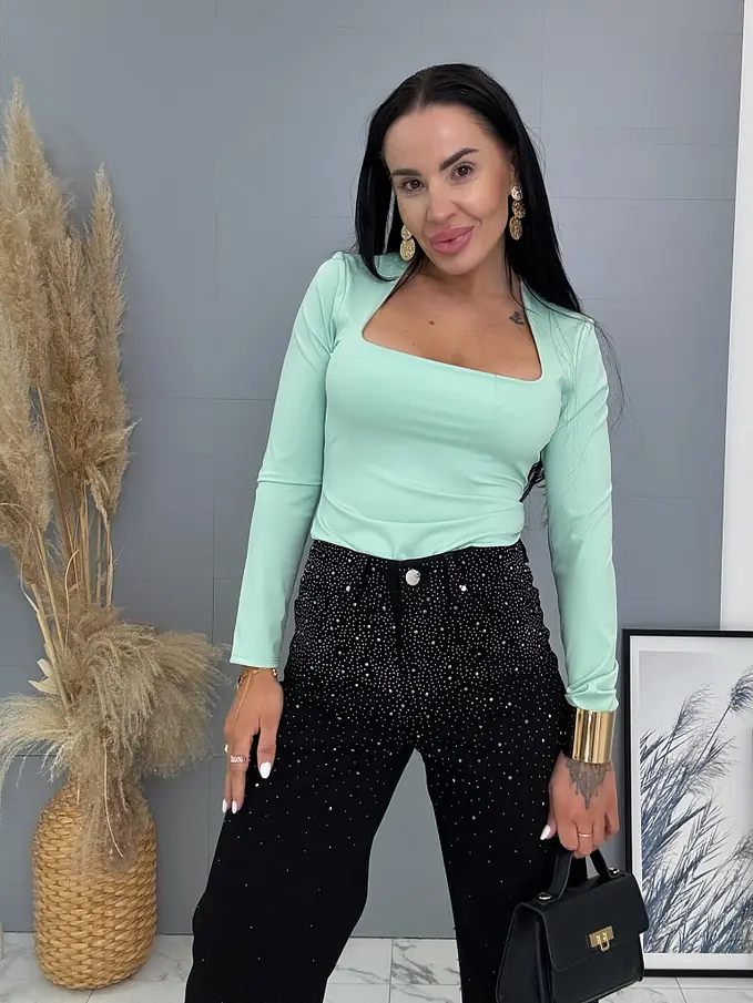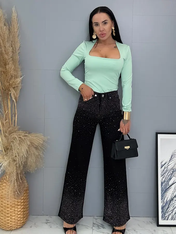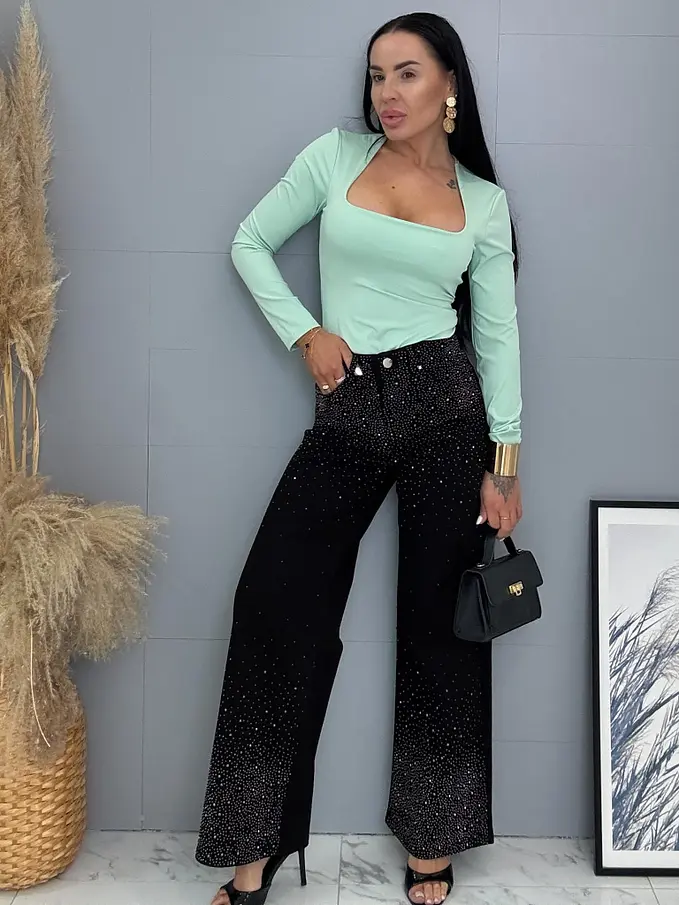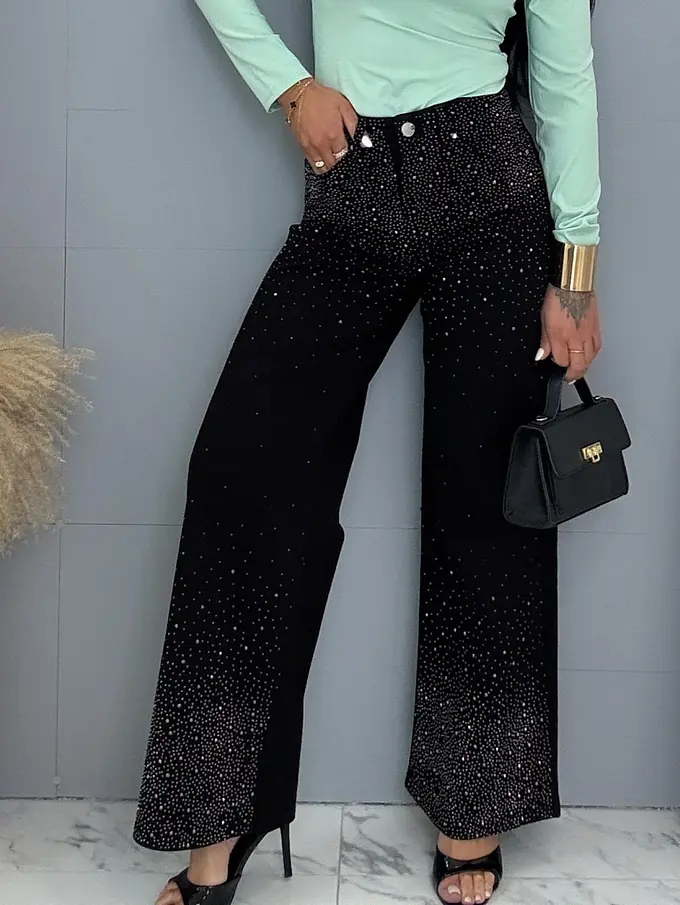 Kövecskékkel díszített magas derekú wide leg farmer