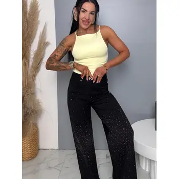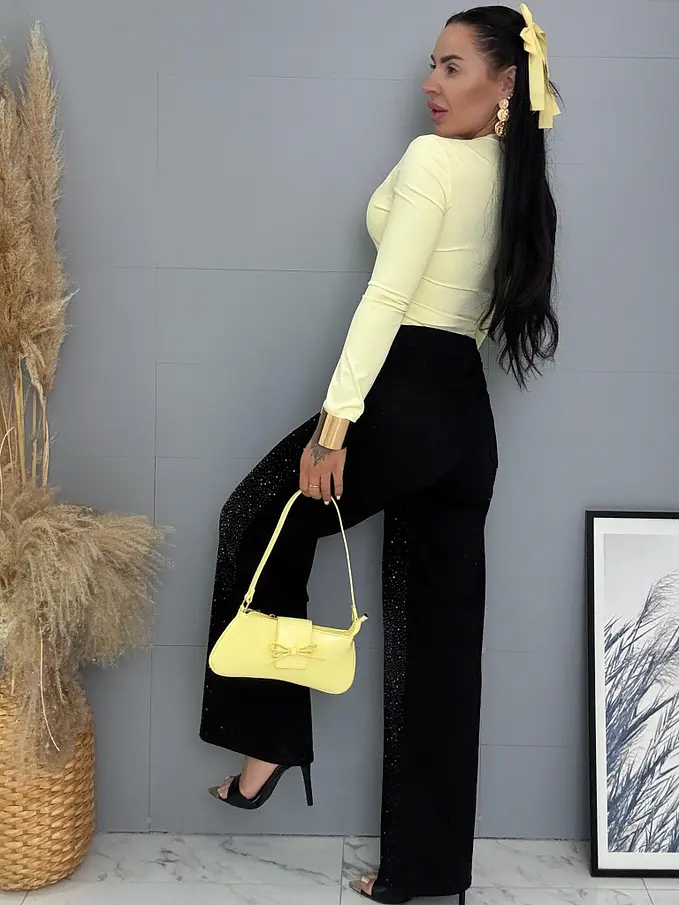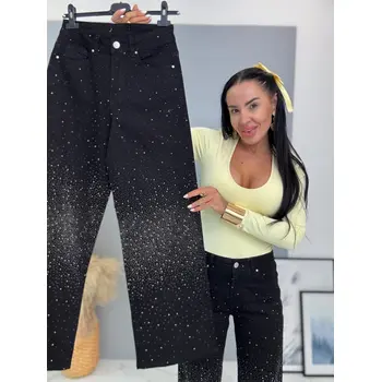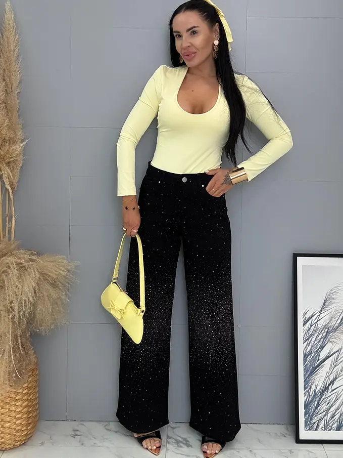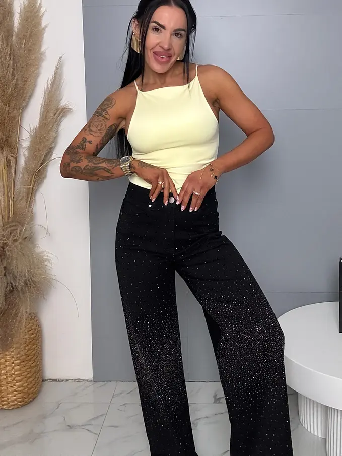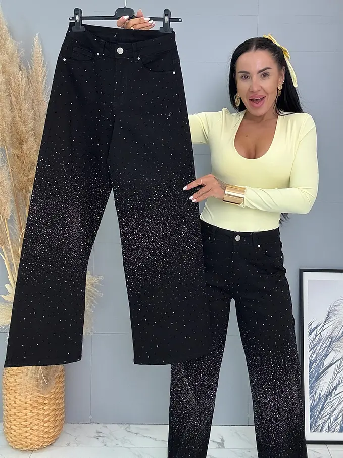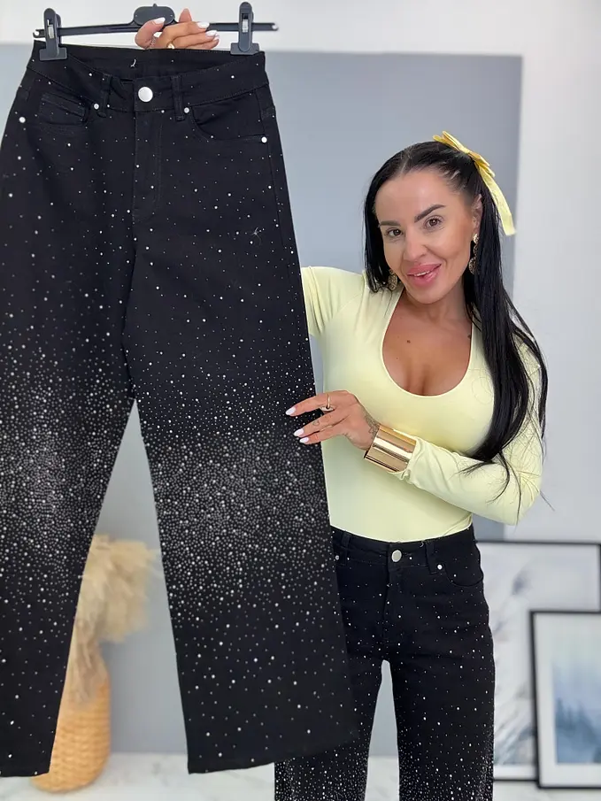 Kövecskékkel díszített magas derekú wide leg farmer
