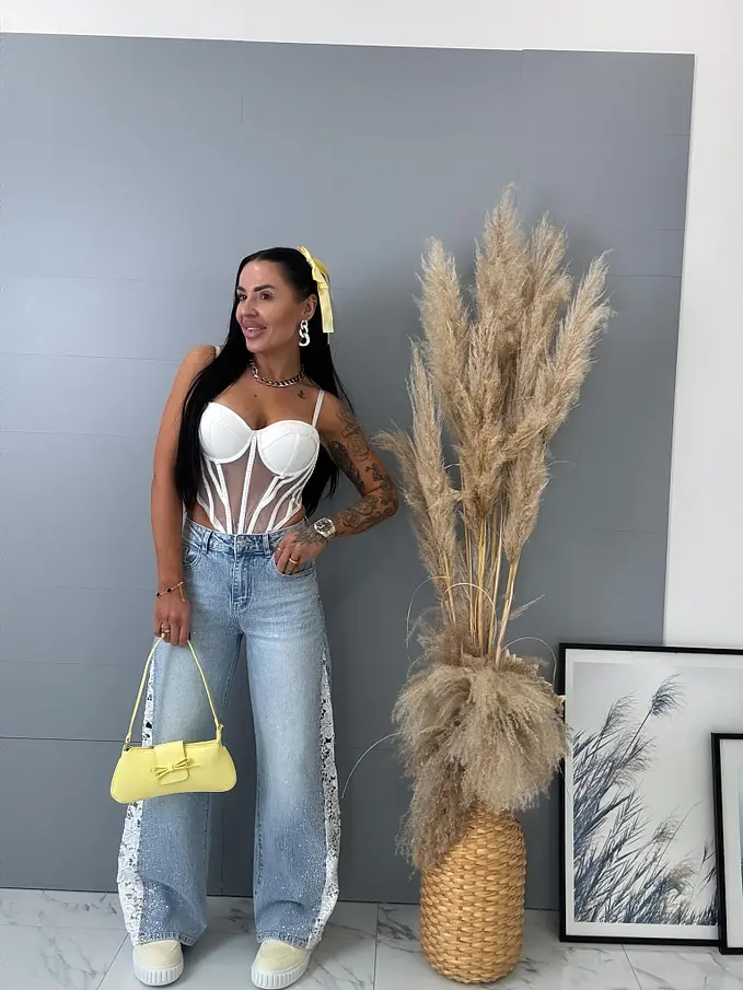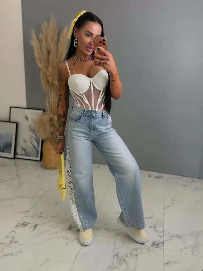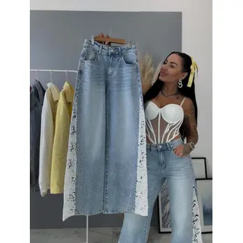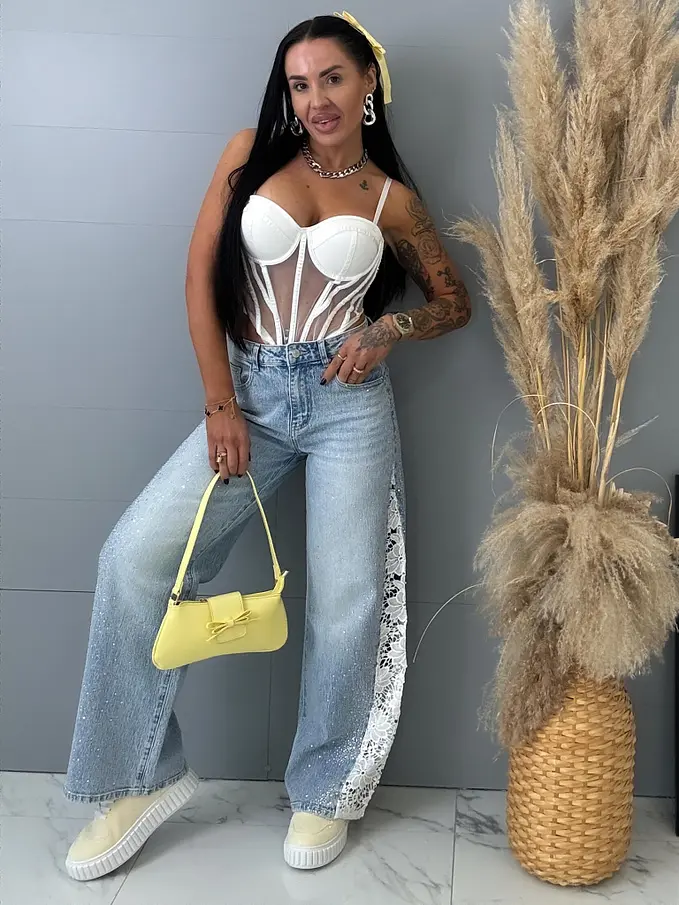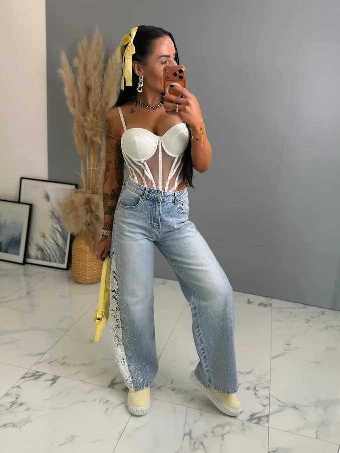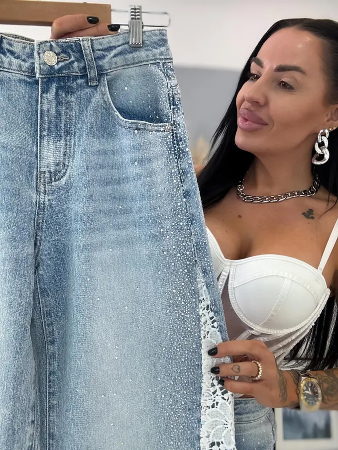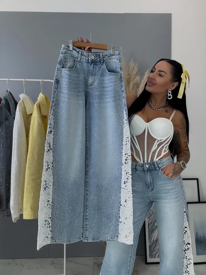 Kövecskékkel és csipkével díszített magas derekú wide leg farmer