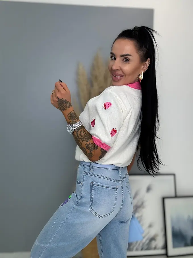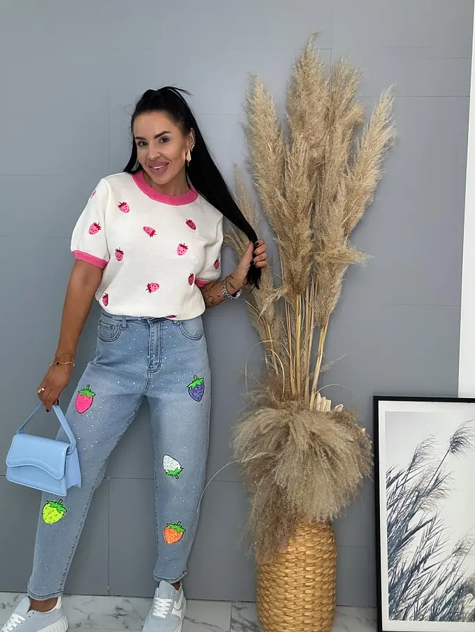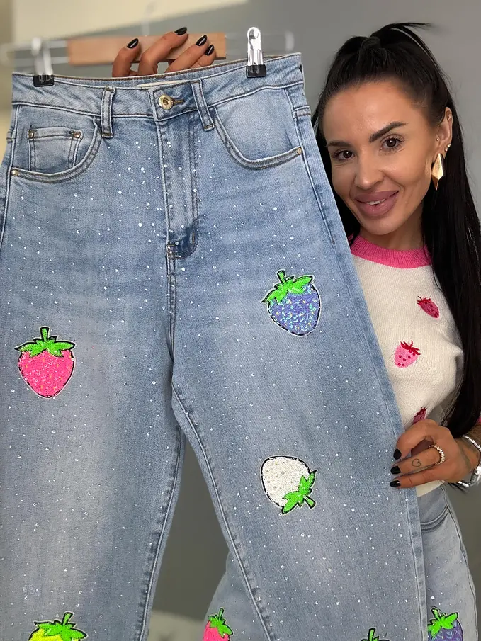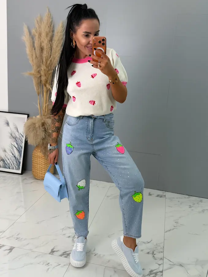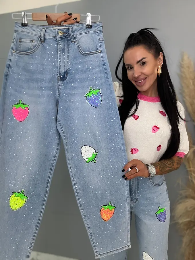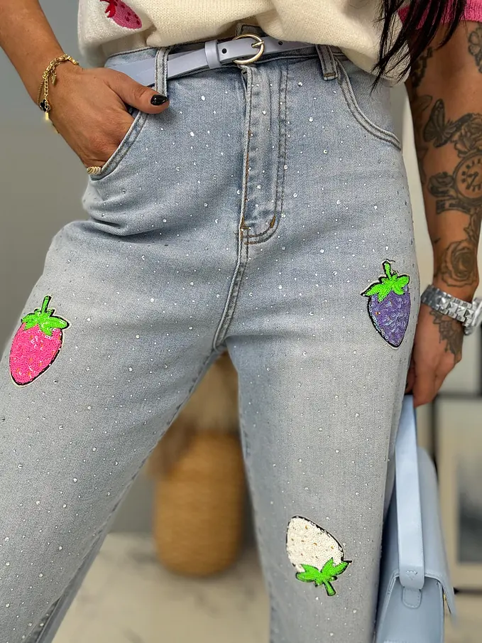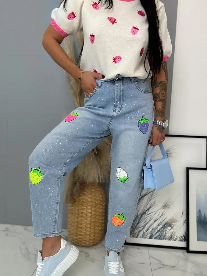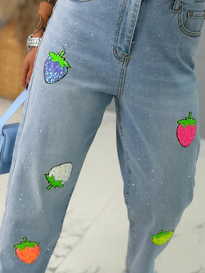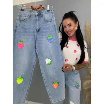 Kövecskékkel és flitterekkel díszített magas derekú mom fit farmer