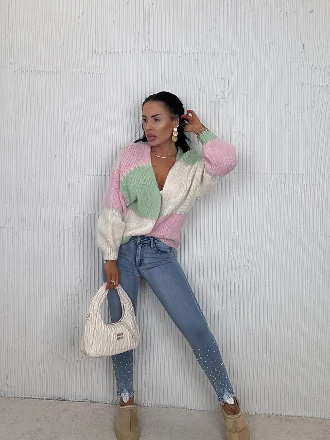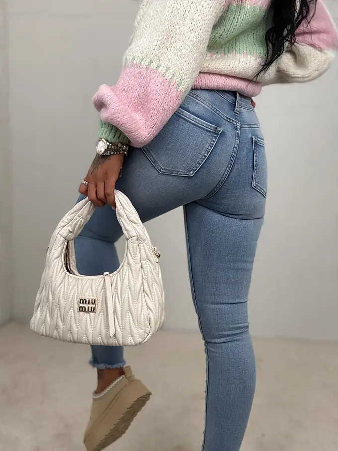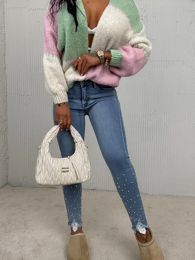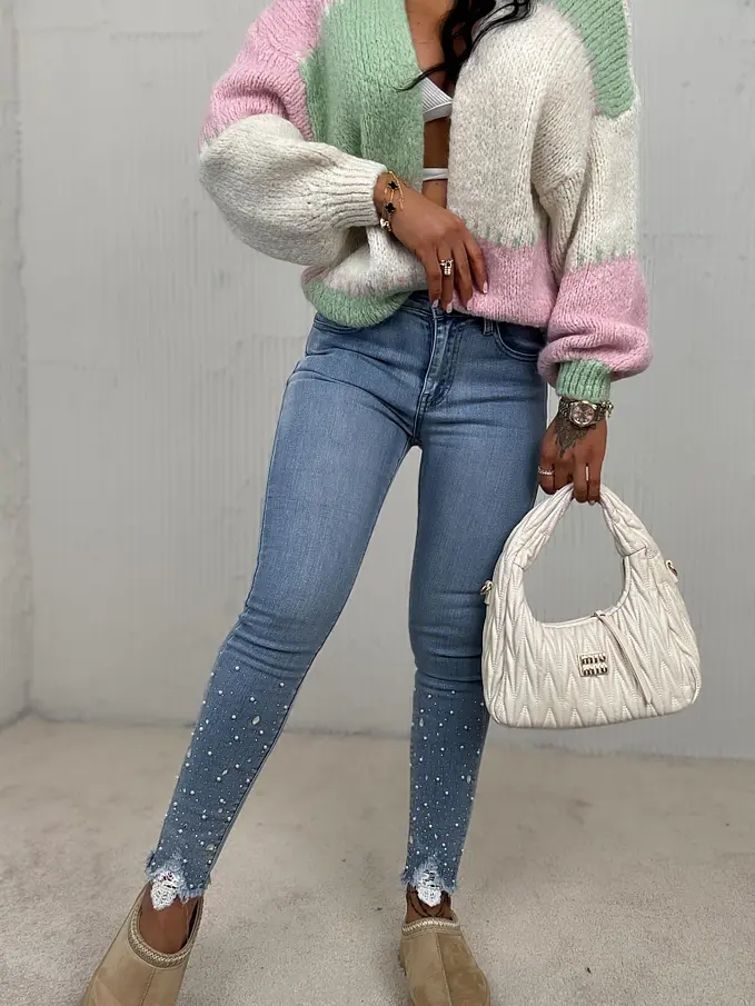 Kövecskékkel és gyöngyökkel díszített magas derekú skinny farmer