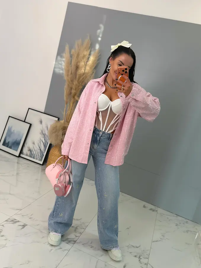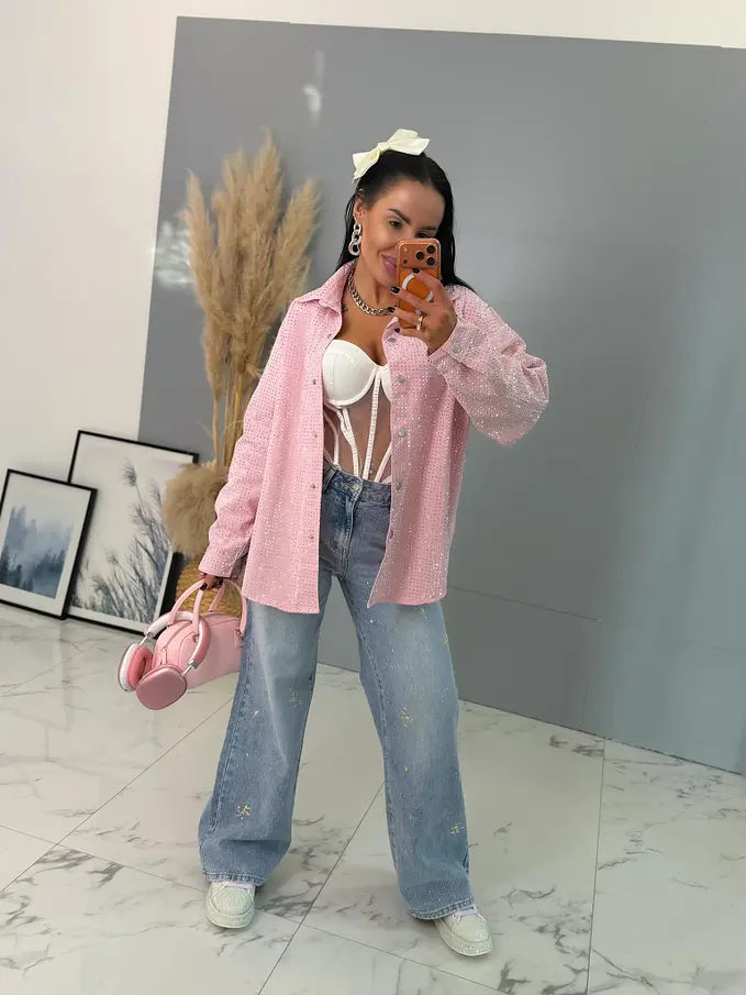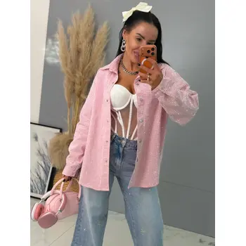 Gombos ing, strasszkövekkel díszített. Anyaga nem elasztikus. A kapcsok ezüst színűek.