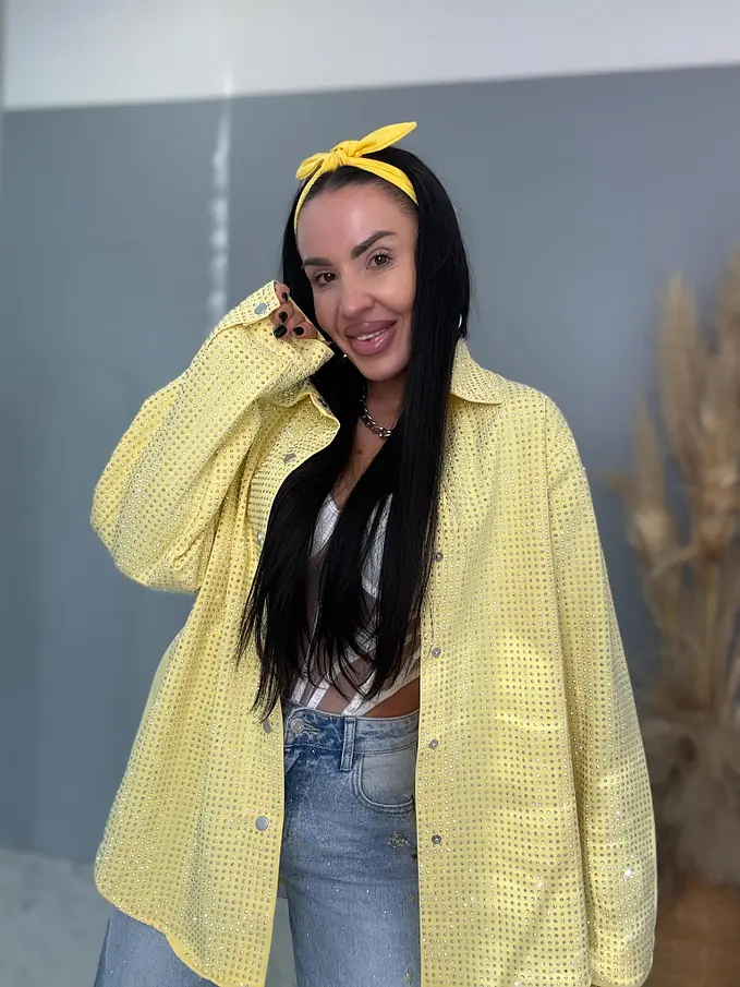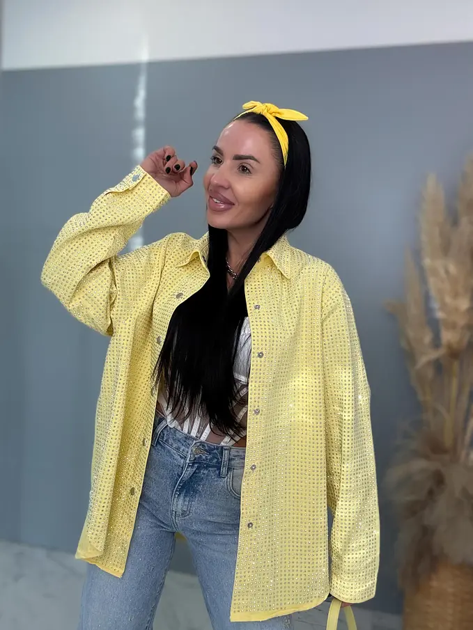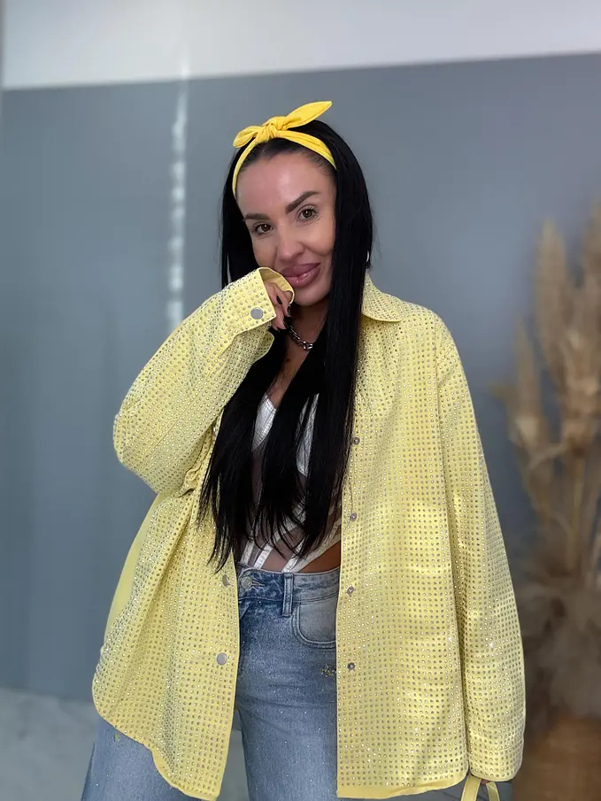 Gombos ing, strasszkövekkel díszített. Anyaga nem elasztikus. A kapcsok ezüst színűek.