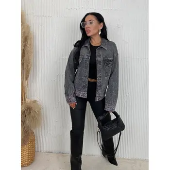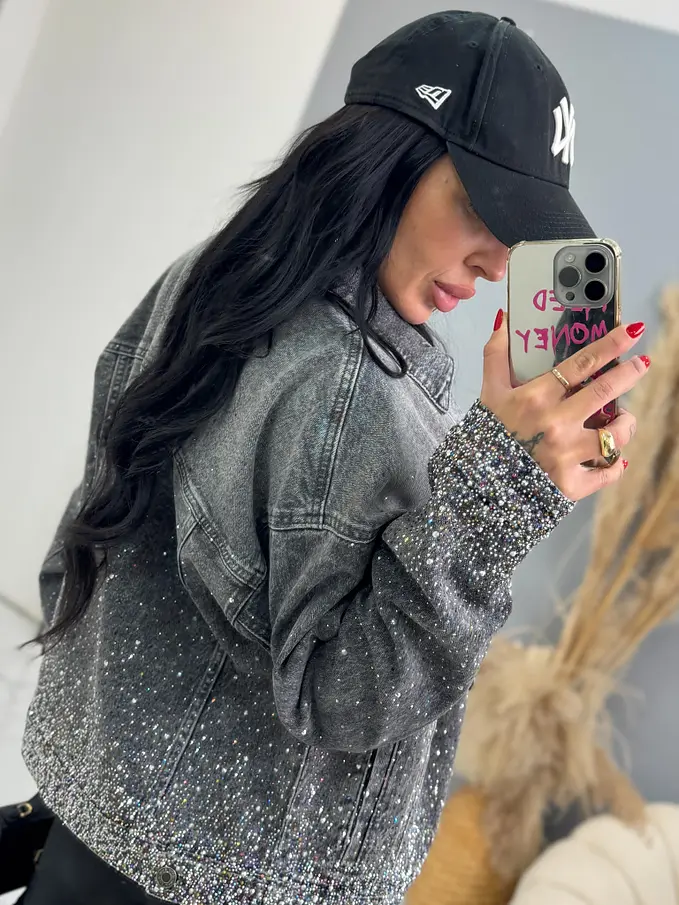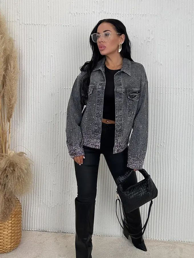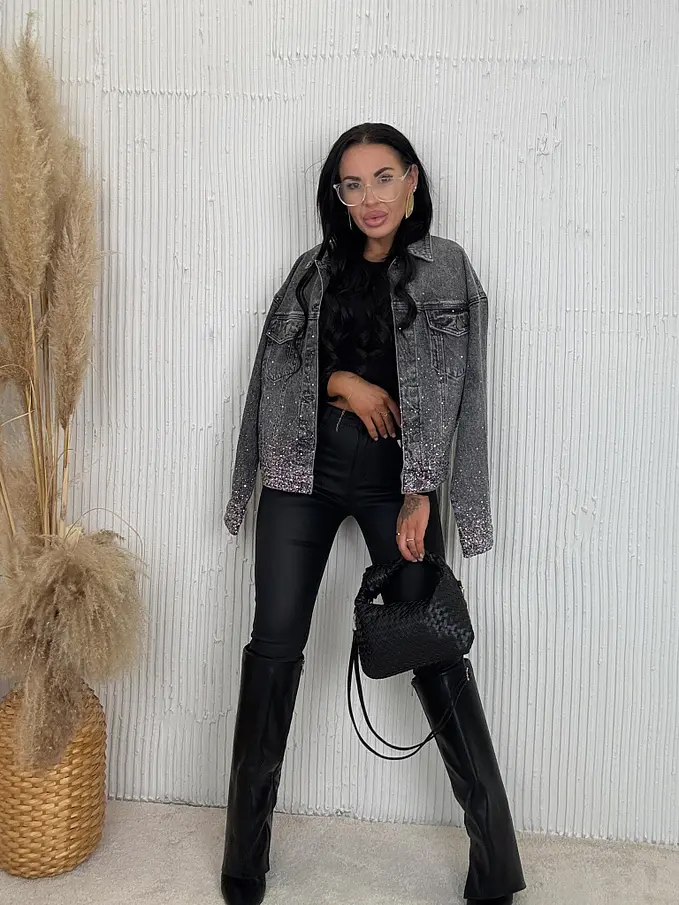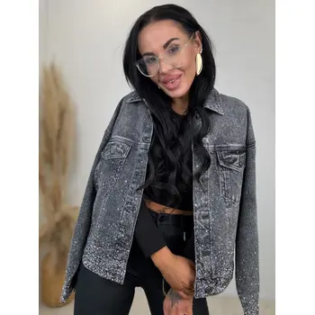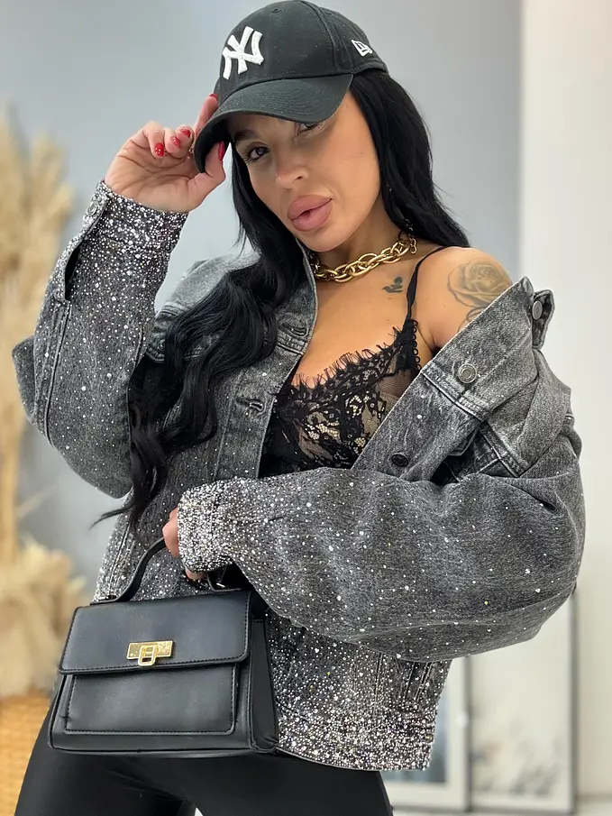 Gombos kabátka, strasszkövekkel díszített. Anyaga kellemes, elasztikus. A gombok ezüst színűek.