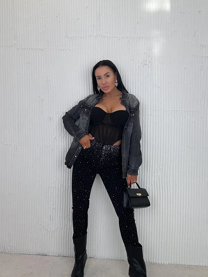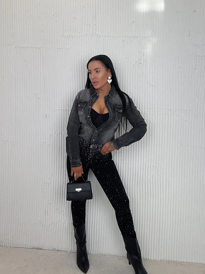 Prémium minőség. Az anyag csak minimálisan rugalmas. Magas derék. Kövekkel díszített. A gomb ezüst színű.